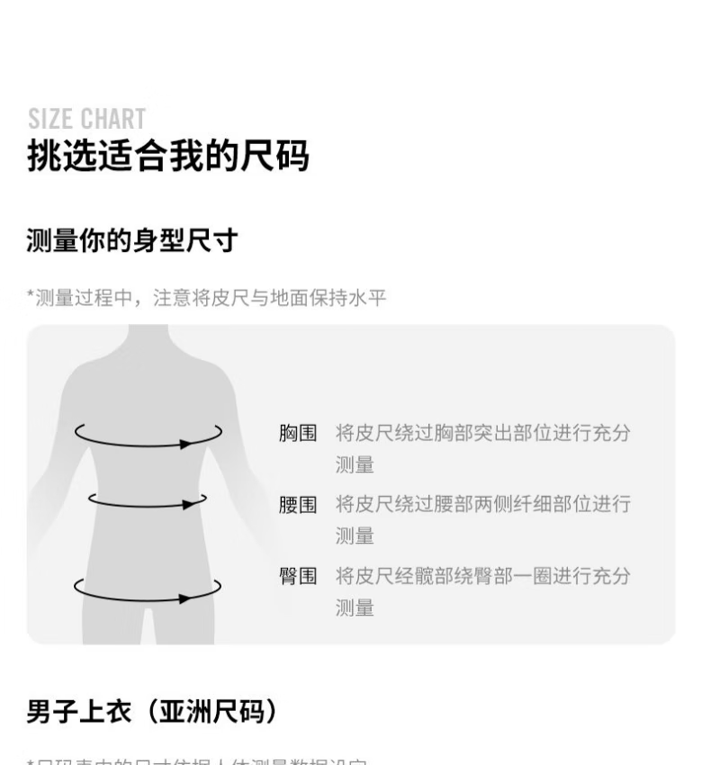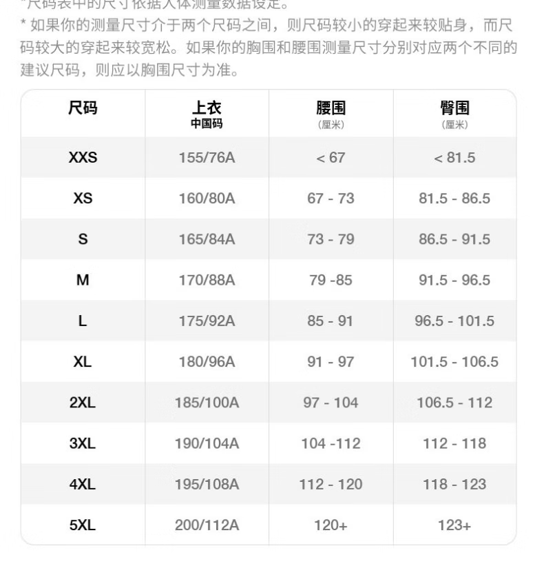 China (cm) 160-165/84-86 165-170 / 88-90 167-172 / 92-96 168-173 / 98-102 170-176 / 106-110