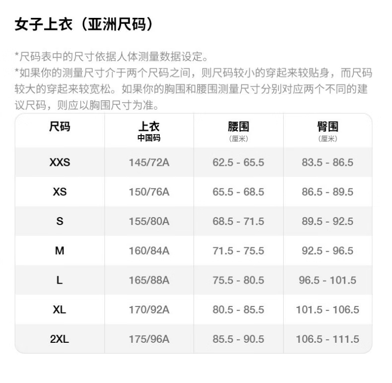 China (cm) 160-165/84-86 165-170 / 88-90 167-172 / 92-96 168-173 / 98-102 170-176 / 106-110