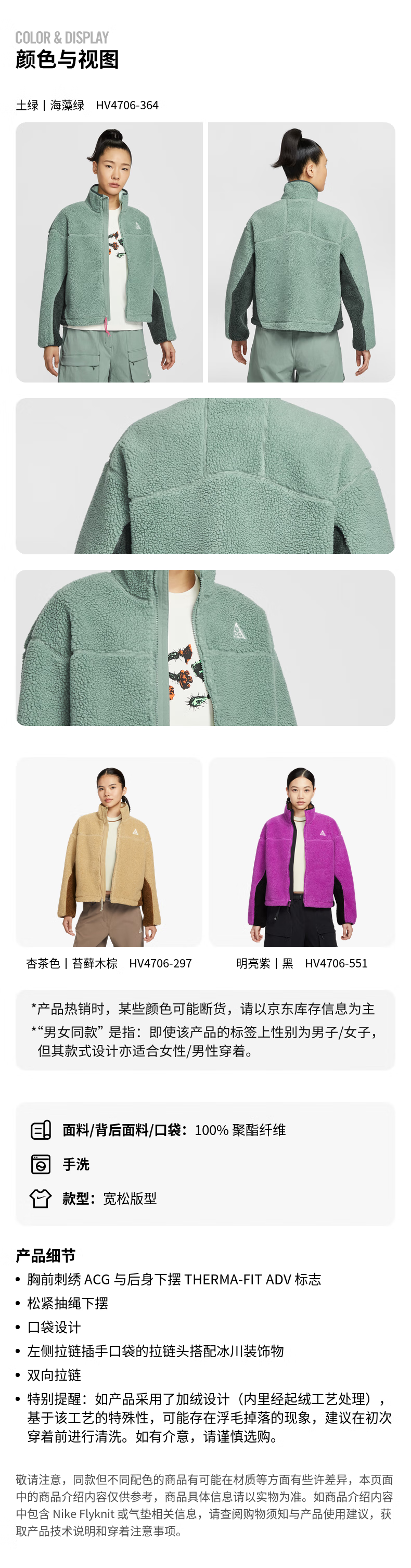 Nike women's outdoor warm jacket winter new jacket NIKE ACG THERMA-FIT ADV HV4706 364 earth green/seaweed green/foam mint green XS