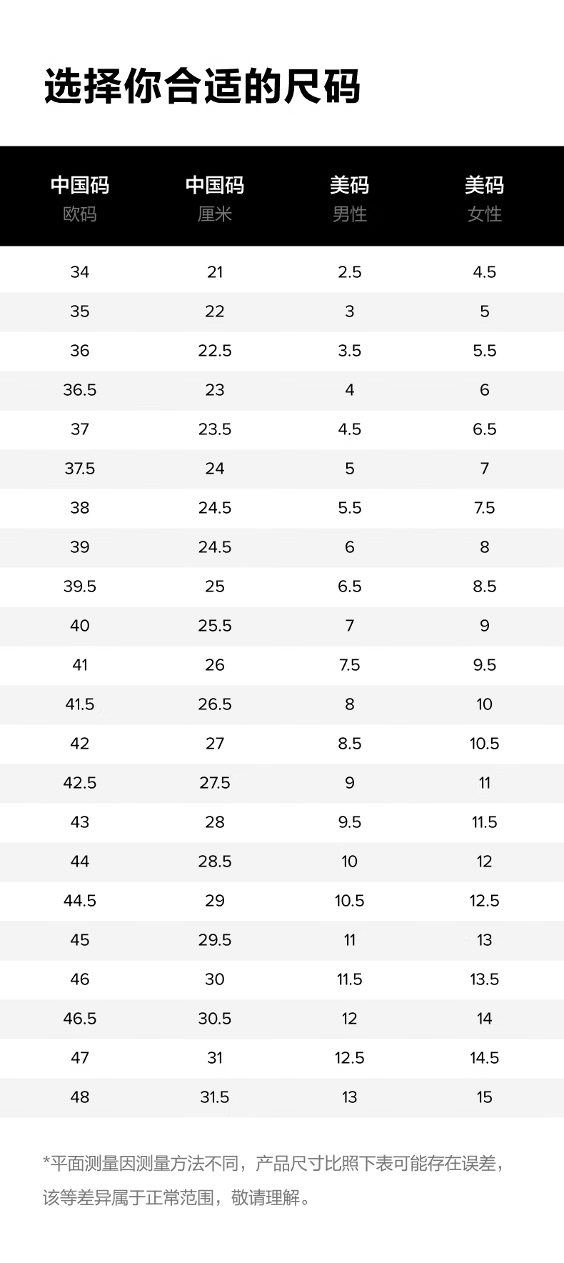 China (cm) 36 - 37 38 - 39 40 - 42 43 - 44 45 - 47