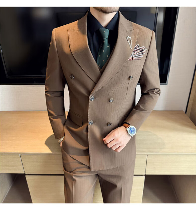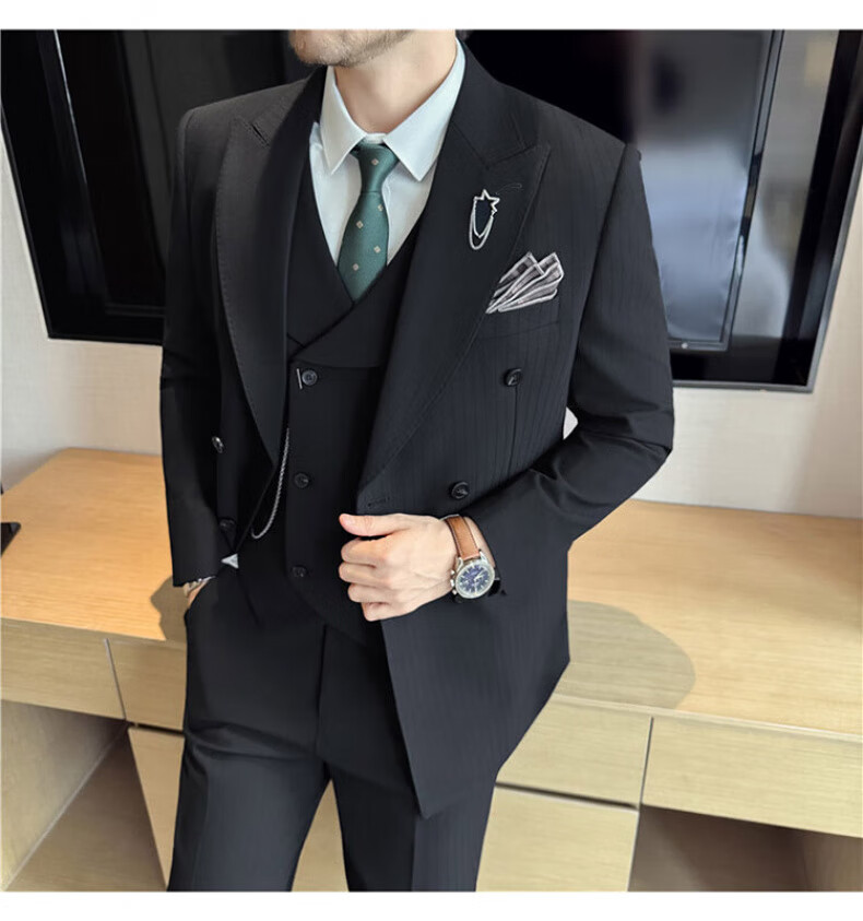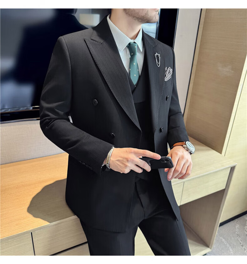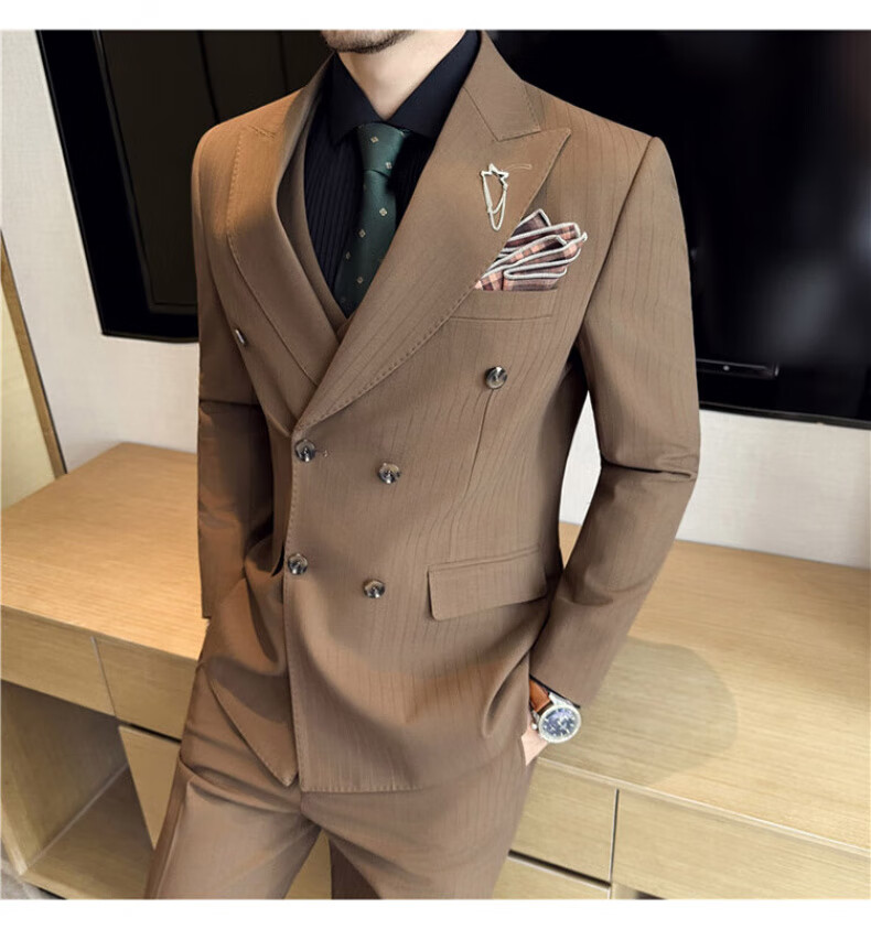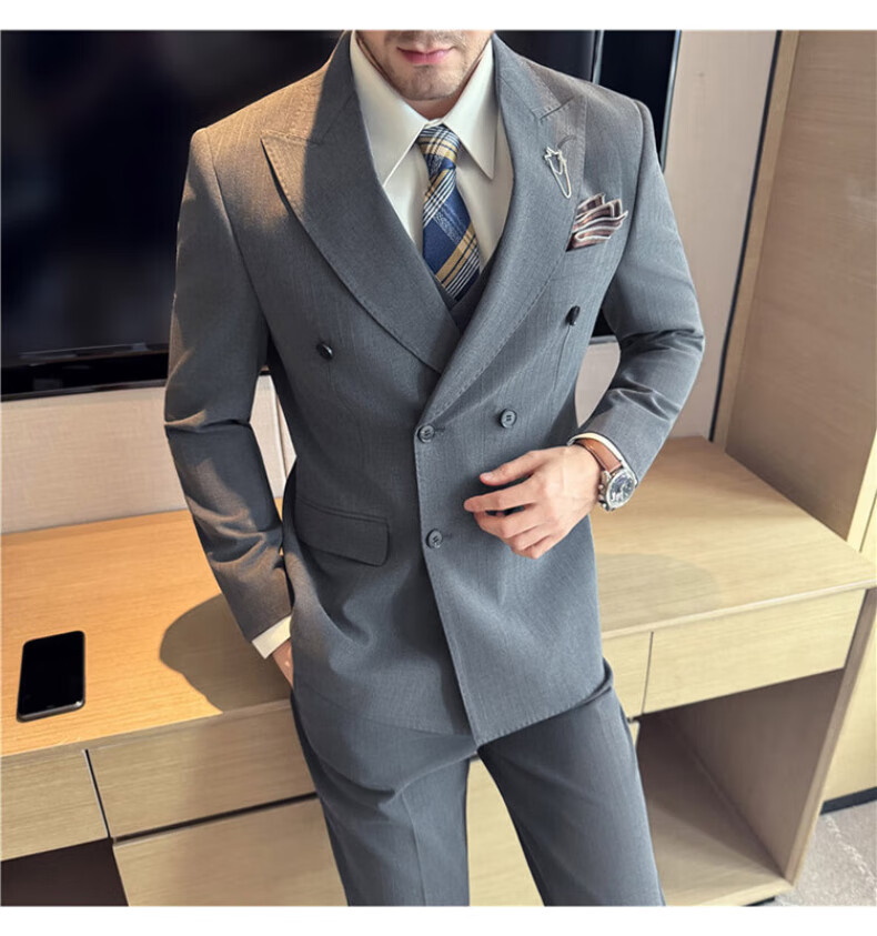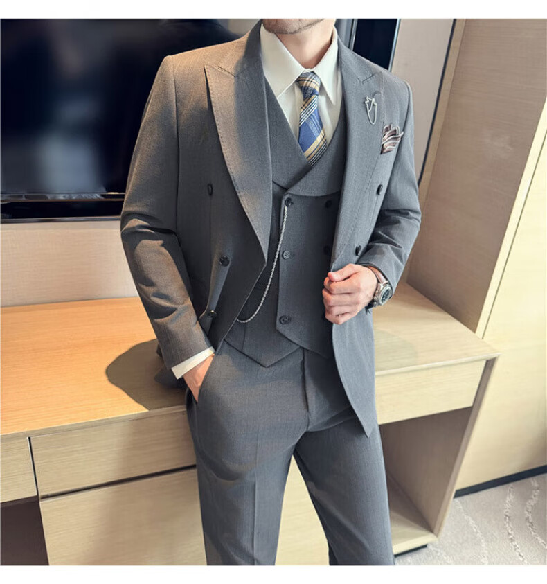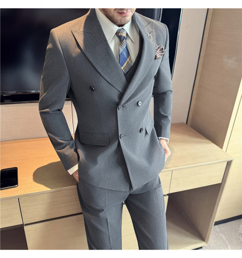 FZPT light luxury trendy brand suit suit for men 2025 autumn and winter new business casual fashion slim striped double-breasted suit medium gray suit + pants + vest 3XL recommended 150-160Jin Jin equals 0.5 kg
