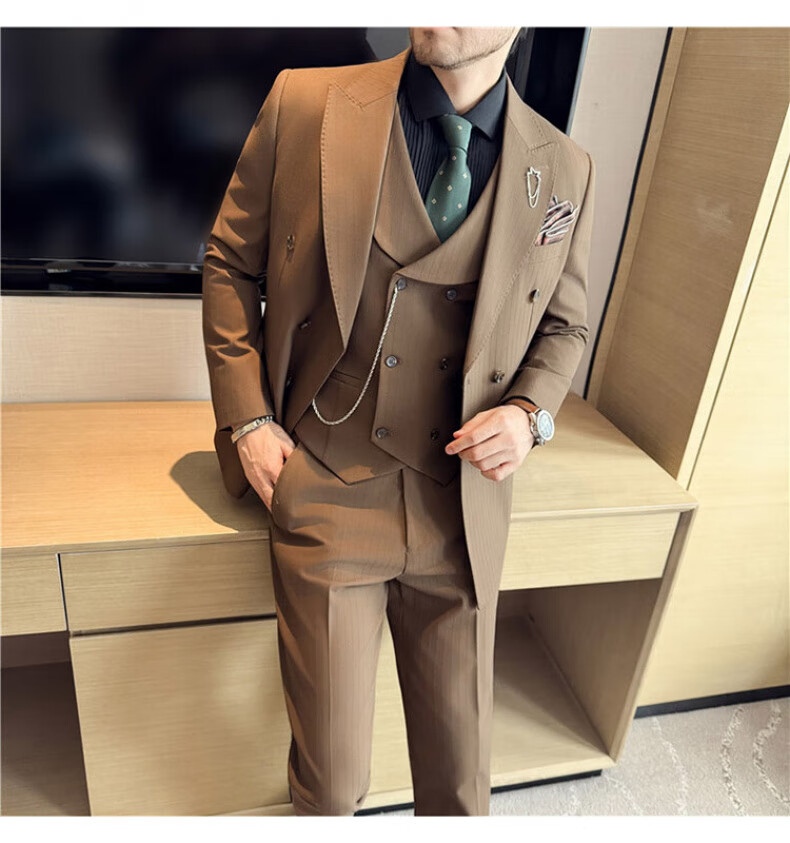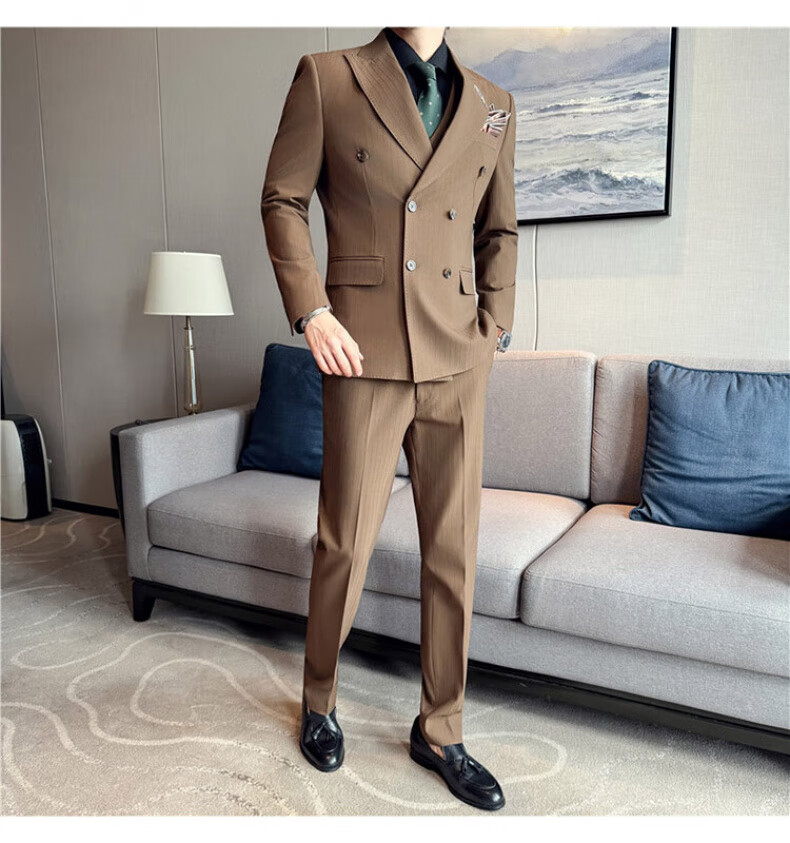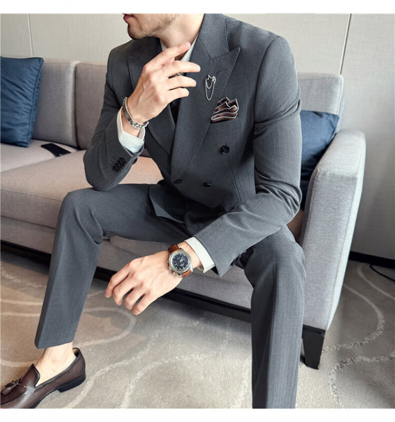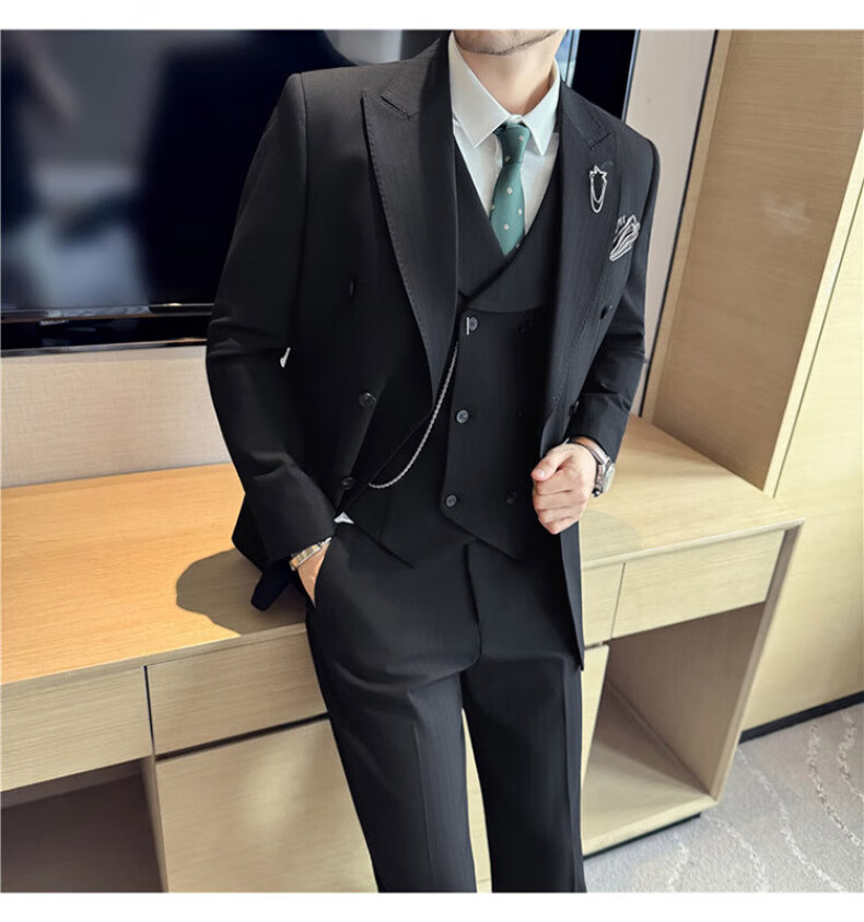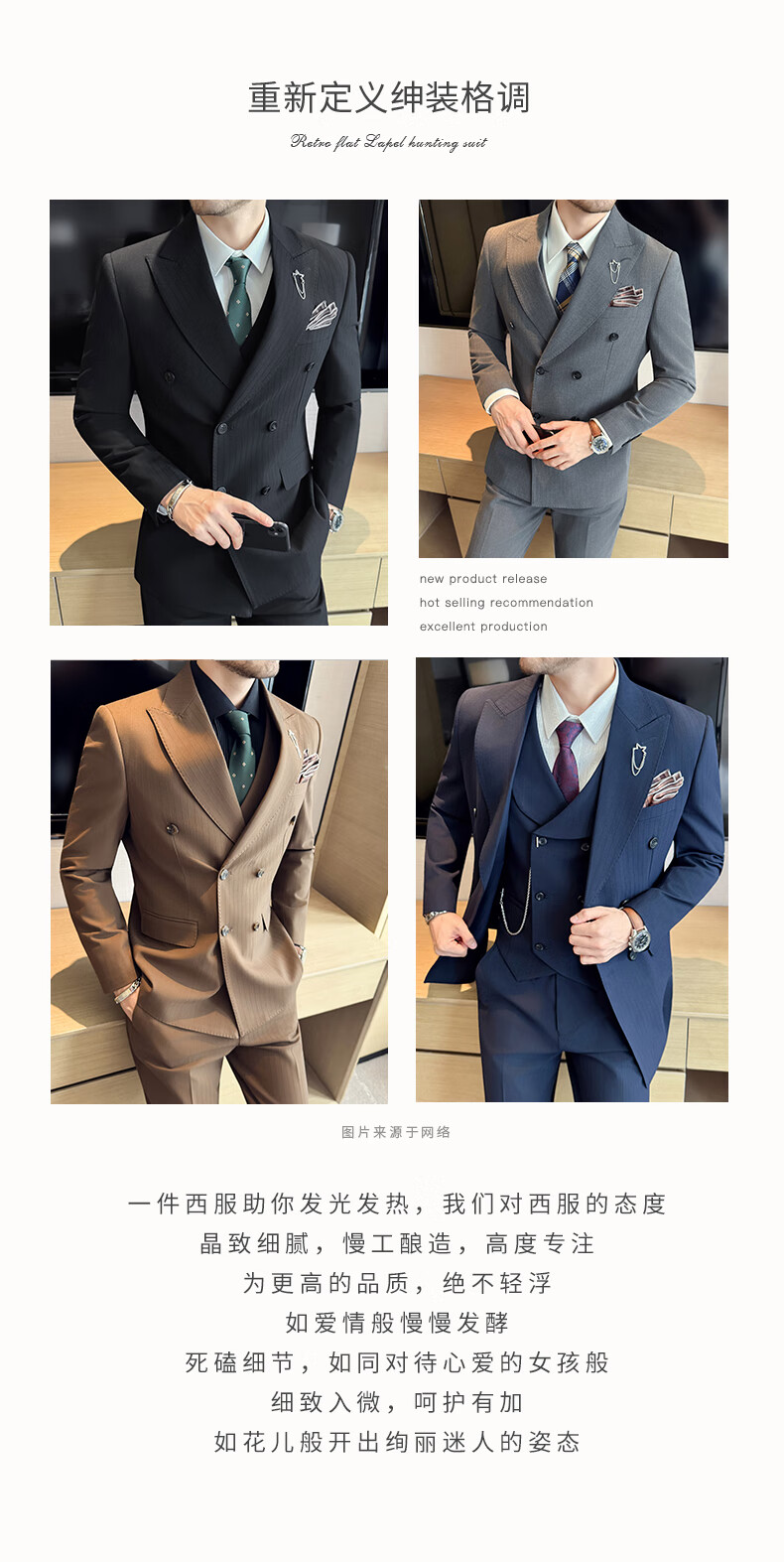 FZPT light luxury trendy brand suit suit for men 2025 autumn and winter new business casual fashion slim striped double-breasted suit medium gray suit + pants + vest 3XL recommended 150-160Jin Jin equals 0.5 kg