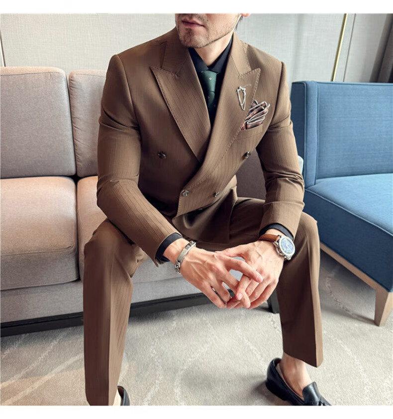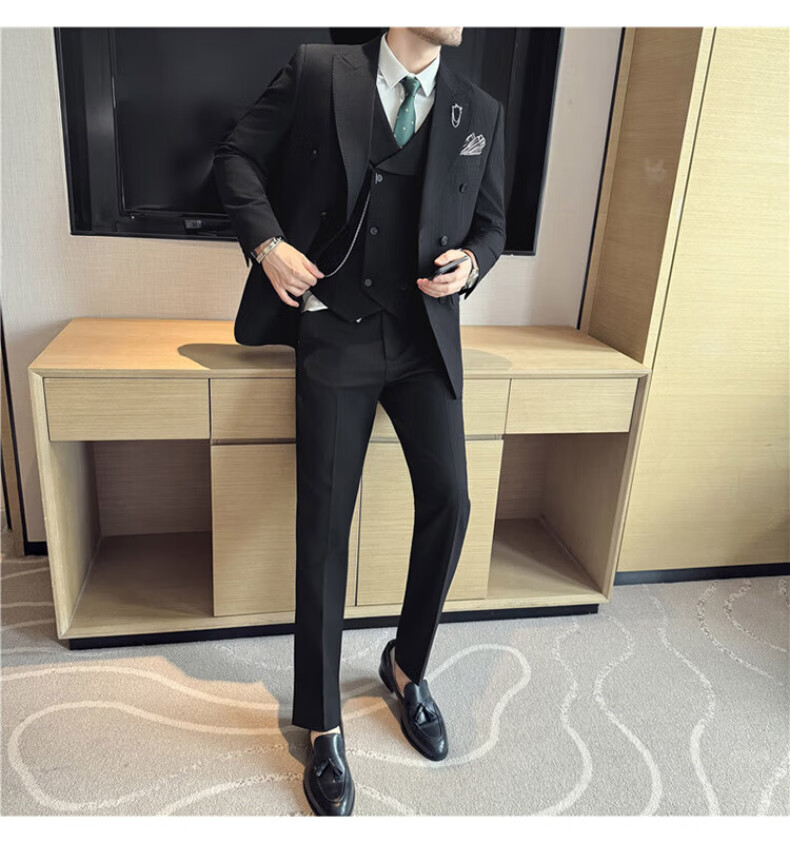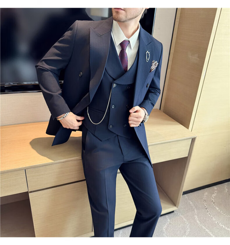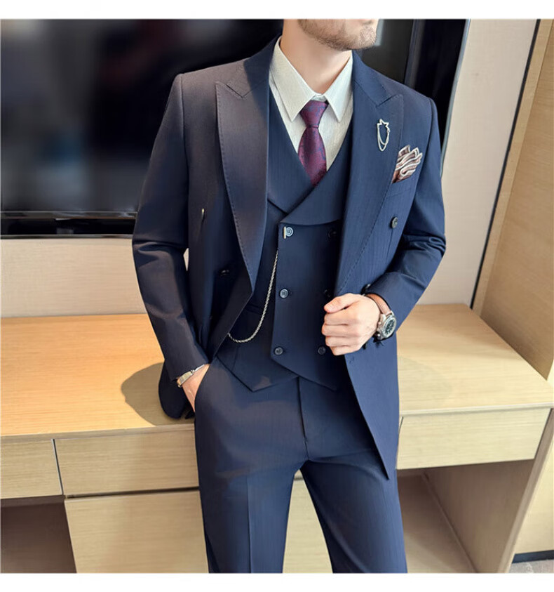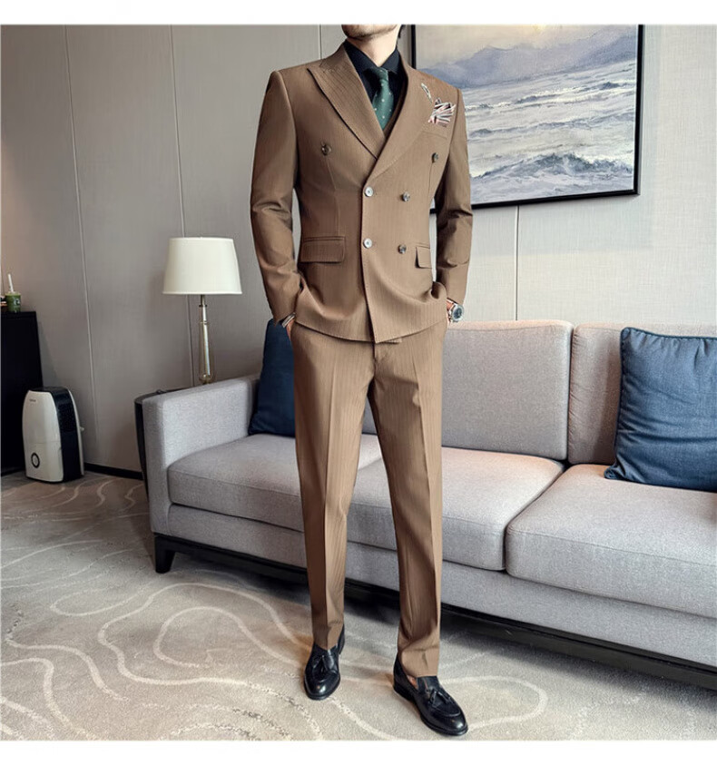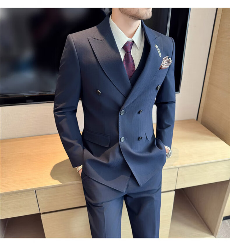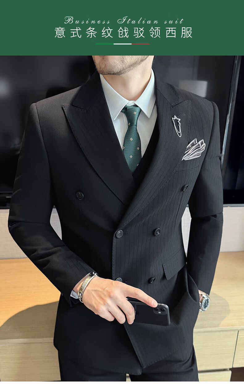 FZPT light luxury trendy brand suit suit for men 2025 autumn and winter new business casual fashion slim striped double-breasted suit medium gray suit + pants + vest 3XL recommended 150-160Jin Jin equals 0.5 kg