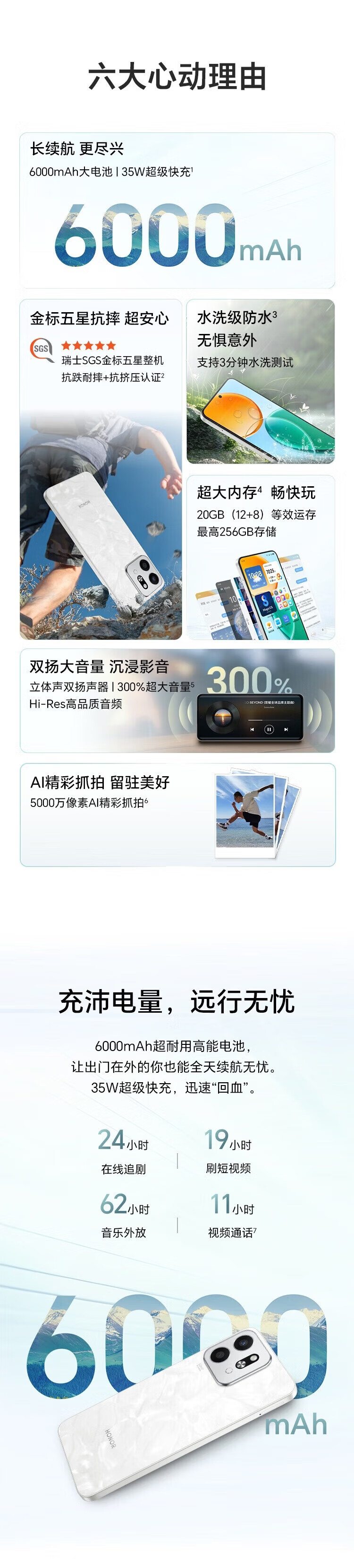 Honor Play9T new 5G mobile phone, waterproof and drop-resistant, 300% dual speaker, large volume, 6000mAh ultra-durable large battery, 5G AI smartphone, Honor play 9t Moon Shadow White, 12GB+256GB