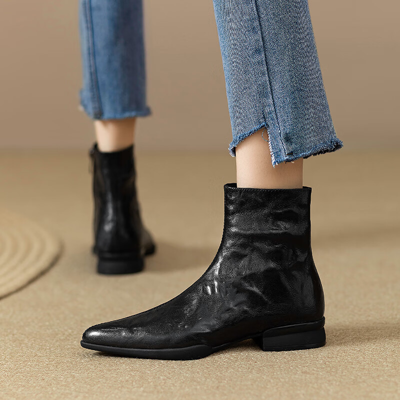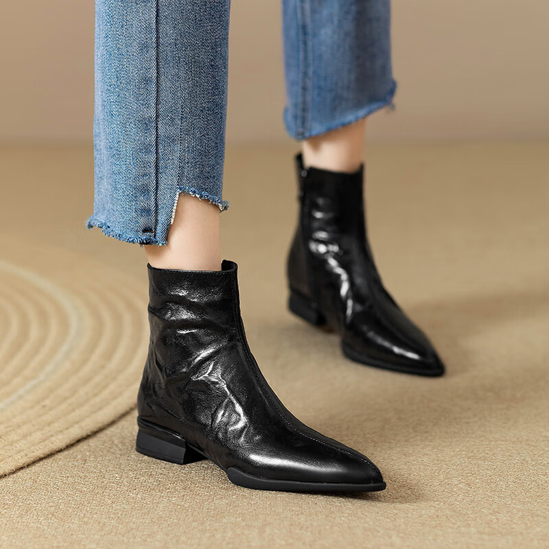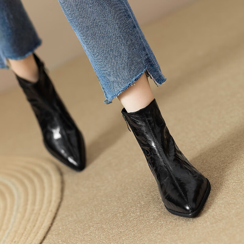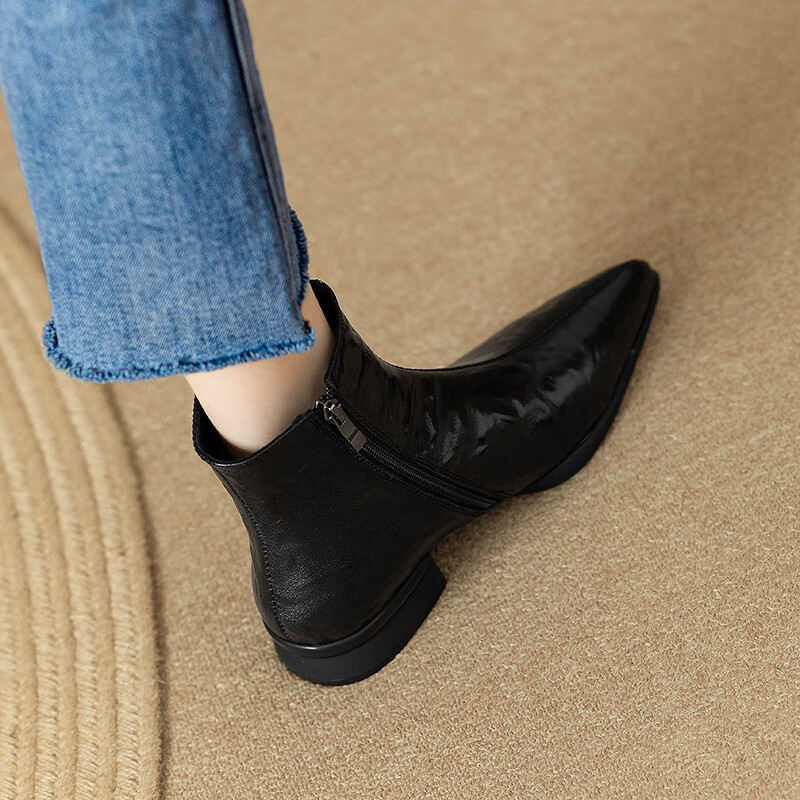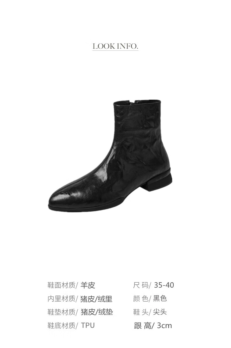 Belle Retro Sheepskin Short Boots Women's Thick Heel Pointed Toe Ankle Boots Chelsea Boots Martin Boots Spring and Autumn Single Boots Winter Plus Velvet Black Single Liner 39
