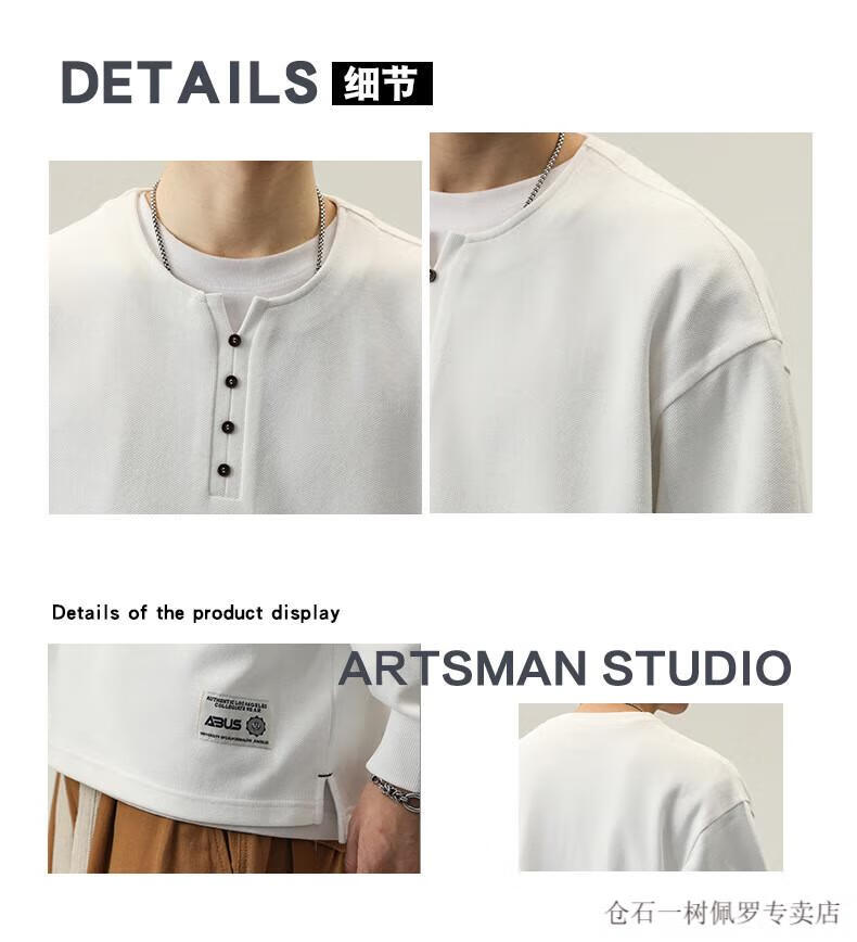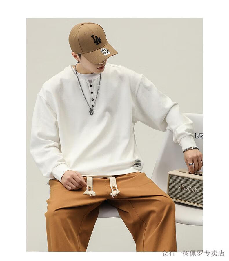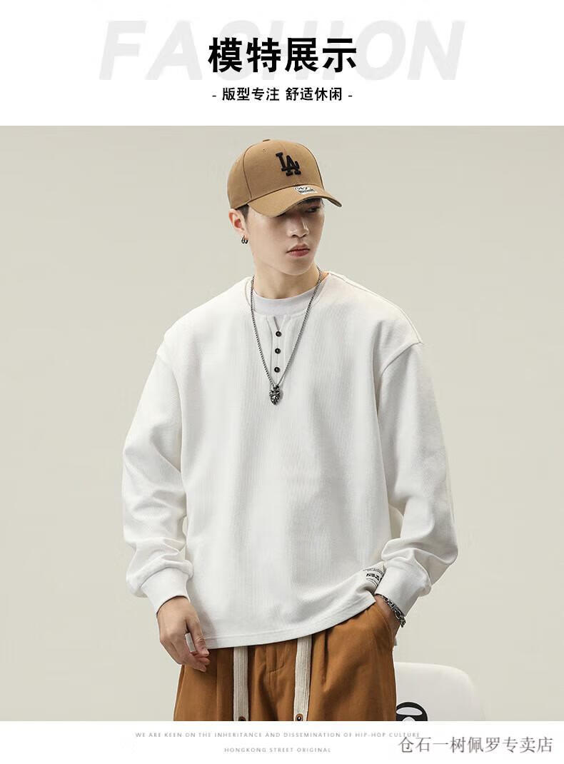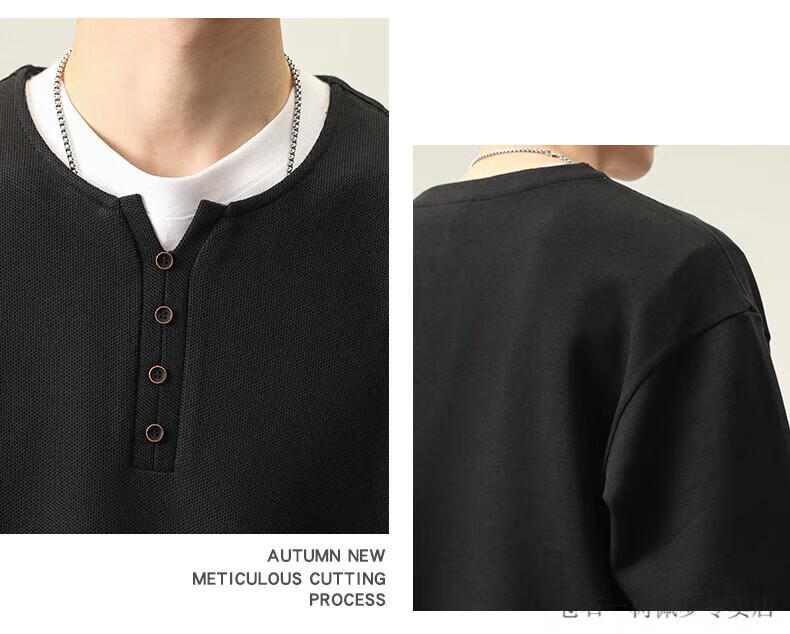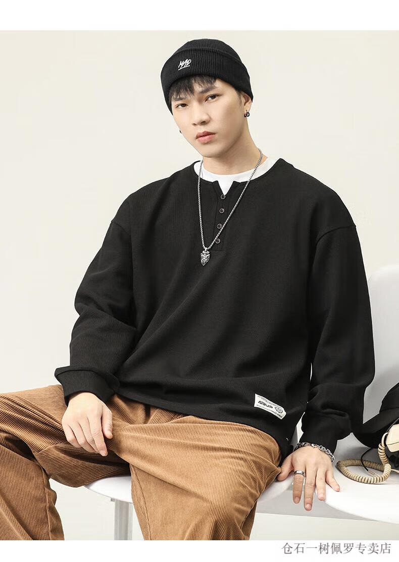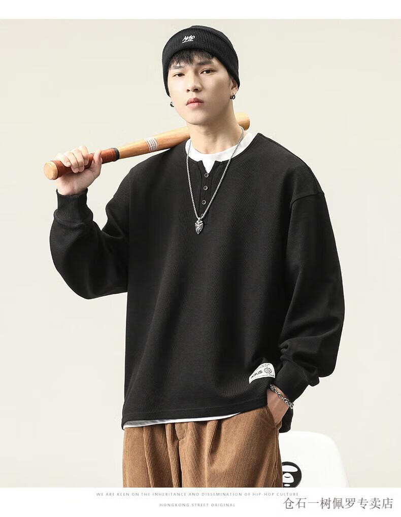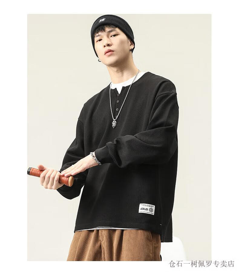 Kuraishi Kazuki autumn heavy cotton men's long-sleeved T-shirt loose large size American fashion brand casual Henry collar bottoming shirt sweatshirt black M suitable for 110-130Jin Jin equals 0.5 kg