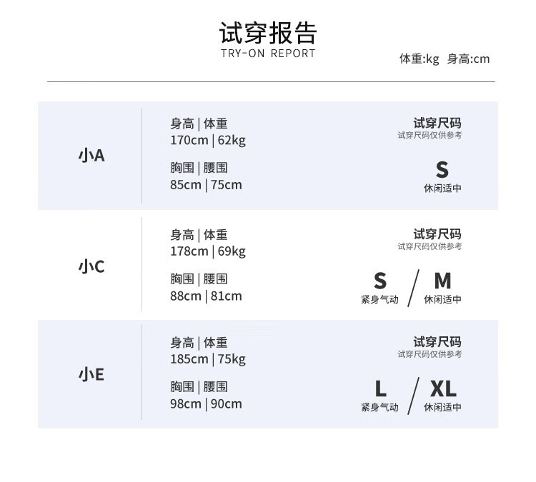 China (cm) 165 / 88-90 170 / 96-98 175 / 108-110 180 / 118-122 185 / 126-130