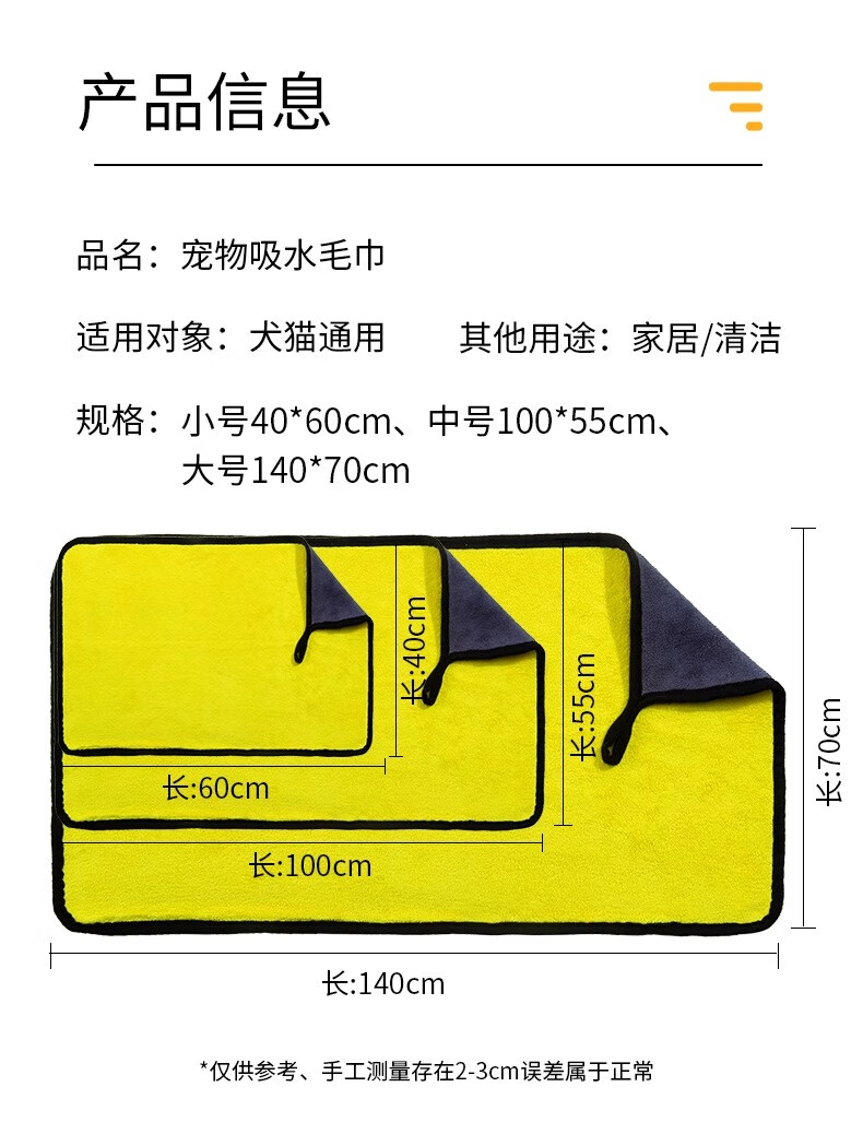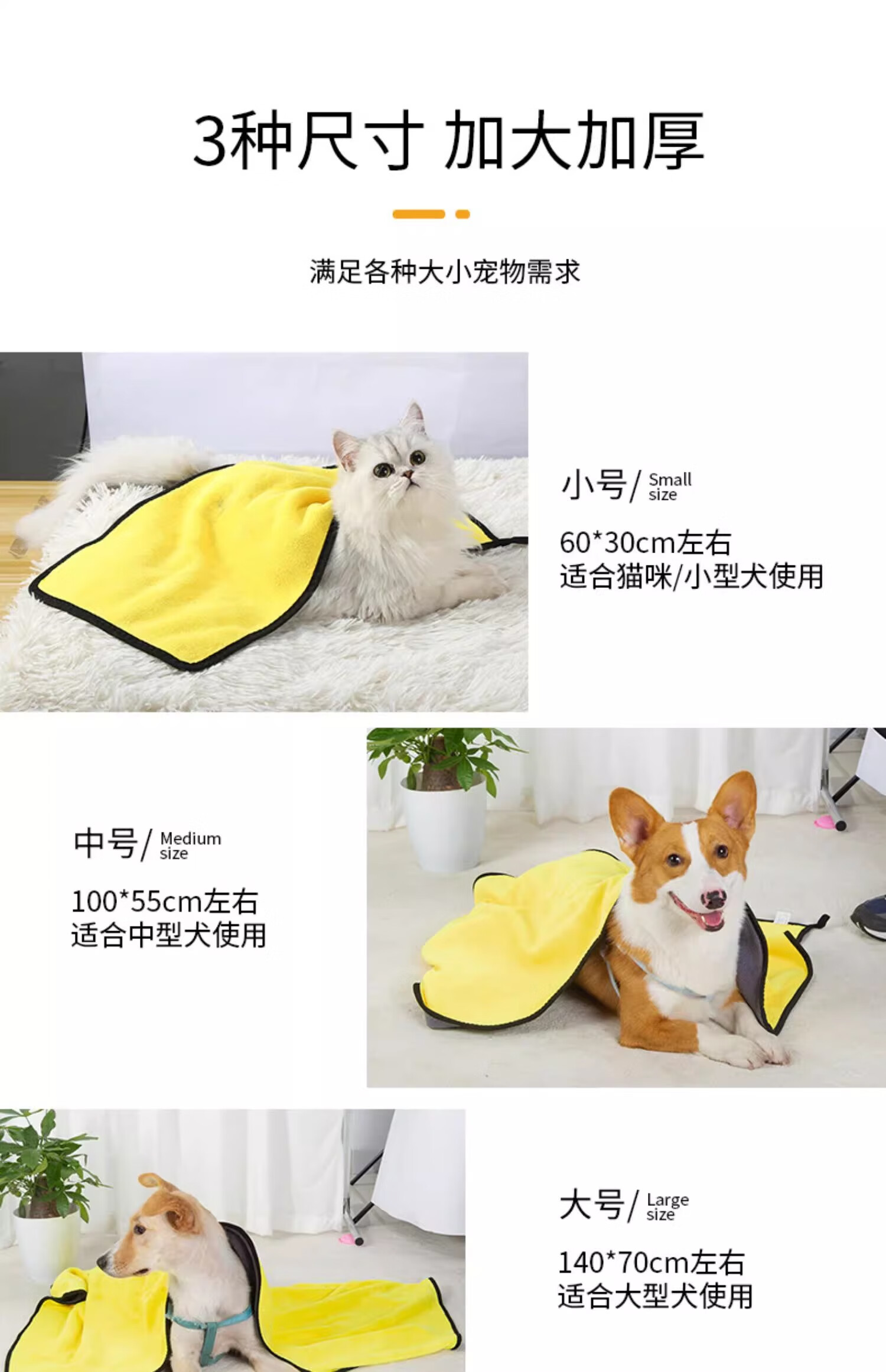 Pet absorbent towel, thickened and quick-drying, Teddy Bichon dog bath towel, cat bath towel, non-stick hair supplies for bathing, 100cm*55cm, suitable for medium-sized dogs and large cats, yellow medium size