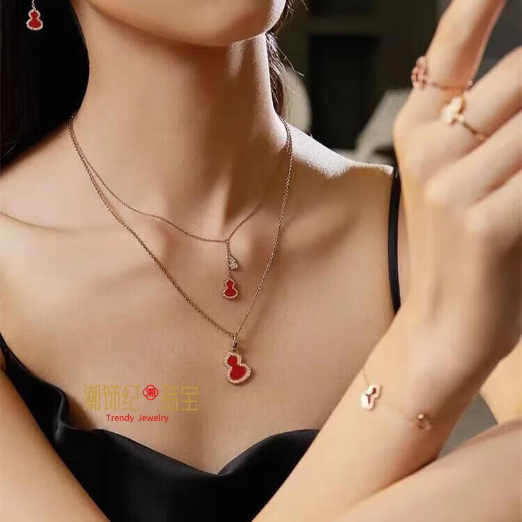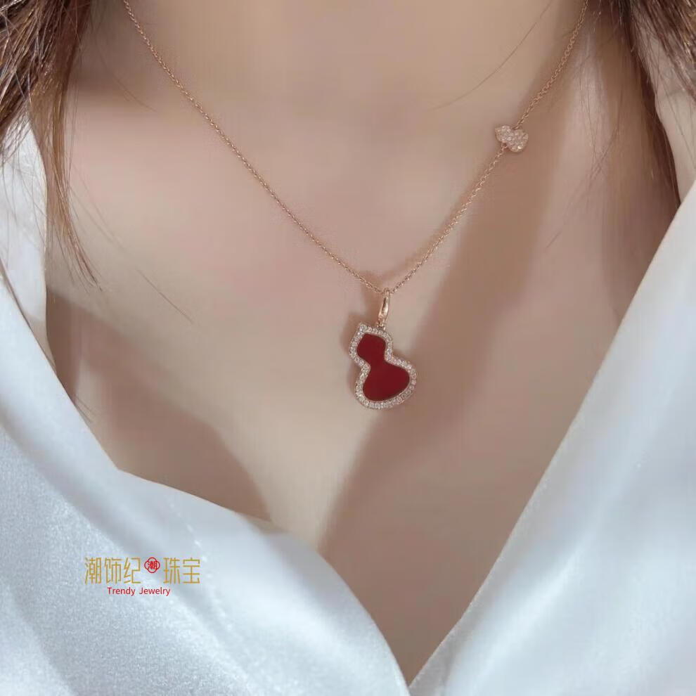 Heart ancient quality 18K gold gourd necklace new red and white mother-of-pearl rose gold diamond pendant clavicle chain neck double pendant rose gold red necklace