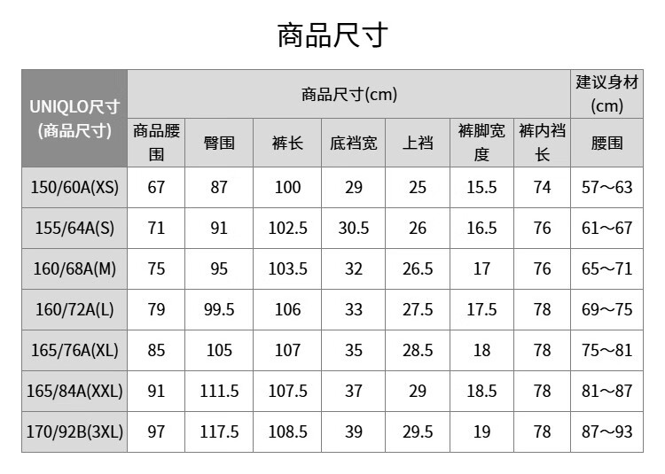 China (cm) 160-165/84-86 165-170 / 88-90 167-172 / 92-96 168-173 / 98-102 170-176 / 106-110
