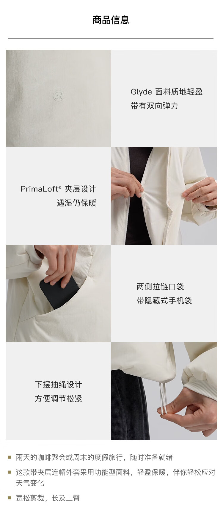 Lululemon丨Women's laminated hooded jacket LW4CEDS light ivory M