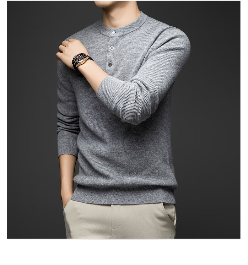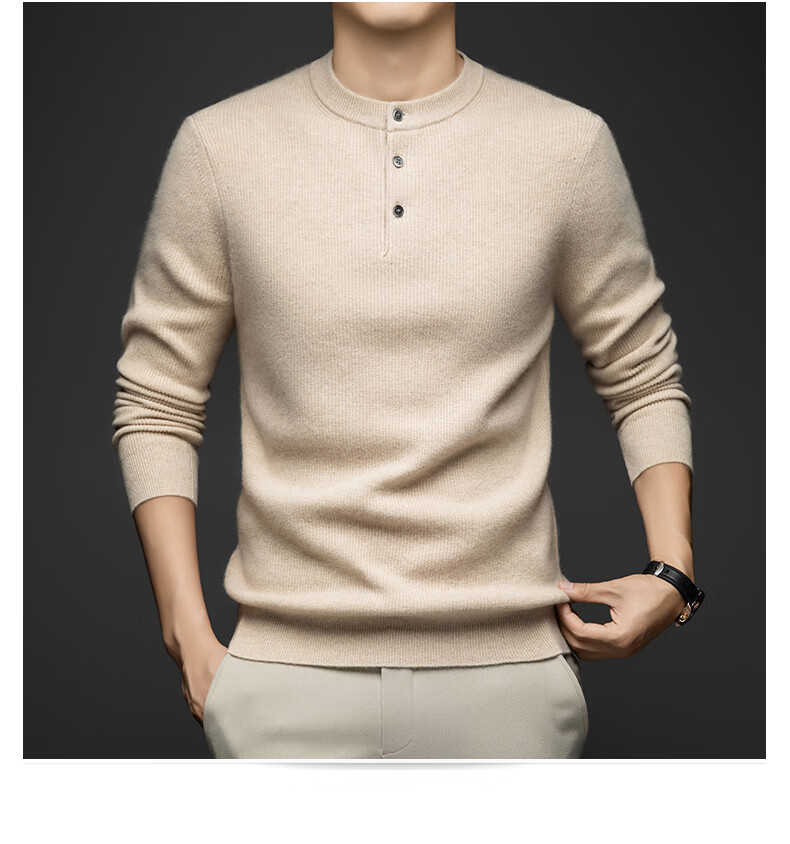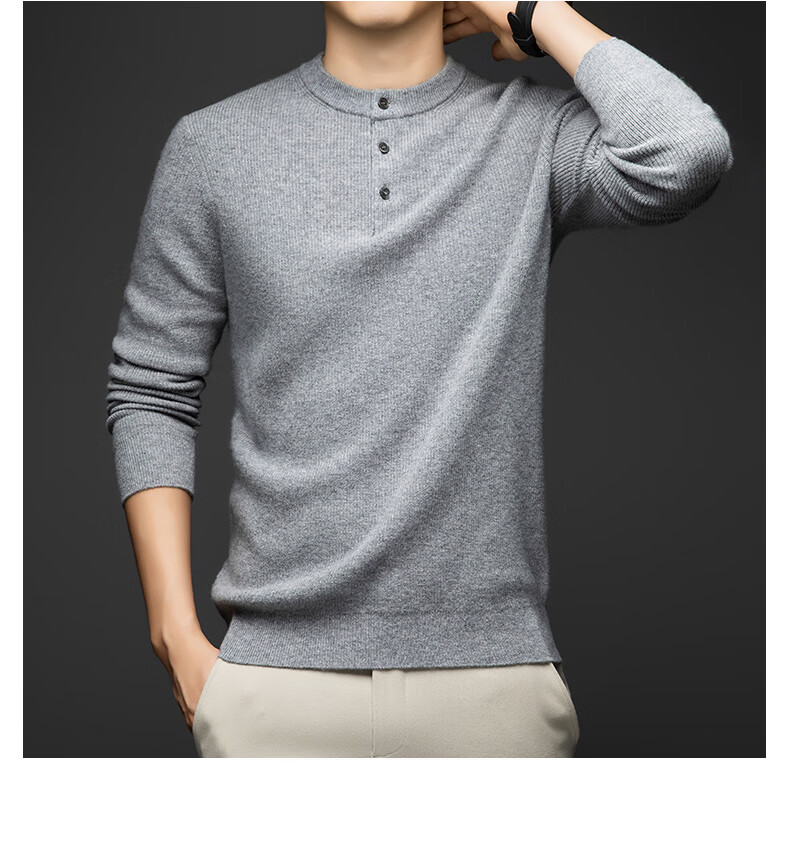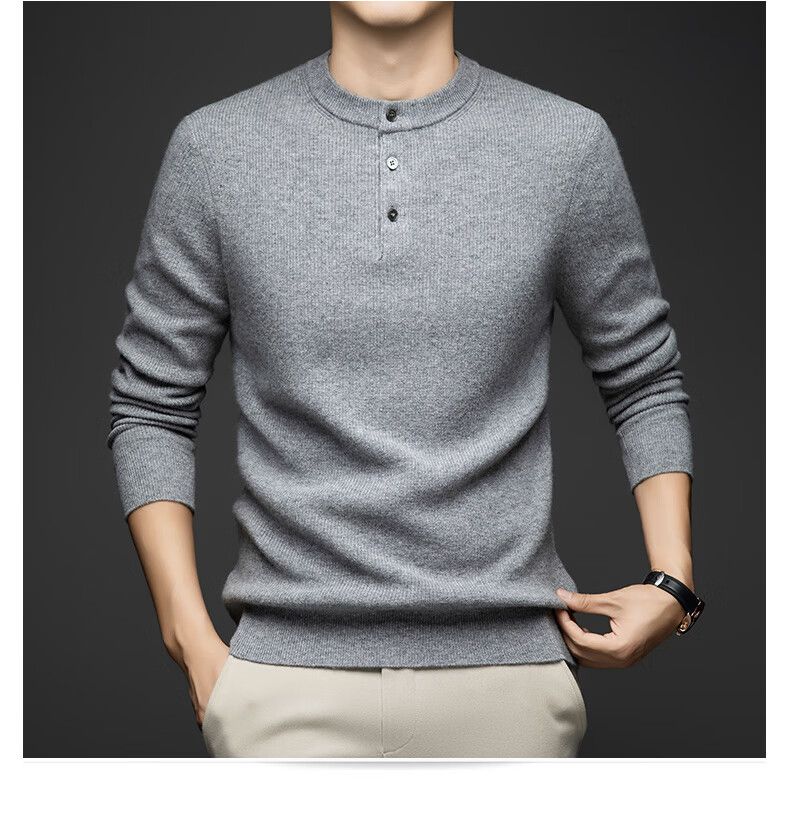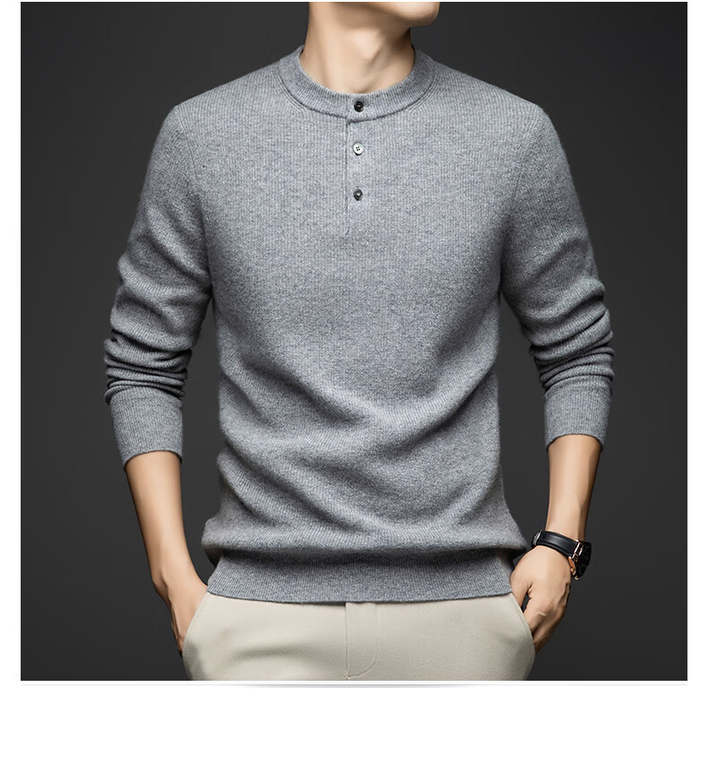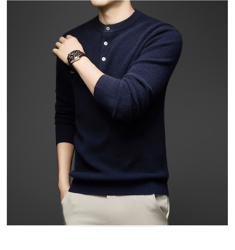 MELLEN 100% pure cashmere sweater Henry collar thickened sweater for men in winter round neck trendy casual warm knitted bottoming shirt navy blue S (165)