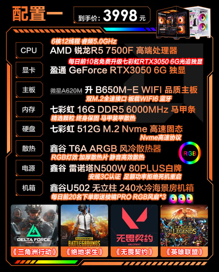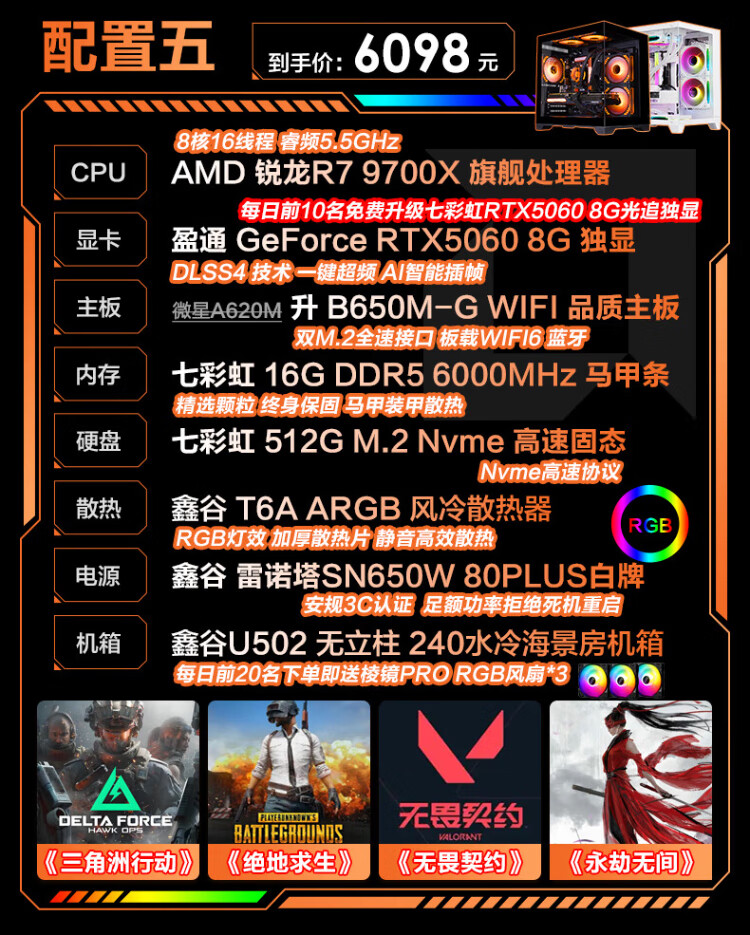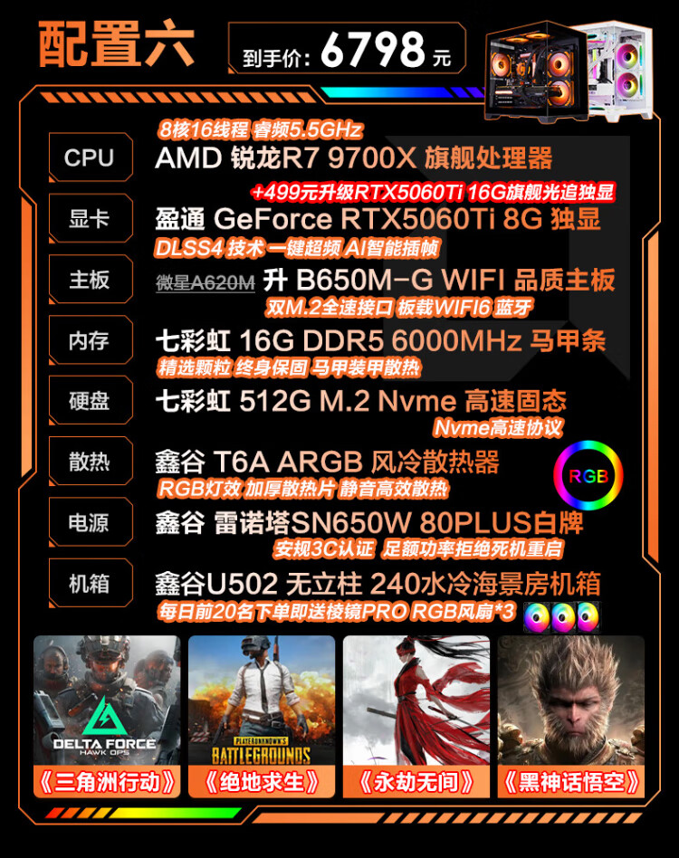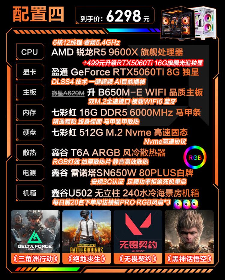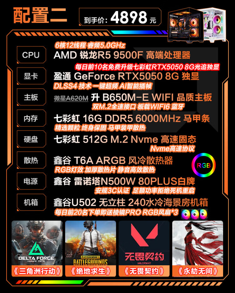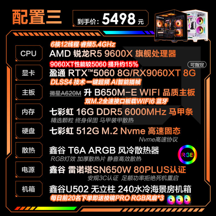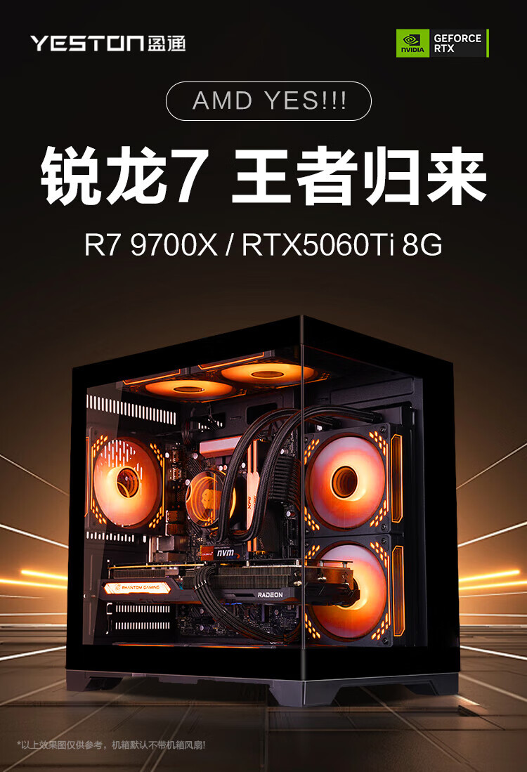 Yeston AMD Ruilong 7500F/9600X/9700X desktop assembly computer host RTX5060Ti Delta tile game live broadcast design rendering DIY complete machine configuration one R5 7500F丨RTX3050 efficient game