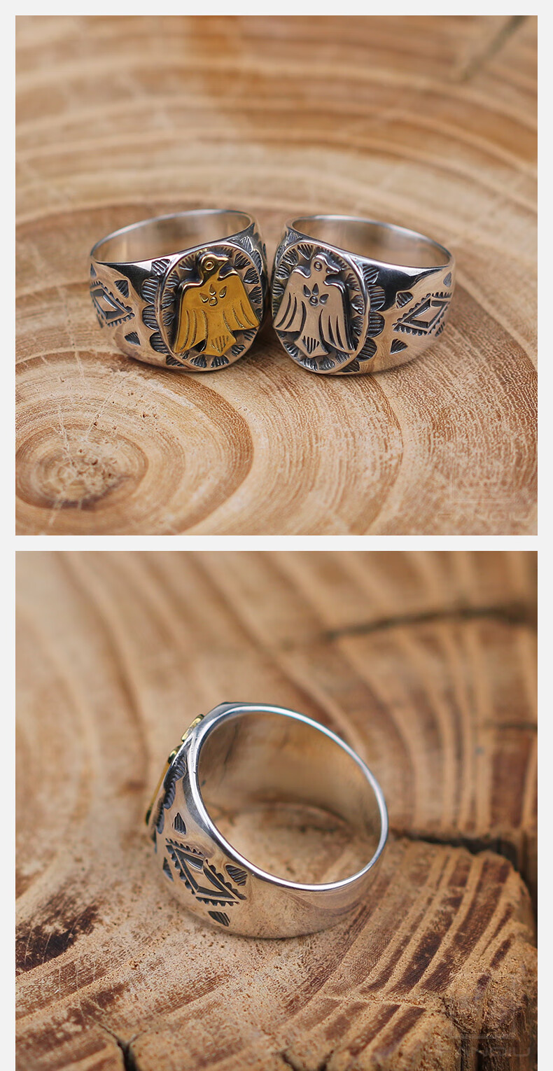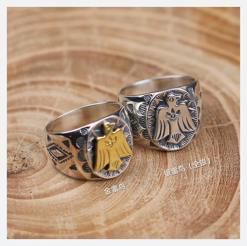 Jiaye First Arrow s Navajo hand-knocked ribbed totem 925 silver ring Thunderbird wide ring ancient antique silver copper silver style