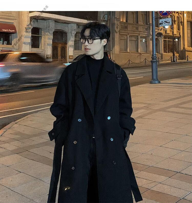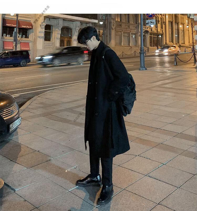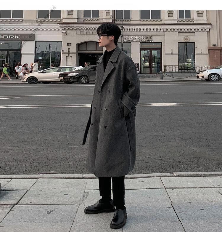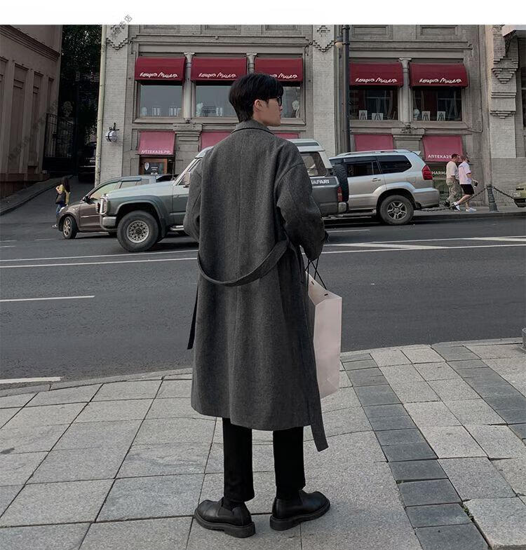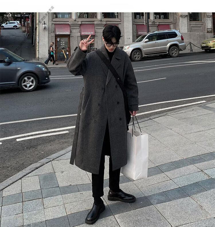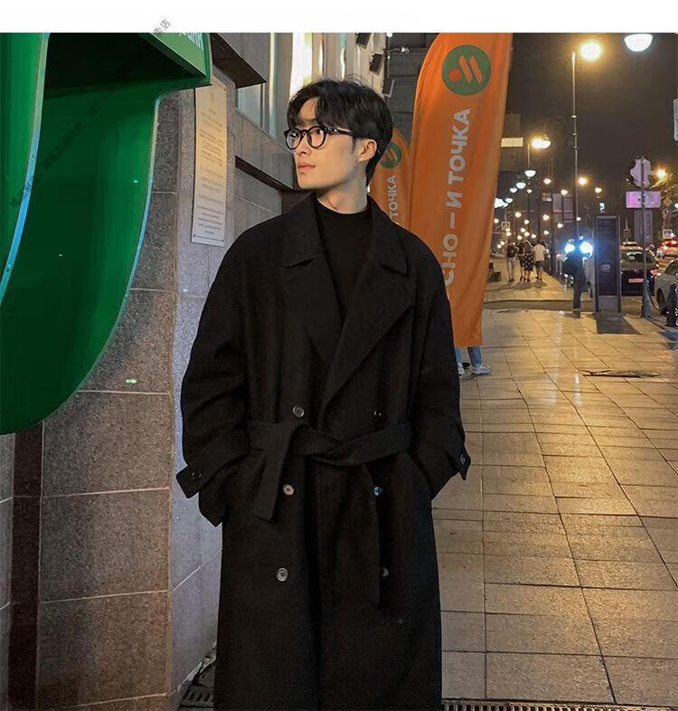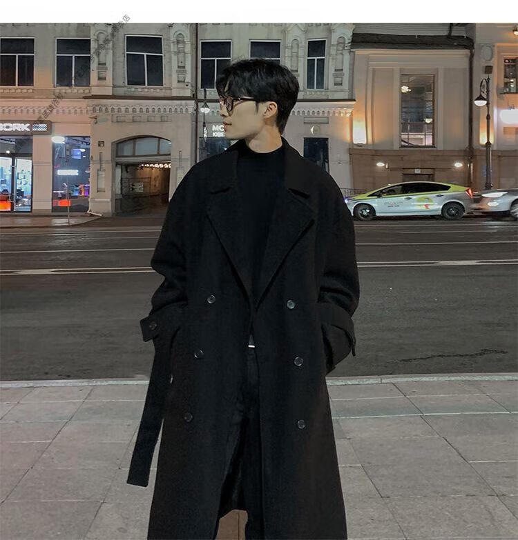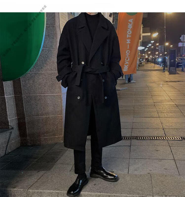 ROMON Belt Tie Mid-Length Woolen Coat Men's Knee-Level Loose Winter Thickened Korean Woolen Windbreaker Jacket Trend Black Counter Genuine 3XL Recommended 180-210Jin Jin is equal to 0.5 kg