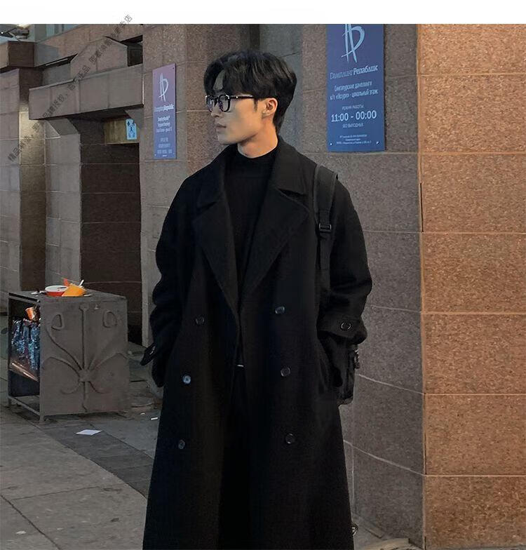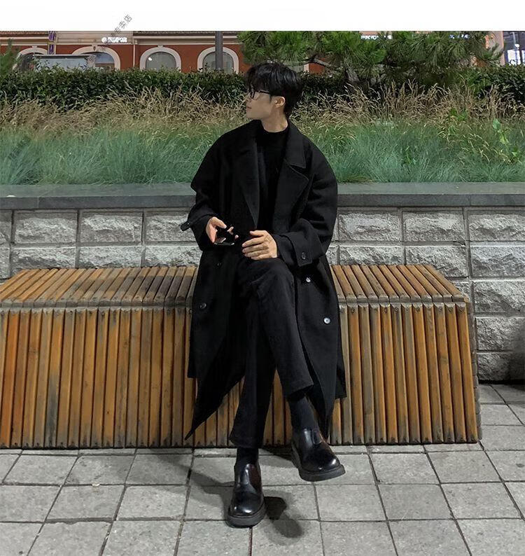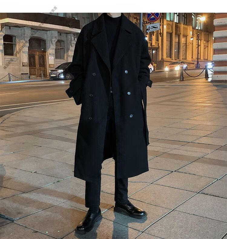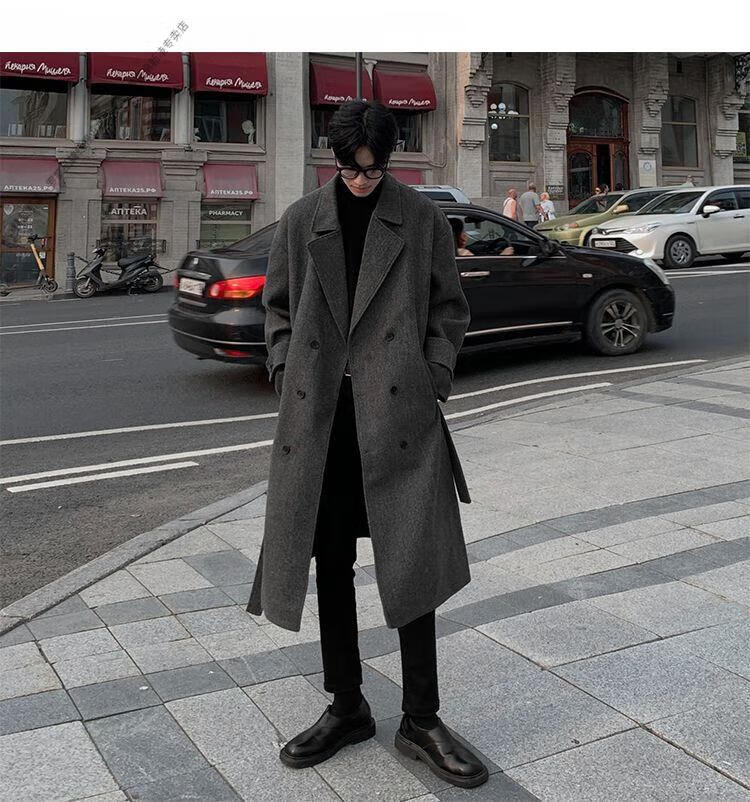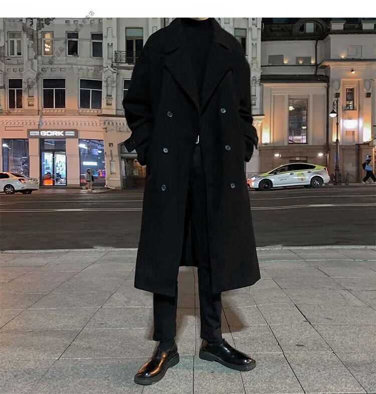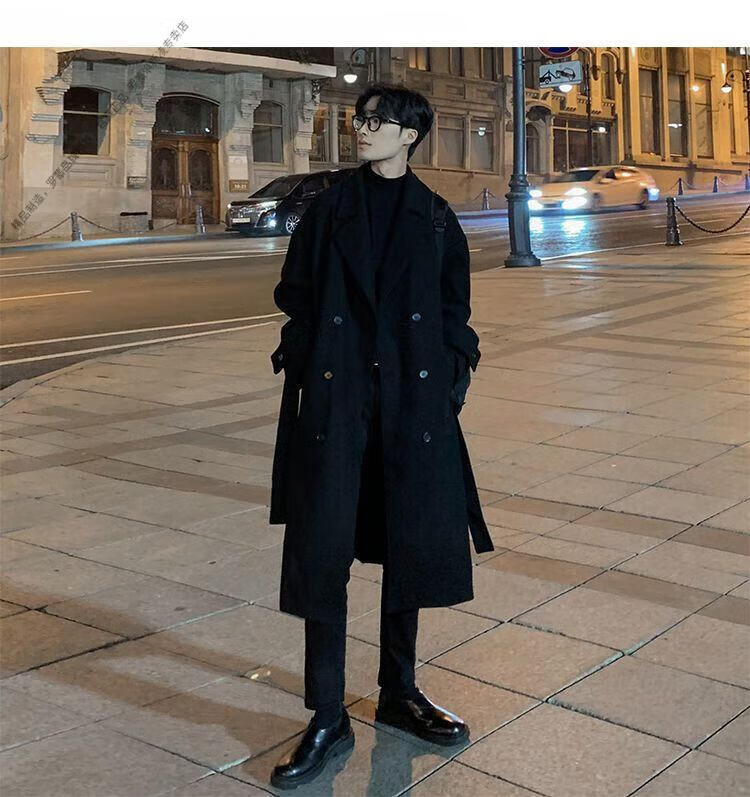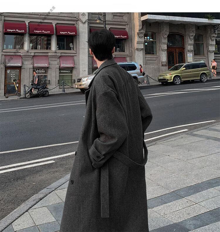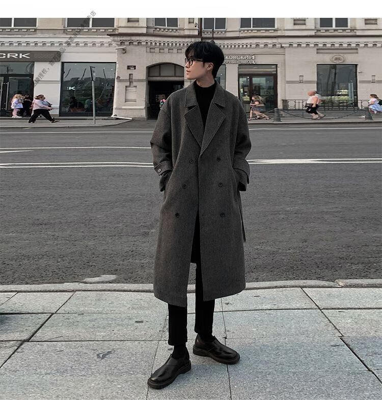 ROMON Belt Tie Mid-Length Woolen Coat Men's Knee-Level Loose Winter Thickened Korean Woolen Windbreaker Jacket Trend Black Counter Genuine 3XL Recommended 180-210Jin Jin is equal to 0.5 kg