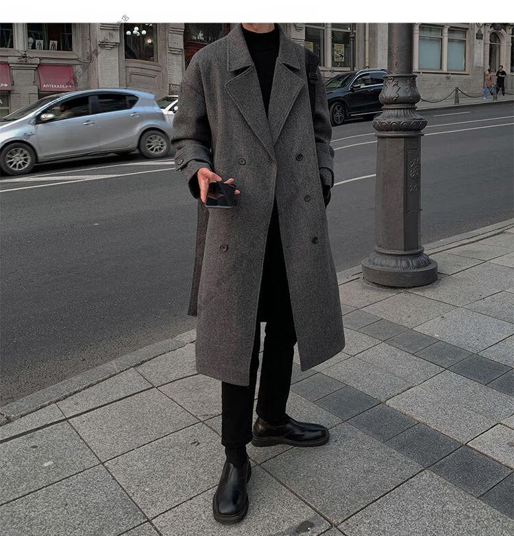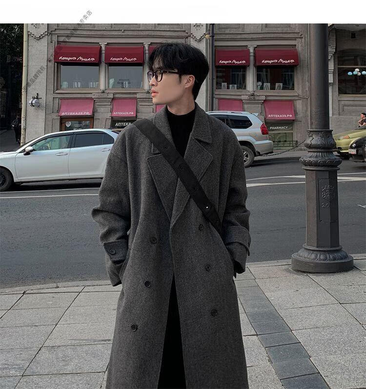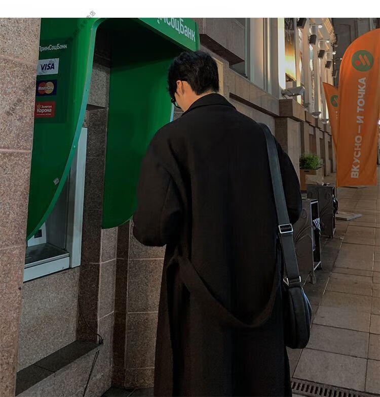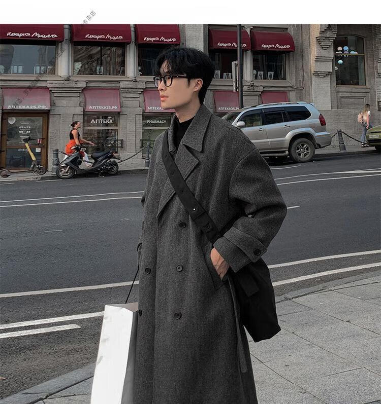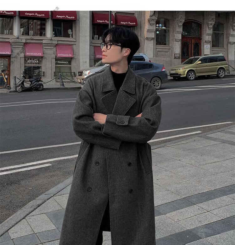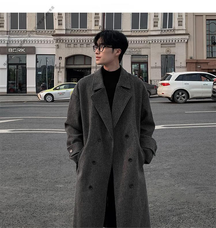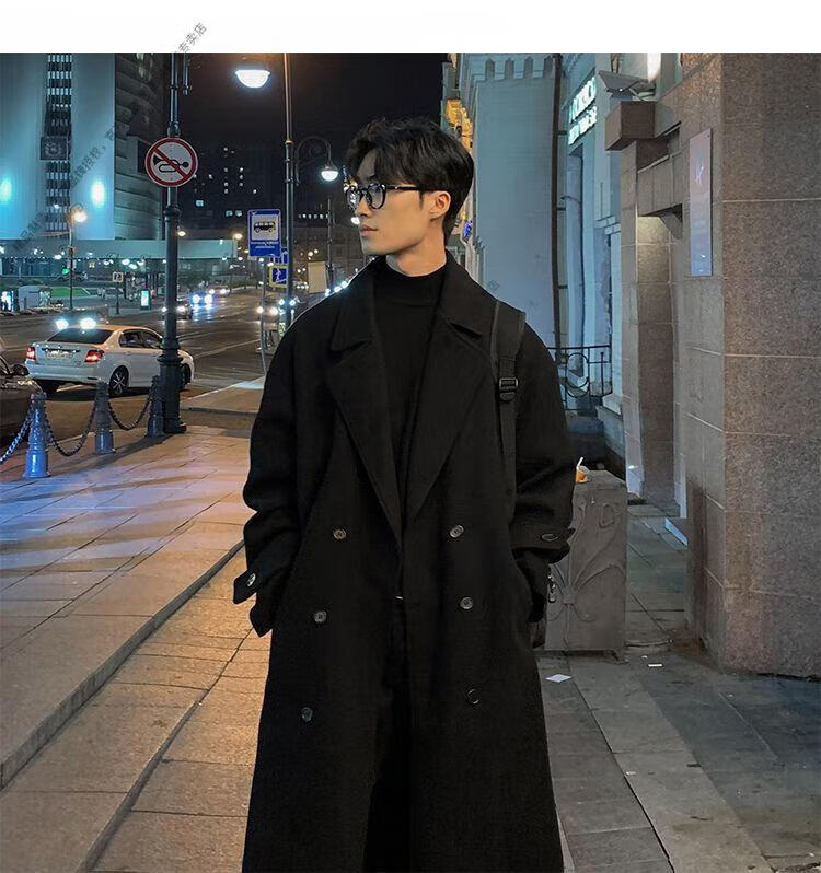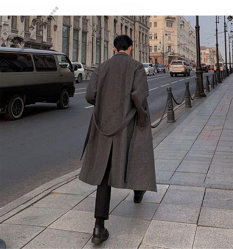 ROMON Belt Tie Mid-Length Woolen Coat Men's Knee-Level Loose Winter Thickened Korean Woolen Windbreaker Jacket Trend Black Counter Genuine 3XL Recommended 180-210Jin Jin is equal to 0.5 kg