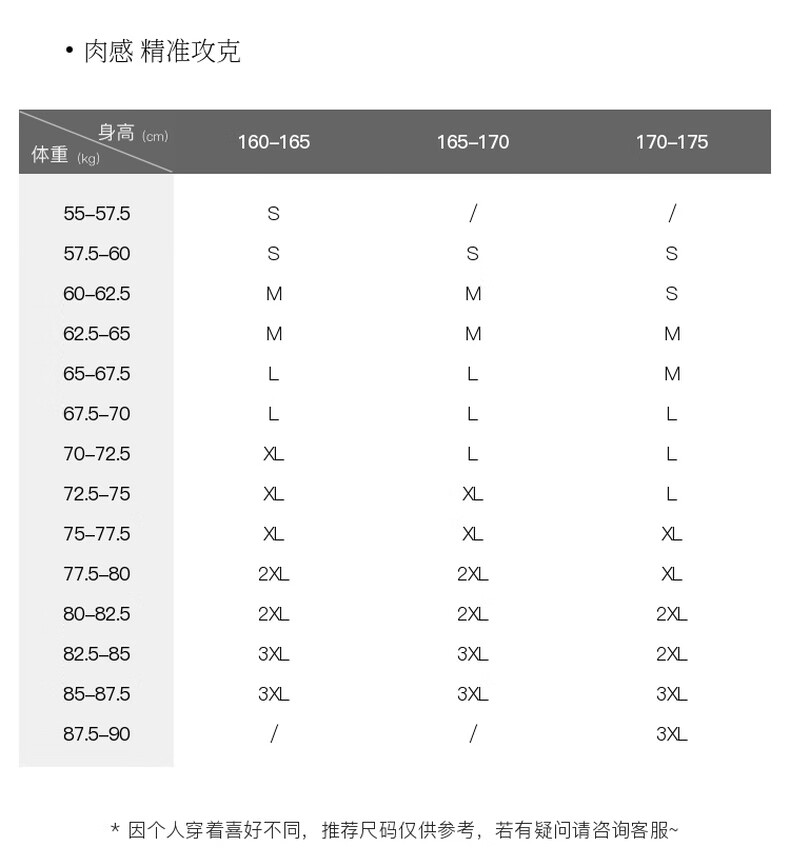 China (cm) 160-165/84-86 165-170 / 88-90 167-172 / 92-96 168-173 / 98-102 170-176 / 106-110
