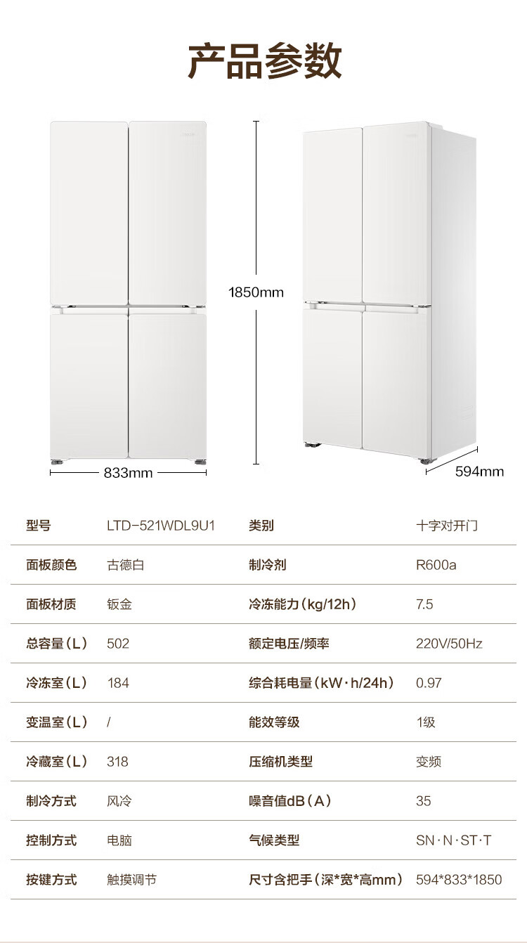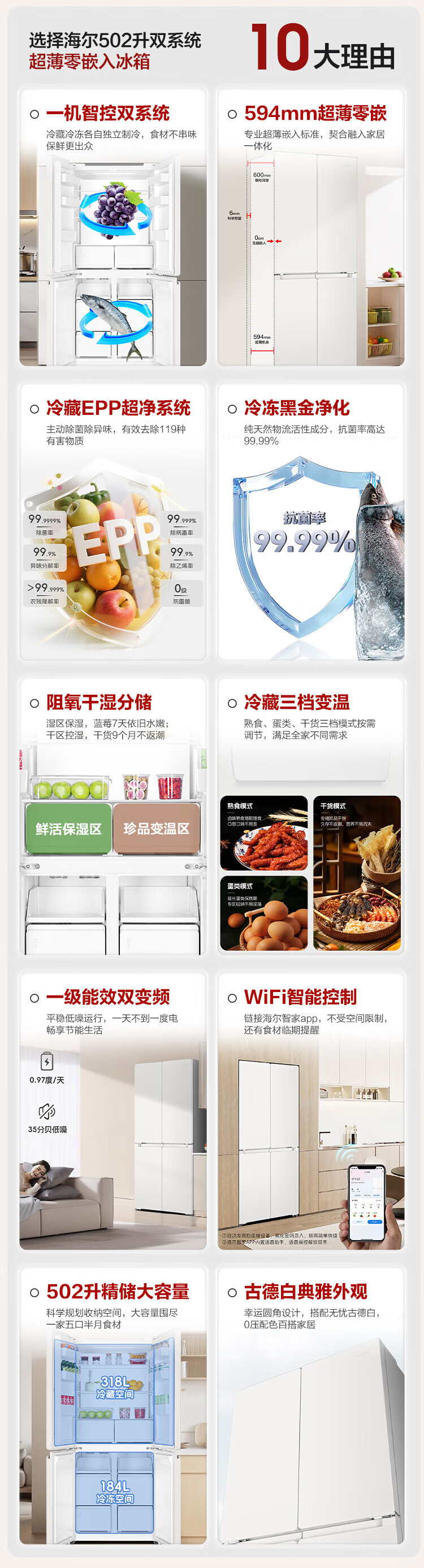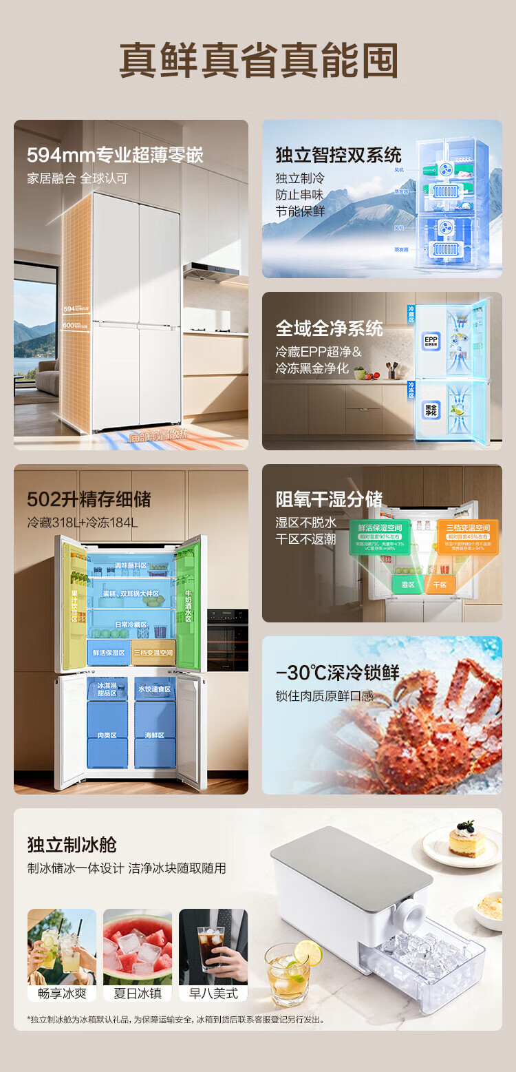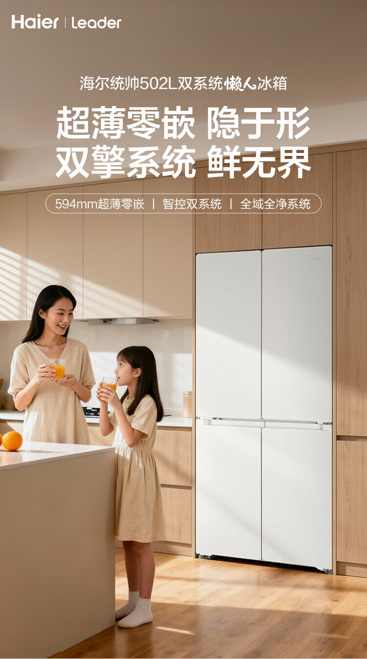 Haier refrigerator 25 years new model 502 liter dual system ultra-thin zero-embedded 60cm household four-door cross door commander lazy person first-class energy efficiency frequency conversion national subsidy 521 global sterilization and purification + oxygen barrier dry and wet storage + 594mm ultra-thin