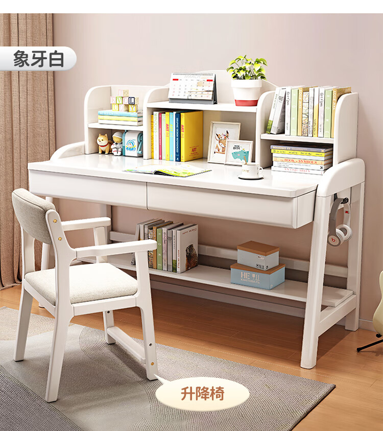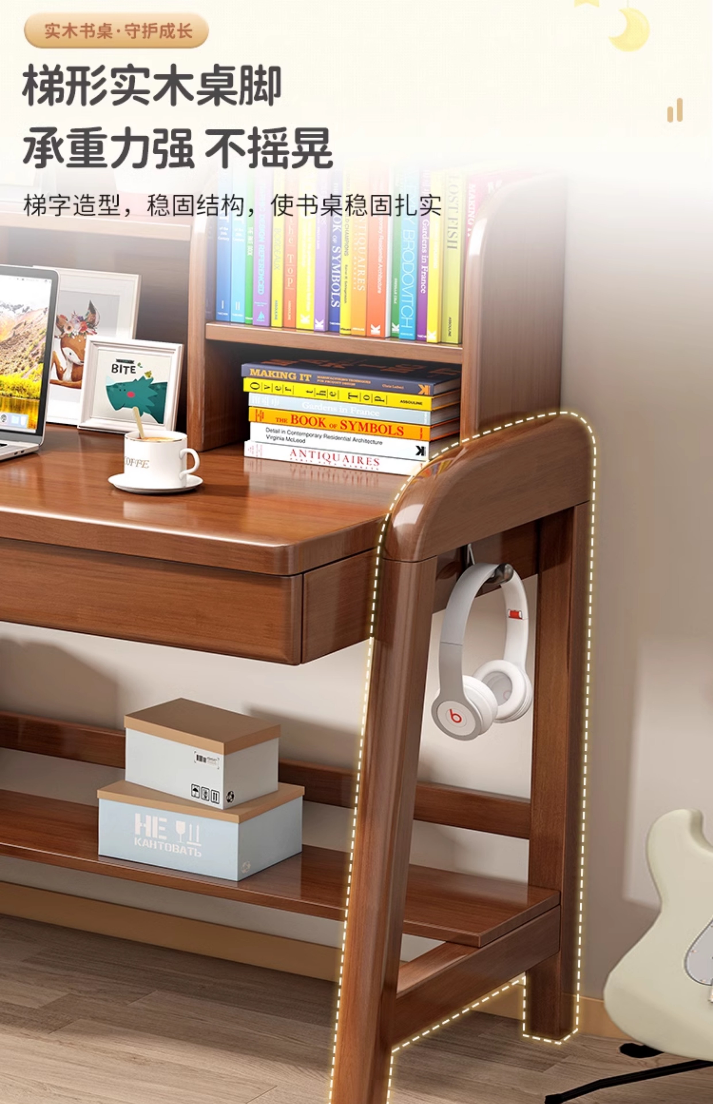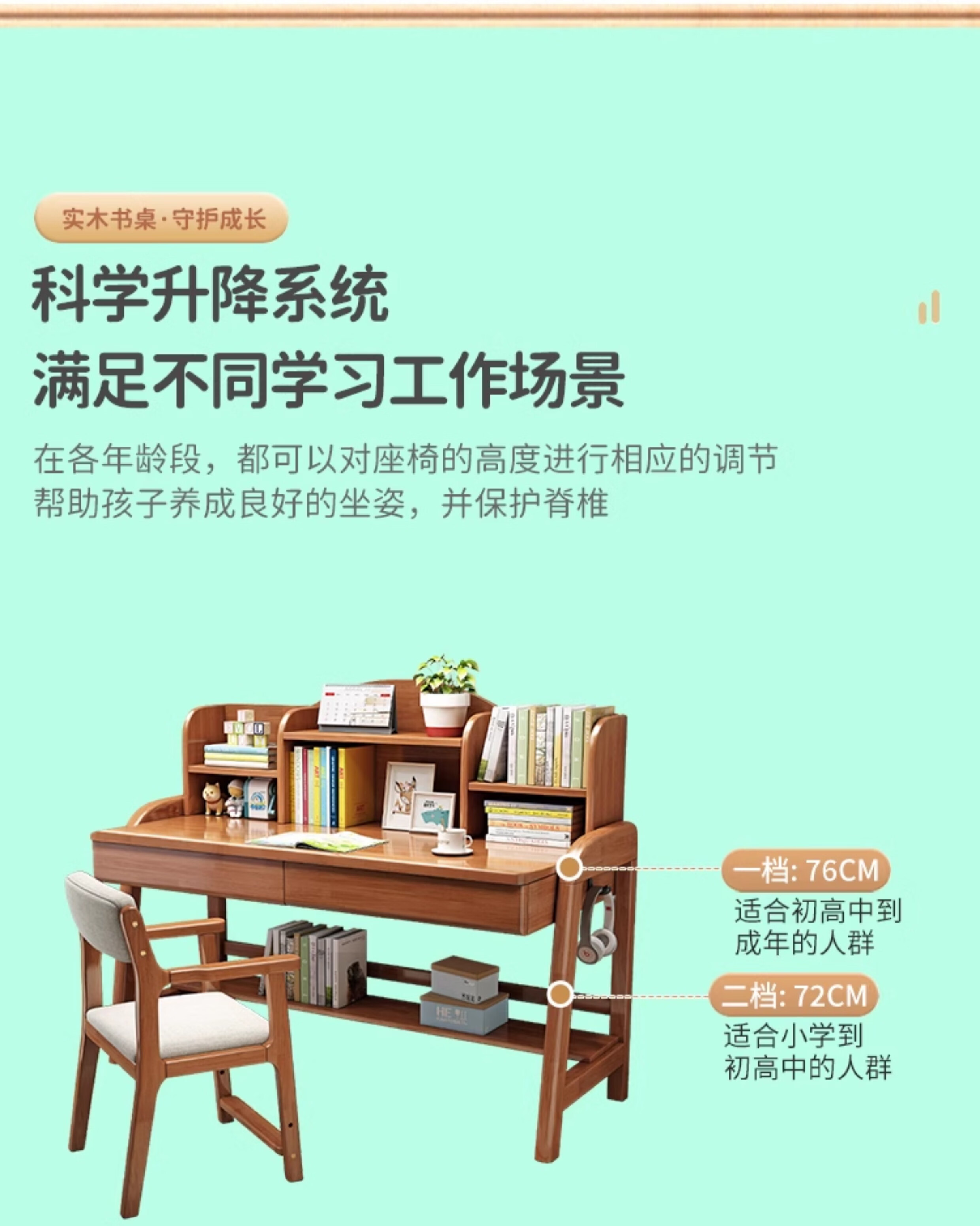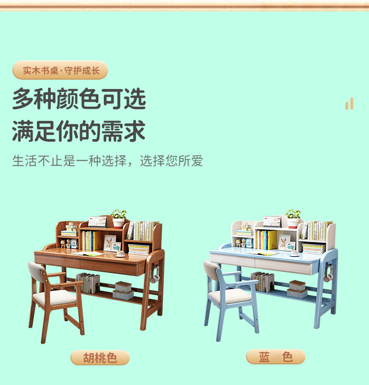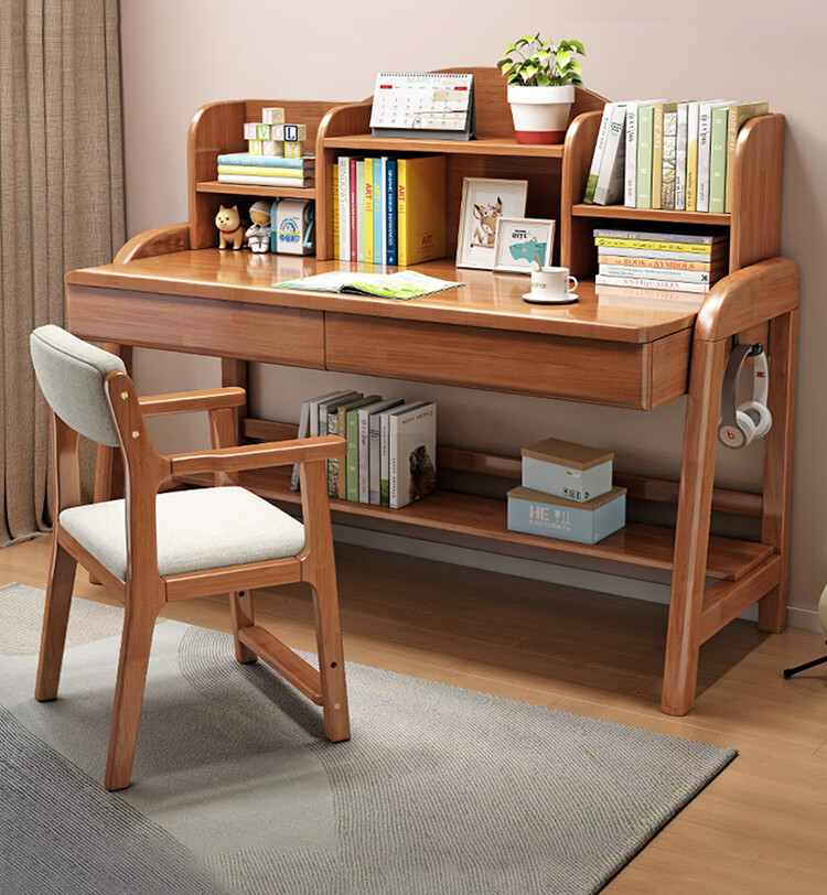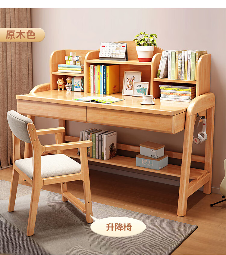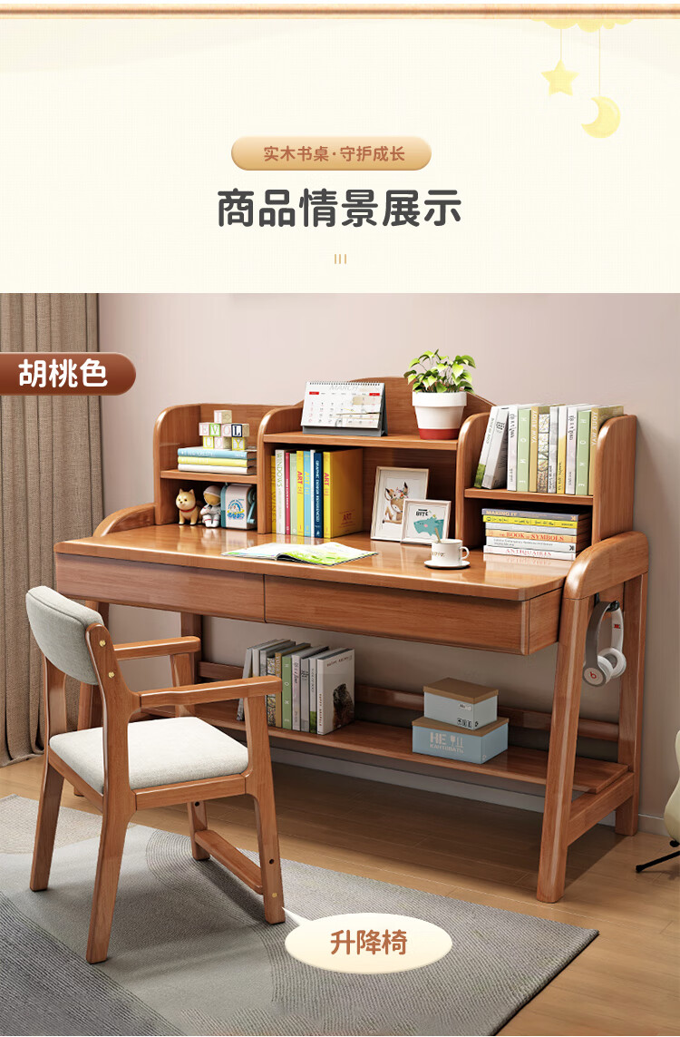 YIBOL solid wood children's study table for primary and secondary school students, home bookshelf integrated table for bedroom, liftable children's writing desk and chair, walnut color single table, imported solid wood, length 80*width 60*height 113cm