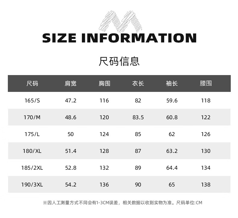 China (cm) 165 / 88-90 170 / 96-98 175 / 108-110 180 / 118-122 185 / 126-130