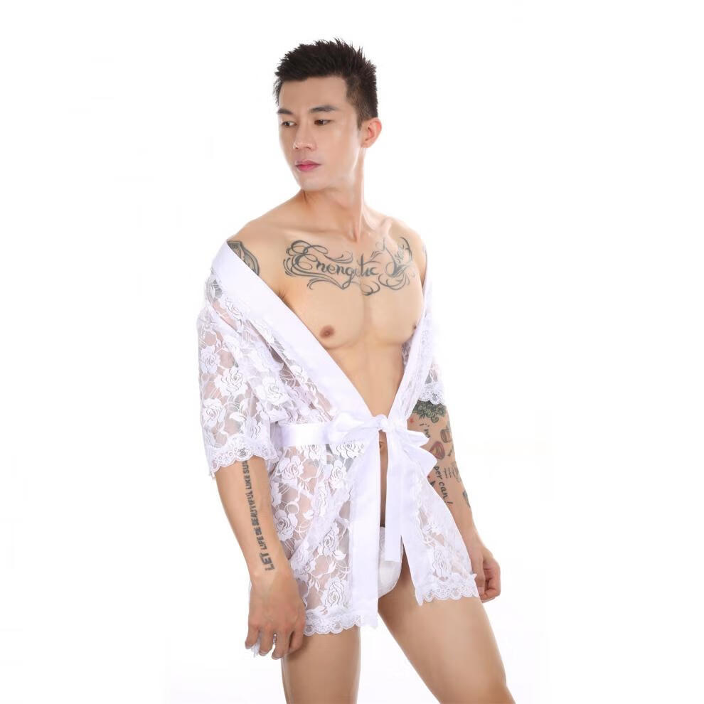Jiuai Men's Large Size Sexy Temptation Nightgown Lace Bathrobe Home Suit Comes with Thong Half Sleeve Black + Thong M _(170-175CM,60-70KG)