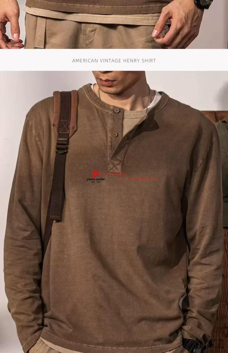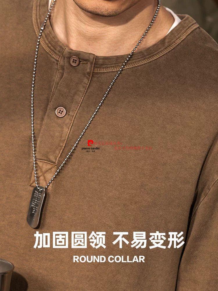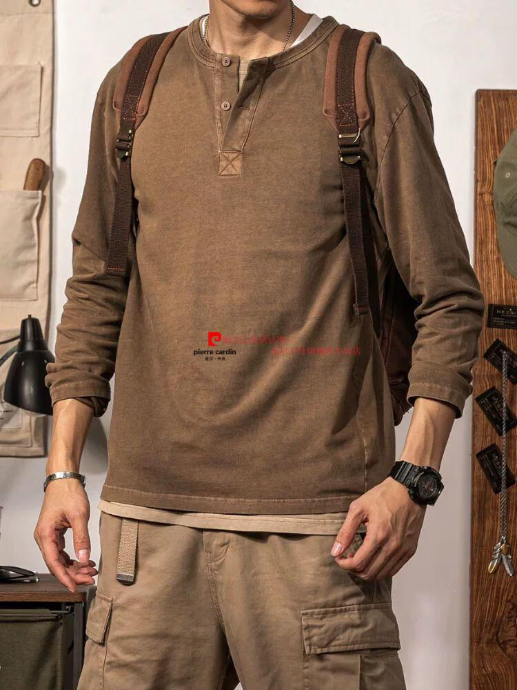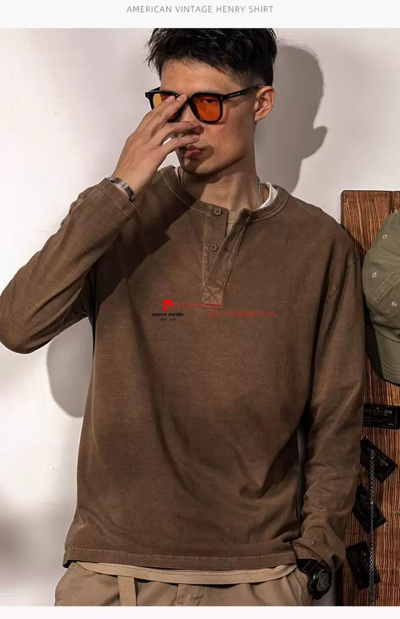 Pierre Cardin 2025 Spring and Autumn New American Retro Casual Henley Collar Long Sleeve T-Shirt Men's Versatile Simple Solid Color Bottoming Shirt Brown XL Recommended 115-145 Jin Jin equals 0.5 kg