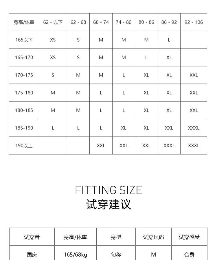 China (cm) 160-165/84-86 165-170 / 88-90 167-172 / 92-96 168-173 / 98-102 170-176 / 106-110
