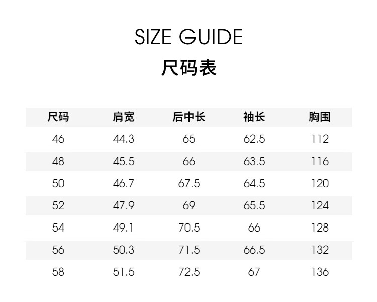China (cm) 165 / 88-90 170 / 96-98 175 / 108-110 180 / 118-122 185 / 126-130