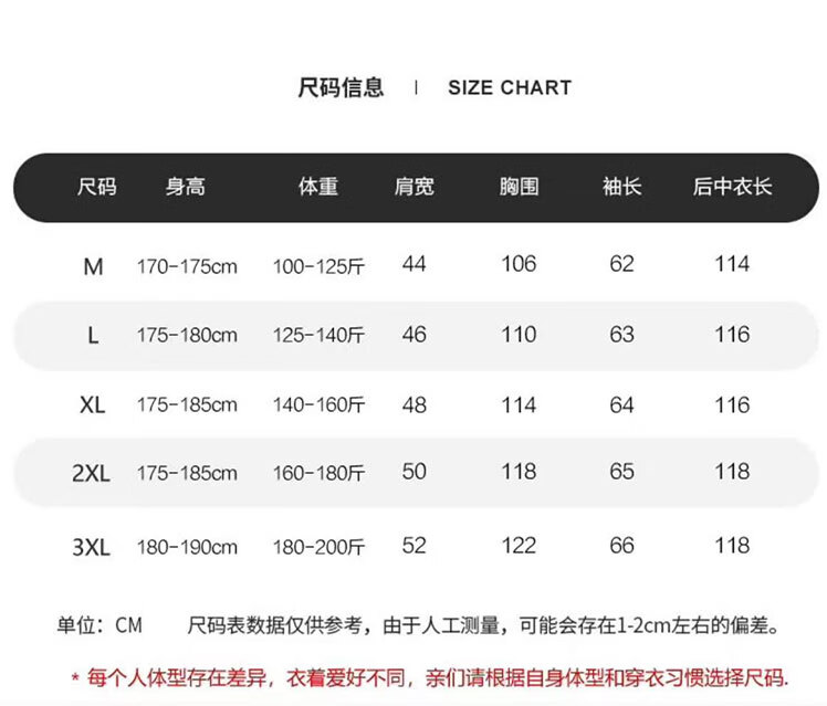 China (cm) 165 / 88-90 170 / 96-98 175 / 108-110 180 / 118-122 185 / 126-130