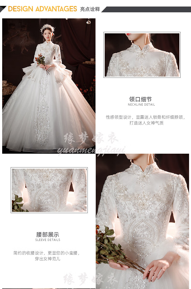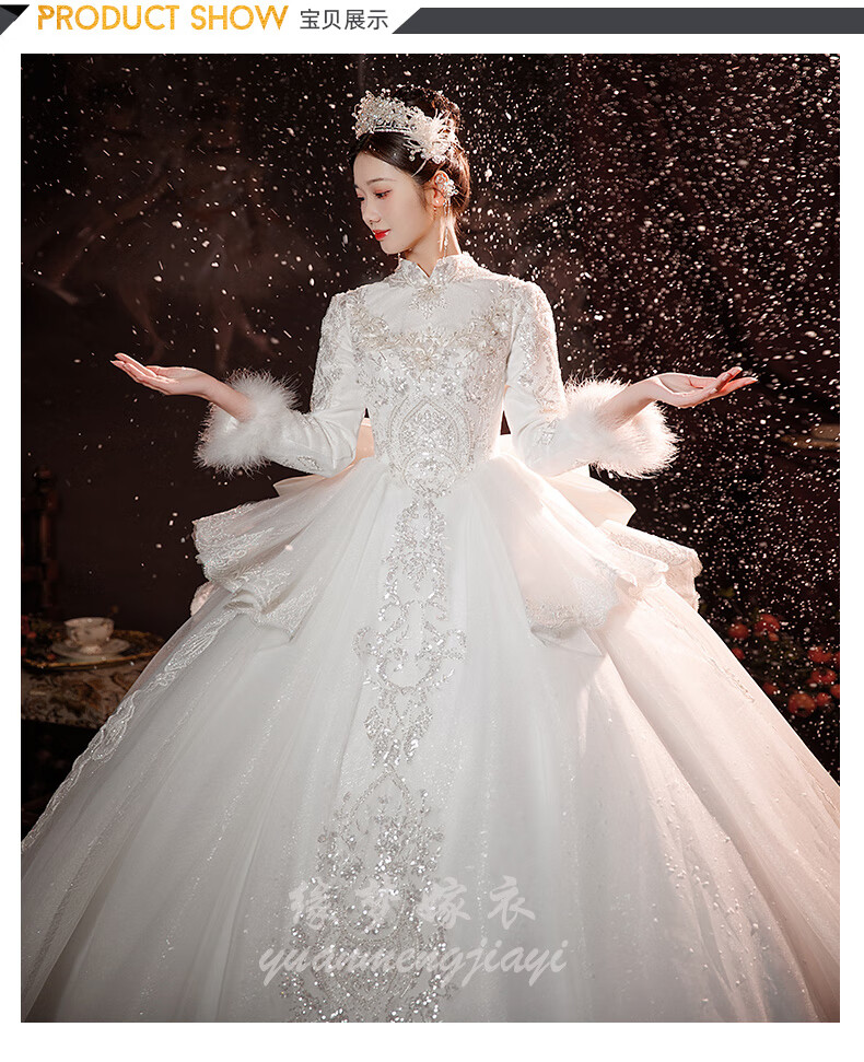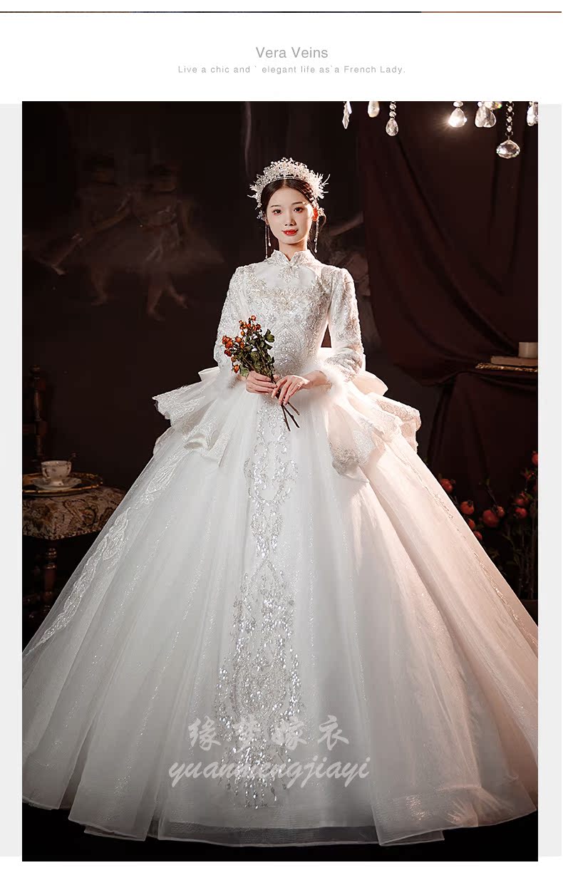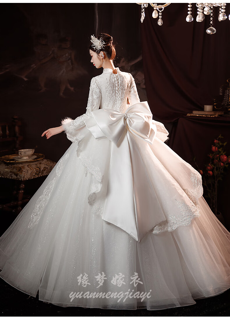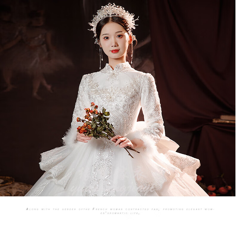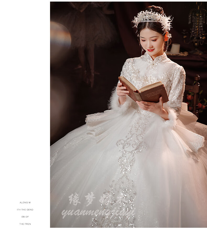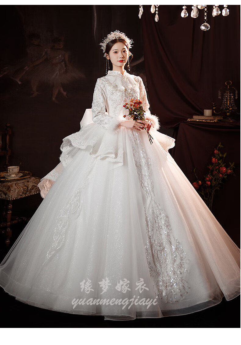 Rindu wedding dress bridal main wedding dress 2025 high-end winter main wedding dress 2025 new bridal French bow long-sleeved autumn floor-length wedding dress + three-piece set + 1.5 meter veil + gloves + bustle S S90Jin Jin is equal to about 0.5 kg