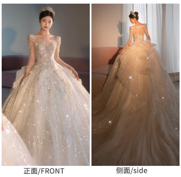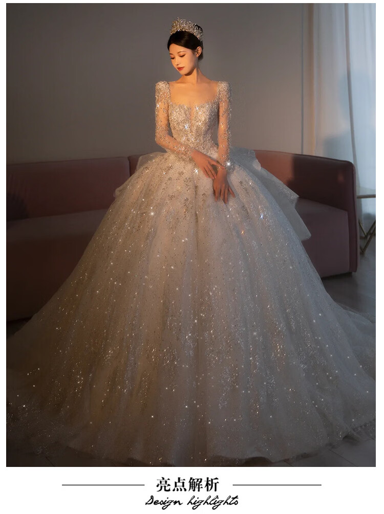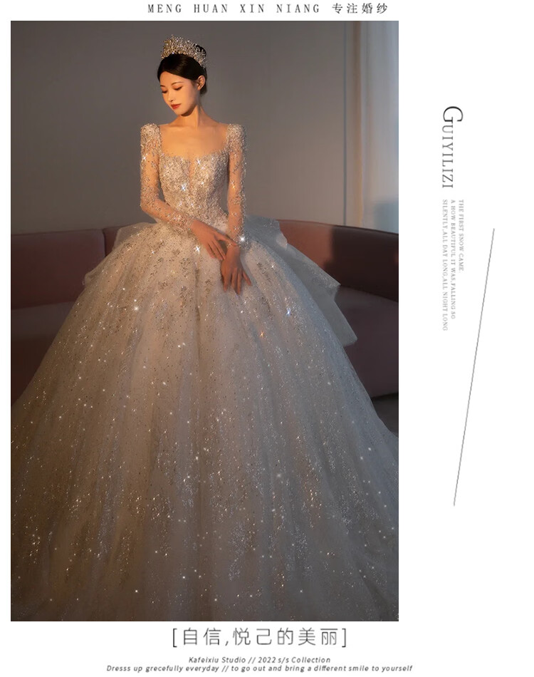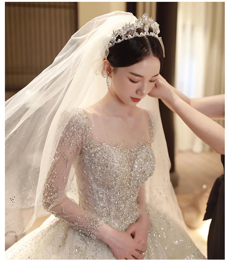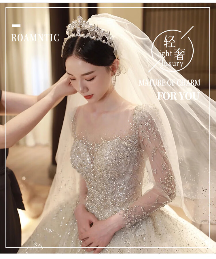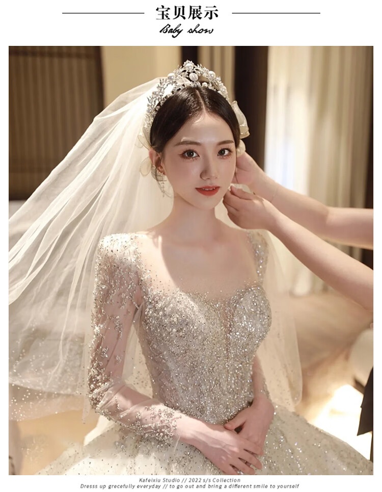Rindu wedding dress bridal main yarn 2025 high-end winter long-sleeved heavy industry wedding dress 2025 new high-end French main yarn white white floor-length style comes with gloves + veil + skirt support S Weight 90Jin Jin is equal to about 0.5 kg