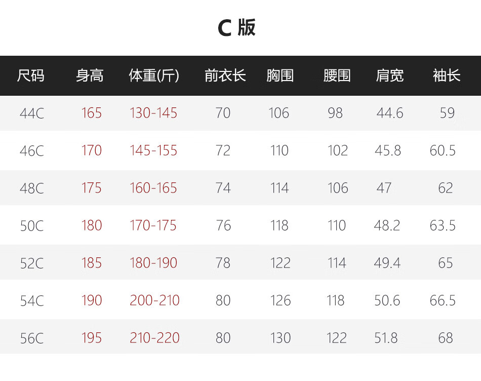China (cm) 160-165/84-86 165-170 / 88-90 167-172 / 92-96 168-173 / 98-102 170-176 / 106-110