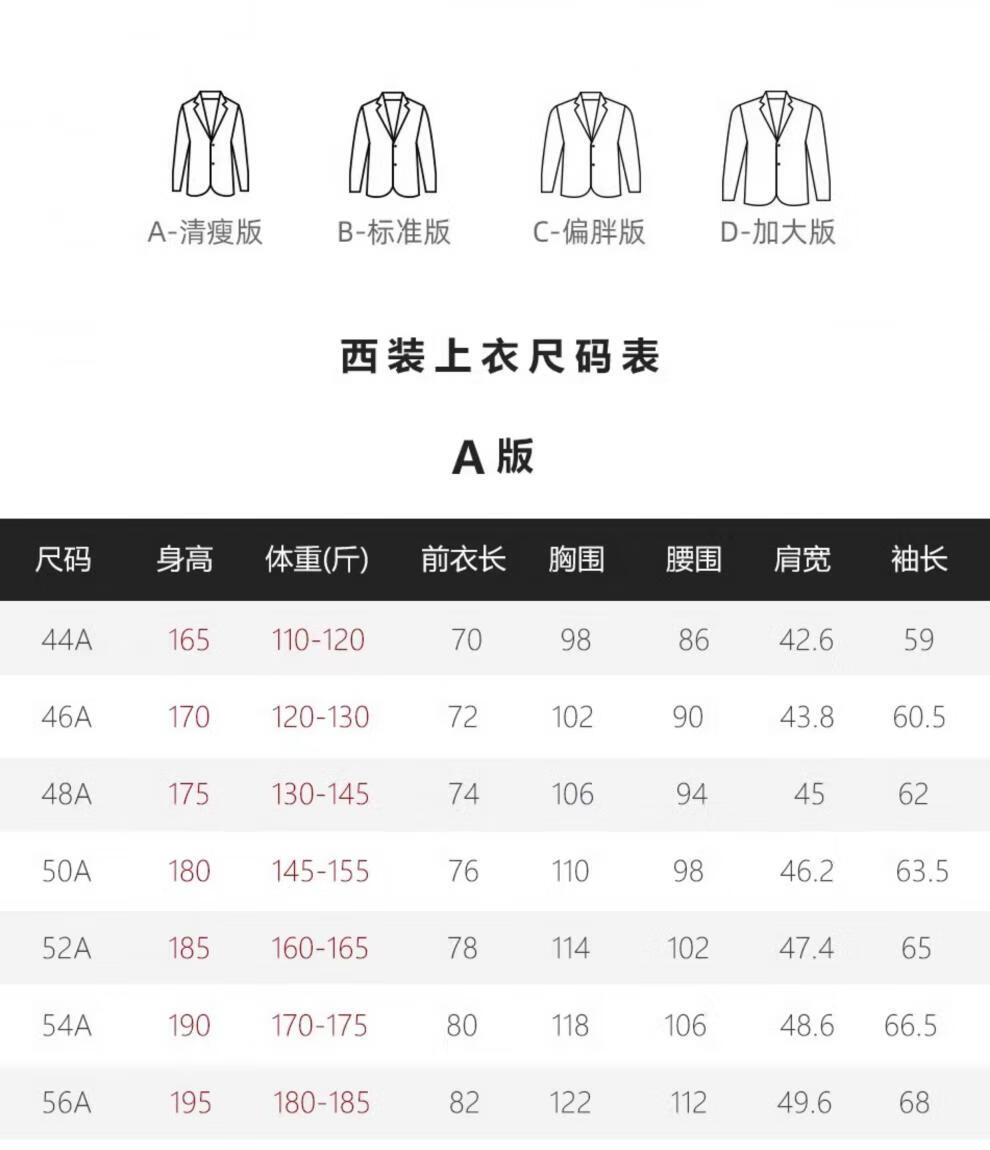 China (cm) 165 / 88-90 170 / 96-98 175 / 108-110 180 / 118-122 185 / 126-130