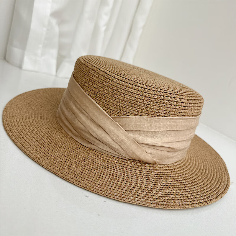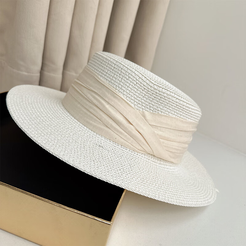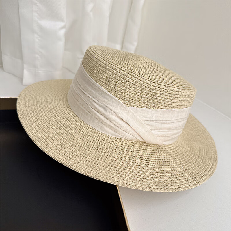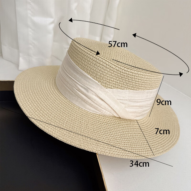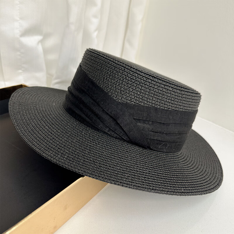 Grosfairy French flat-top sunshade straw hat for women summer hat sun protection sun hat for beach travel straw big-brimmed beach hat MIUIN webbing-black
