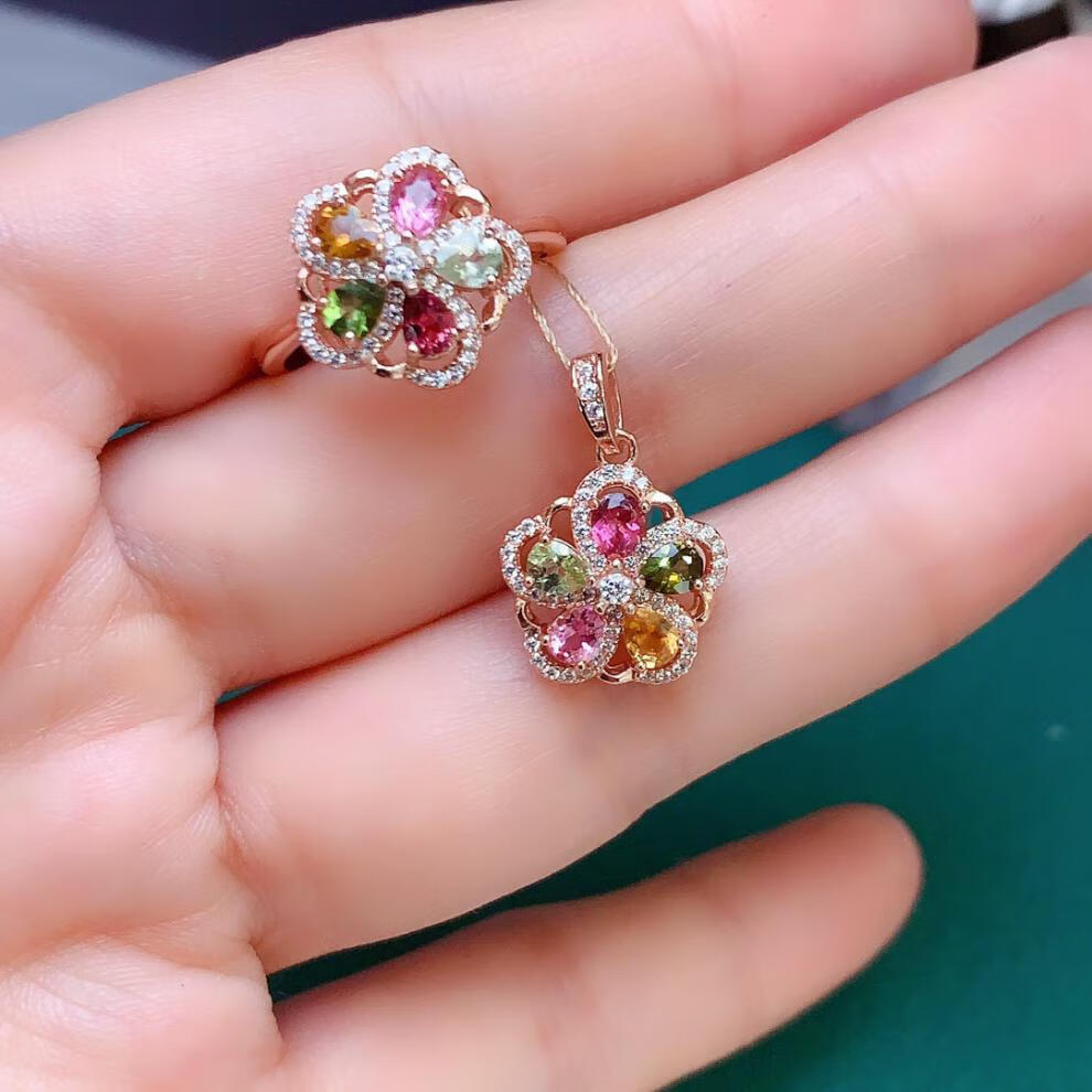 Shimei 2025 Spring and Summer New Natural Tourmaline Flower Pendant Ring Set 925 Silver Inlaid Luxurious Temperament Jewelry Women's Tourmaline Pendant