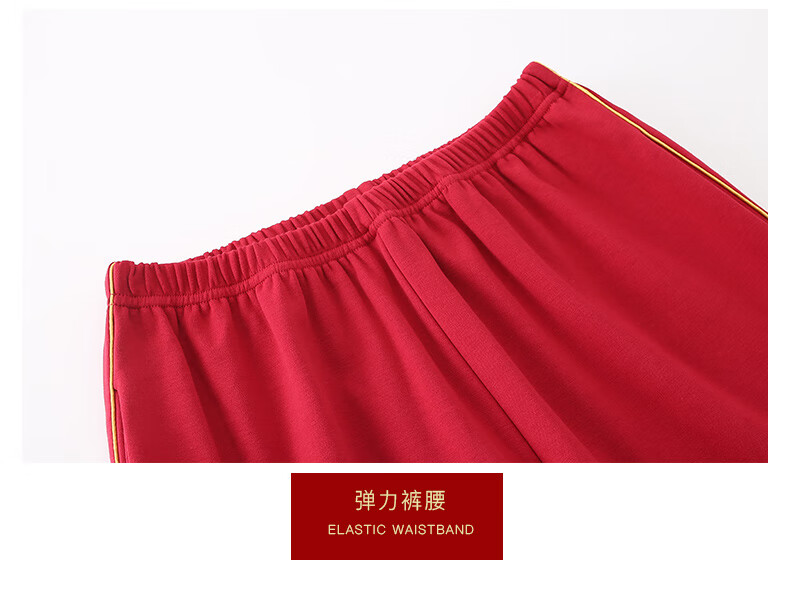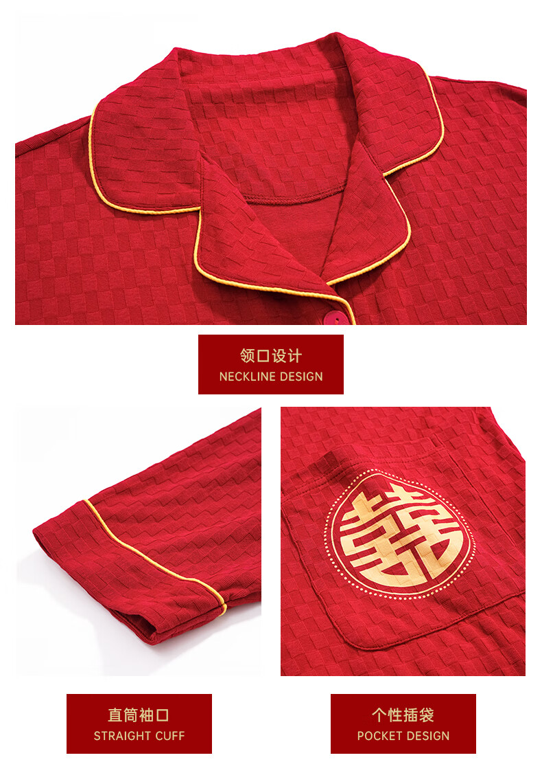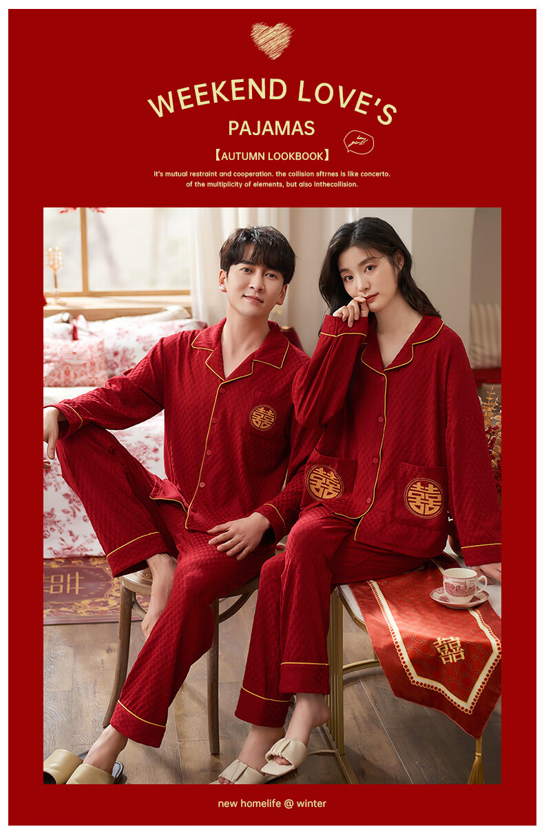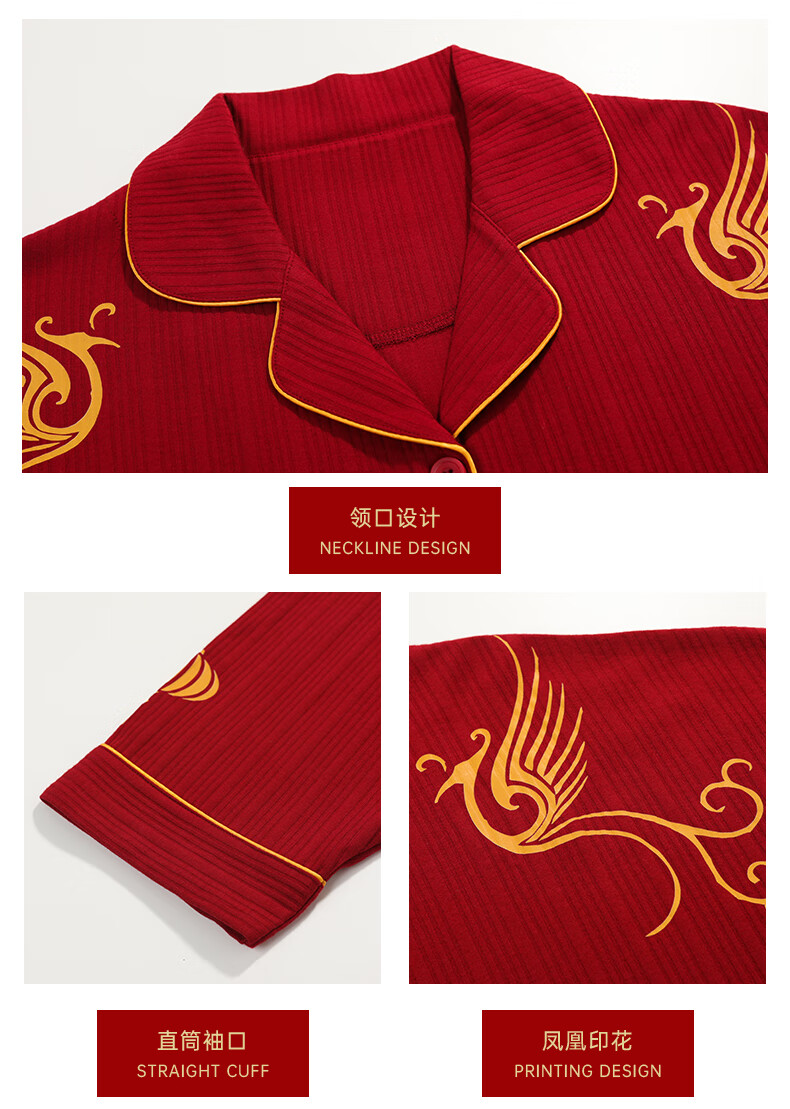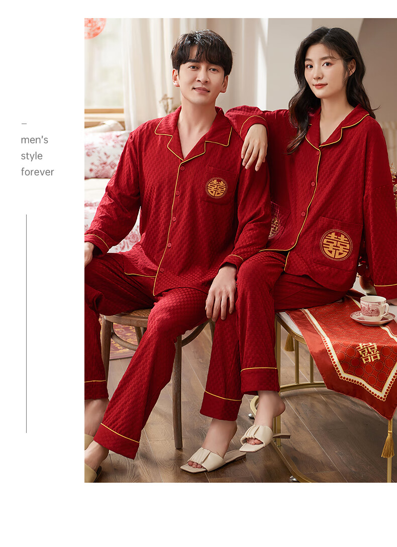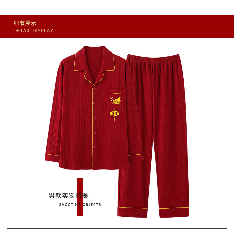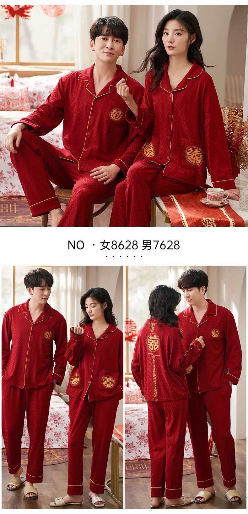 Pure cotton breathable couple pajamas red festive wedding home clothes lapel long sleeves trousers new suit animal year 66389 female bright red pure cotton pajamas M