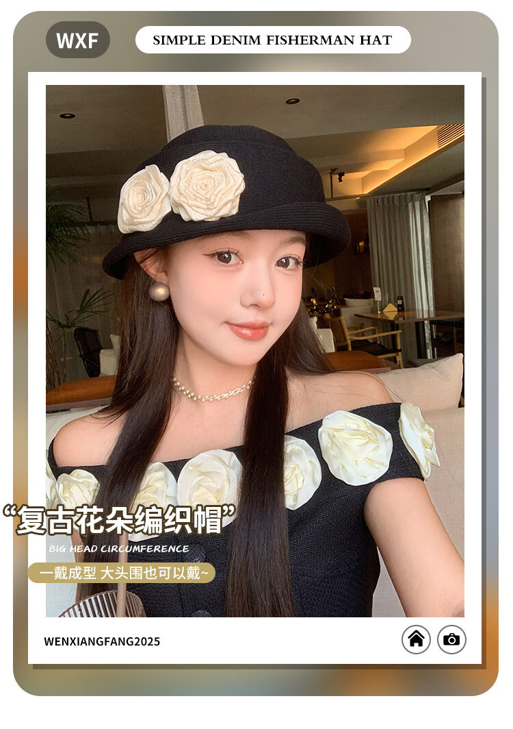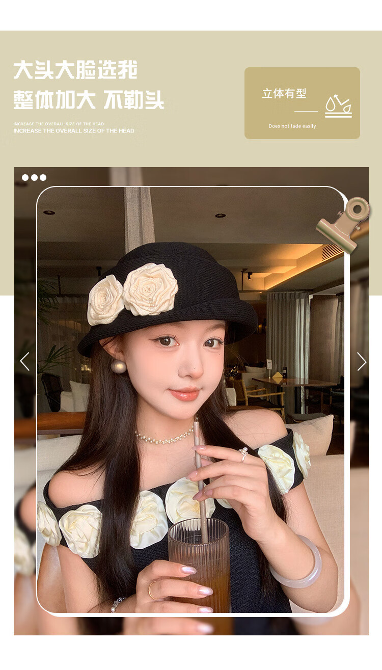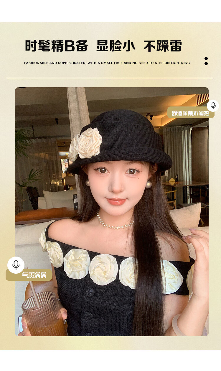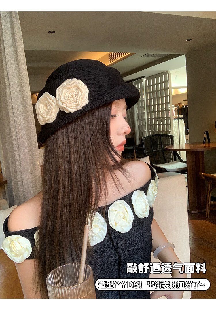 QUEEN TRIP French Elegant Flower Thousand Gold Top Hat Women's Summer Thin Breathable Big Head Circumference Showing Face Small Hepburn Style Beret Hat Flower Top Hat - Black