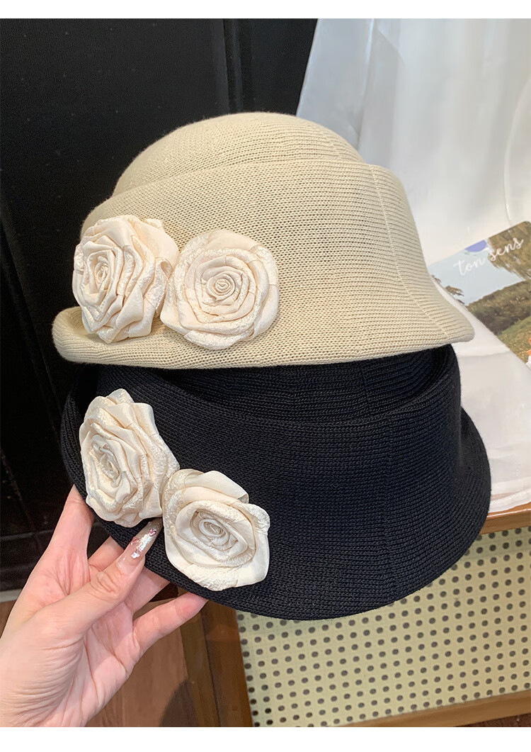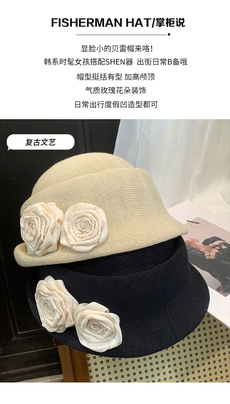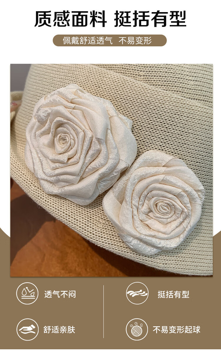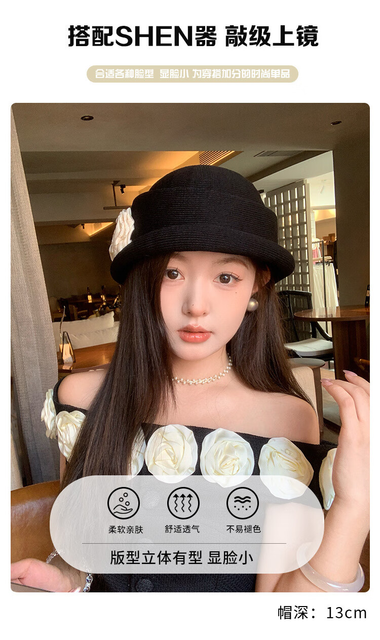 QUEEN TRIP French Elegant Flower Thousand Gold Top Hat Women's Summer Thin Breathable Big Head Circumference Showing Face Small Hepburn Style Beret Hat Flower Top Hat - Black