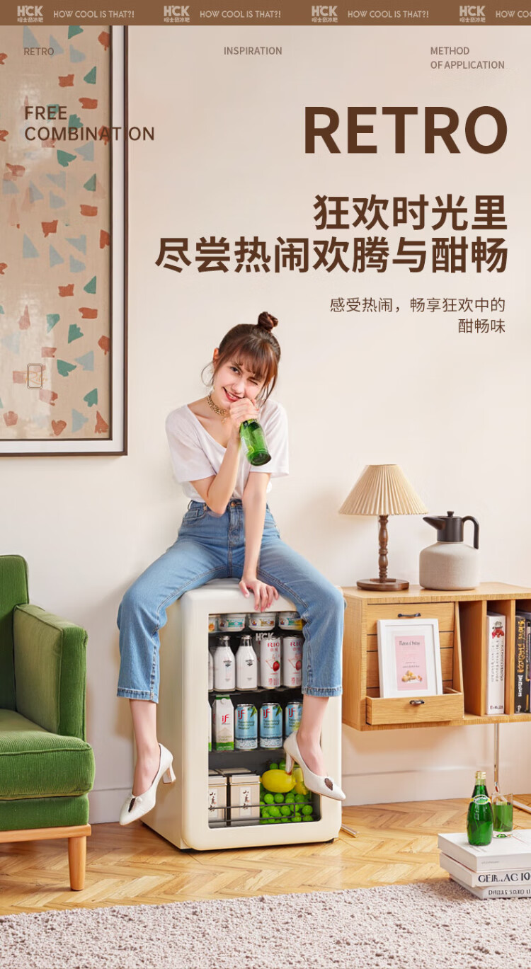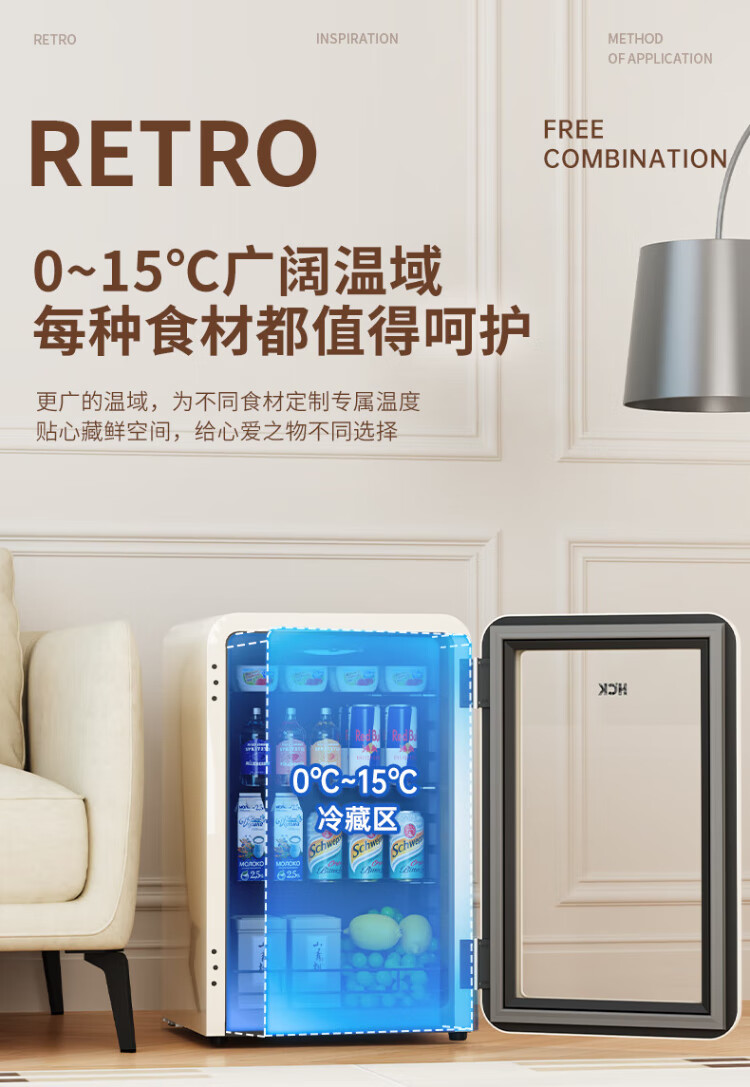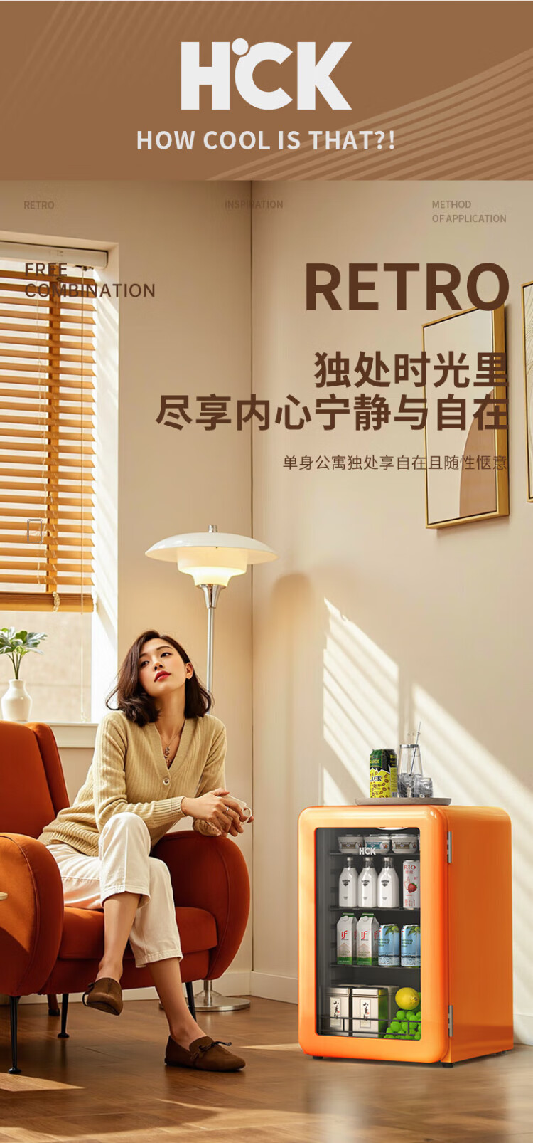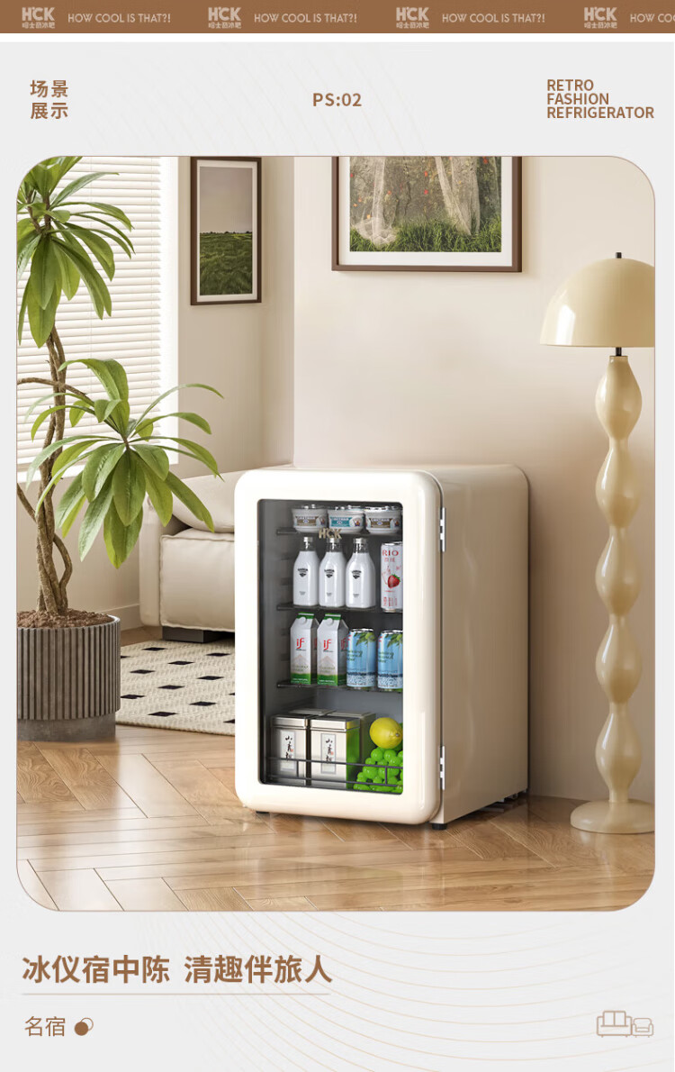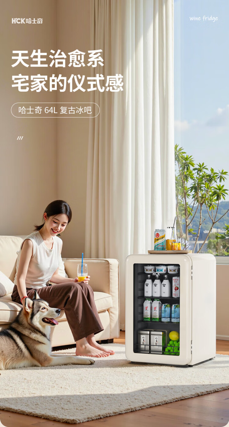HCK Husky Ice Bar Up to 20% Subsidy Small Mini Refrigerator Retro Small Refrigerator Glass Door 70RB Hotel Apartment B&B Refrigerator Tea Refrigerated Beverage Cabinet Moni Orange Fully Refrigerated 64L | Electronic Temperature Control 64L First Level Energy Efficiency