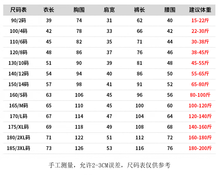 China (cm) 165 / 88-90 170 / 96-98 175 / 108-110 180 / 118-122 185 / 126-130