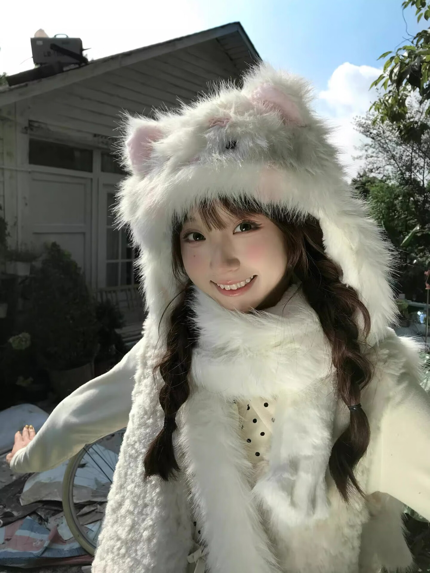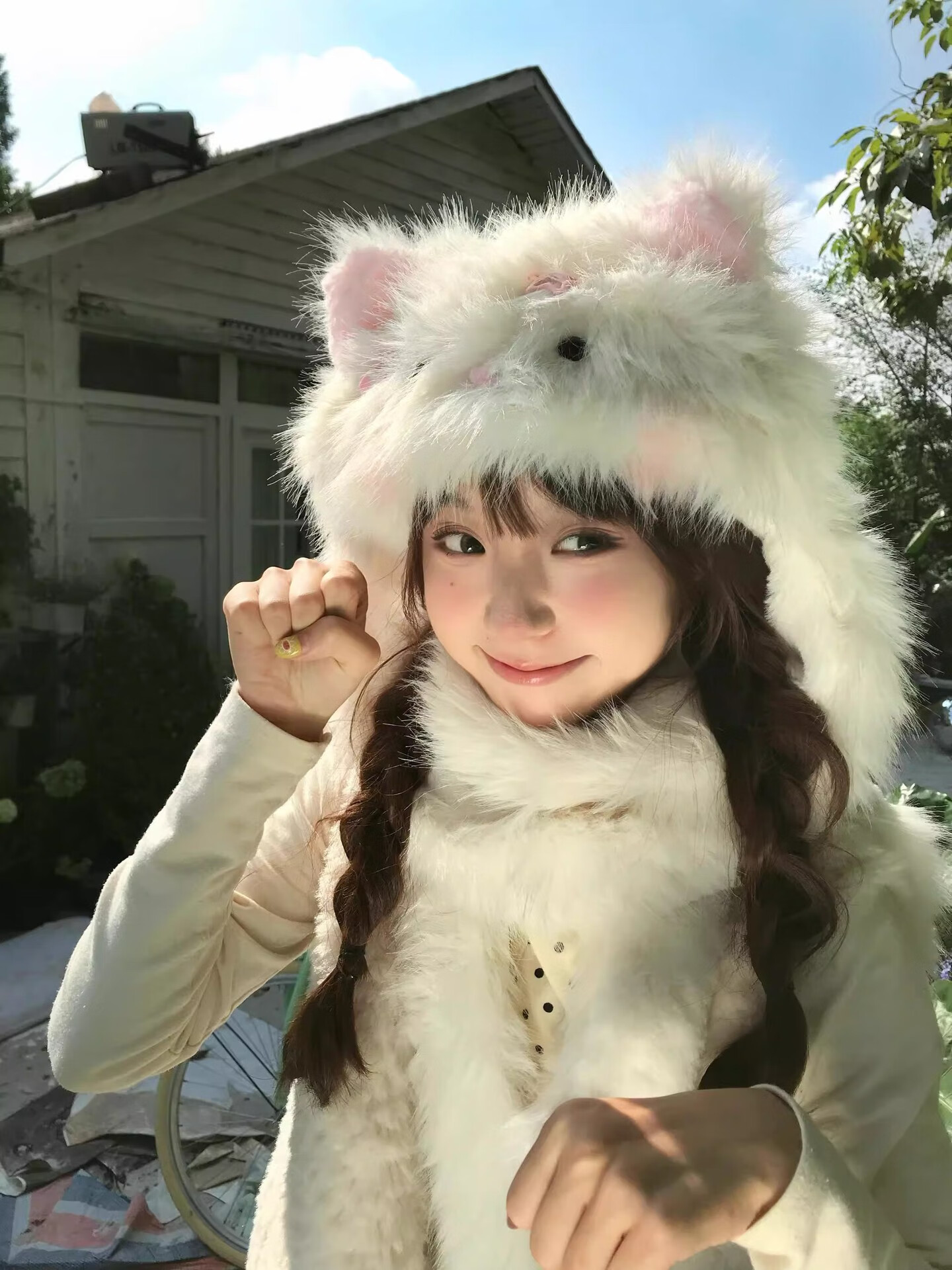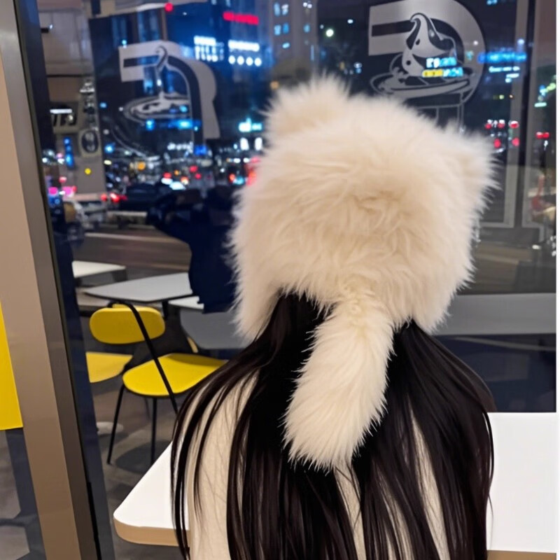 Tuzun Kitten Tail Hat Cute Cat Ears Ear Protection Plush Hat Warm Hat for Traveling and Taking Photos Women Winter Cat Ears Hat and Scarf All-in-one