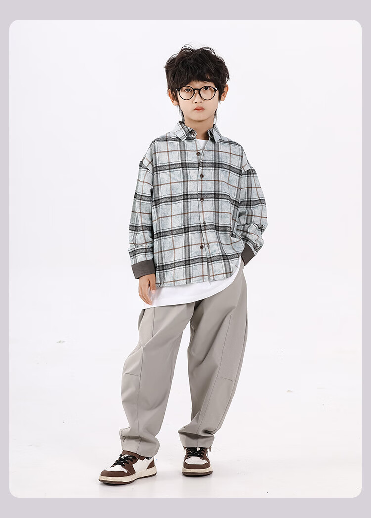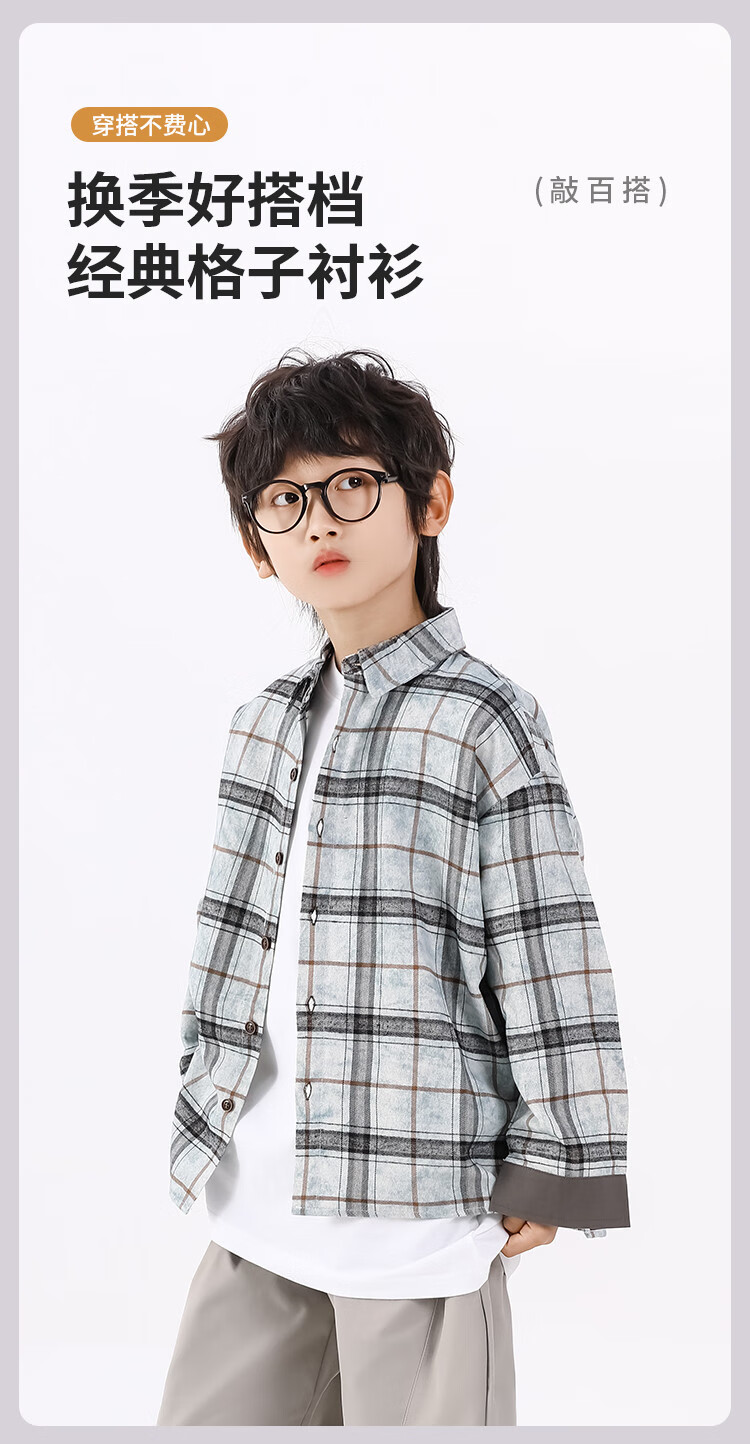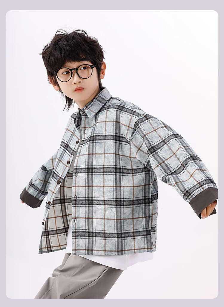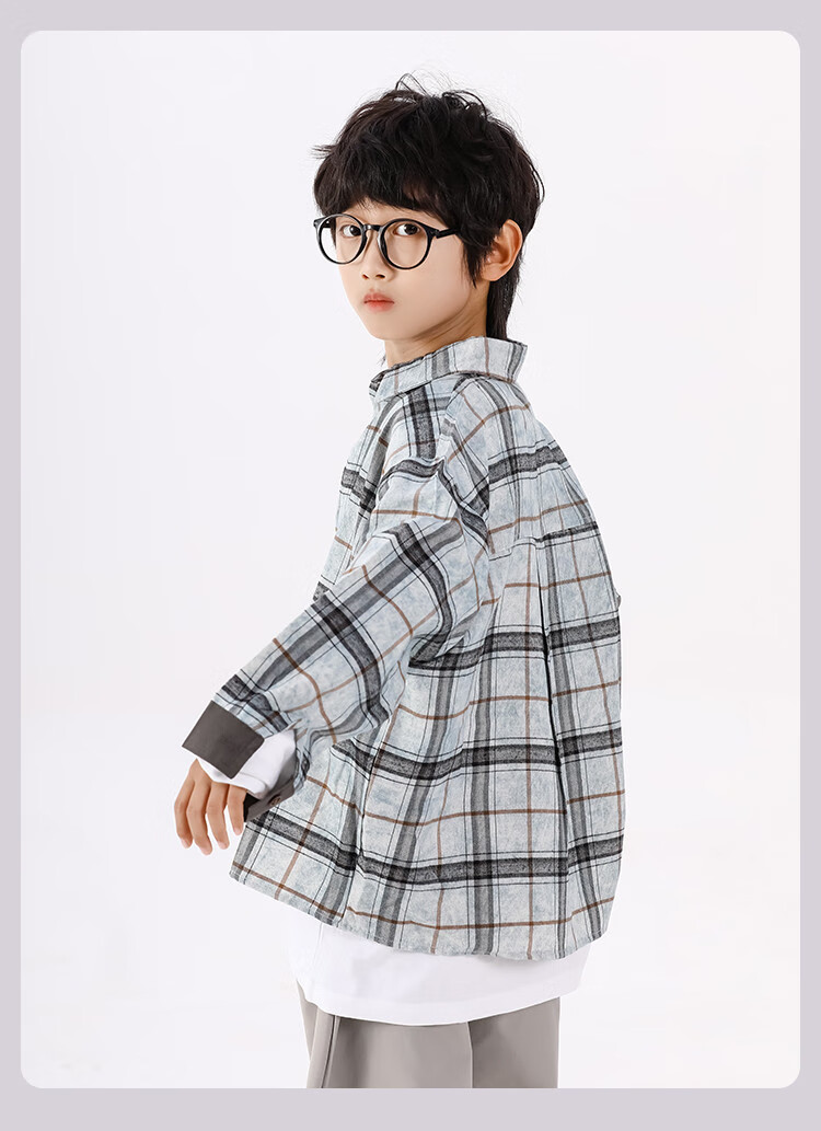 25 years of contrasting plaid loose shirt for boys in spring and autumn, versatile classic casual and comfortable top for older children, blue gray 130