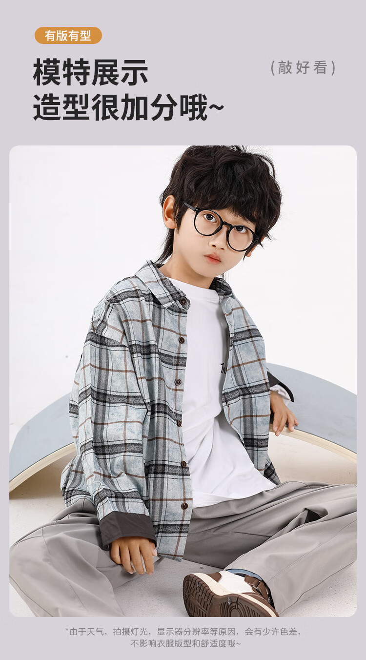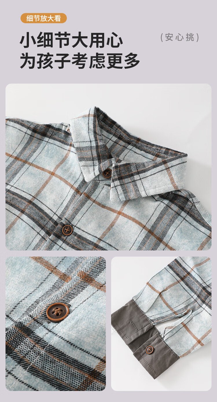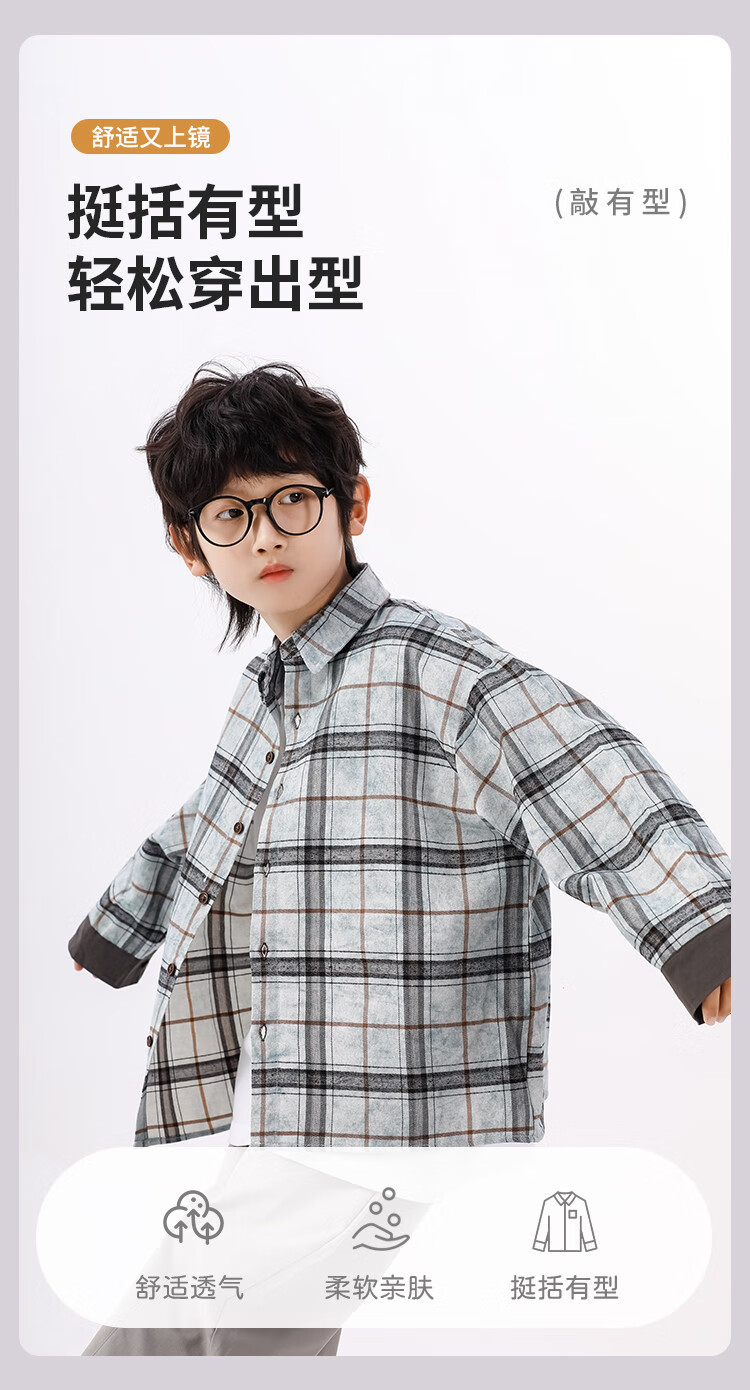25 years of contrasting plaid loose shirt for boys in spring and autumn, versatile classic casual and comfortable top for older children, blue gray 130