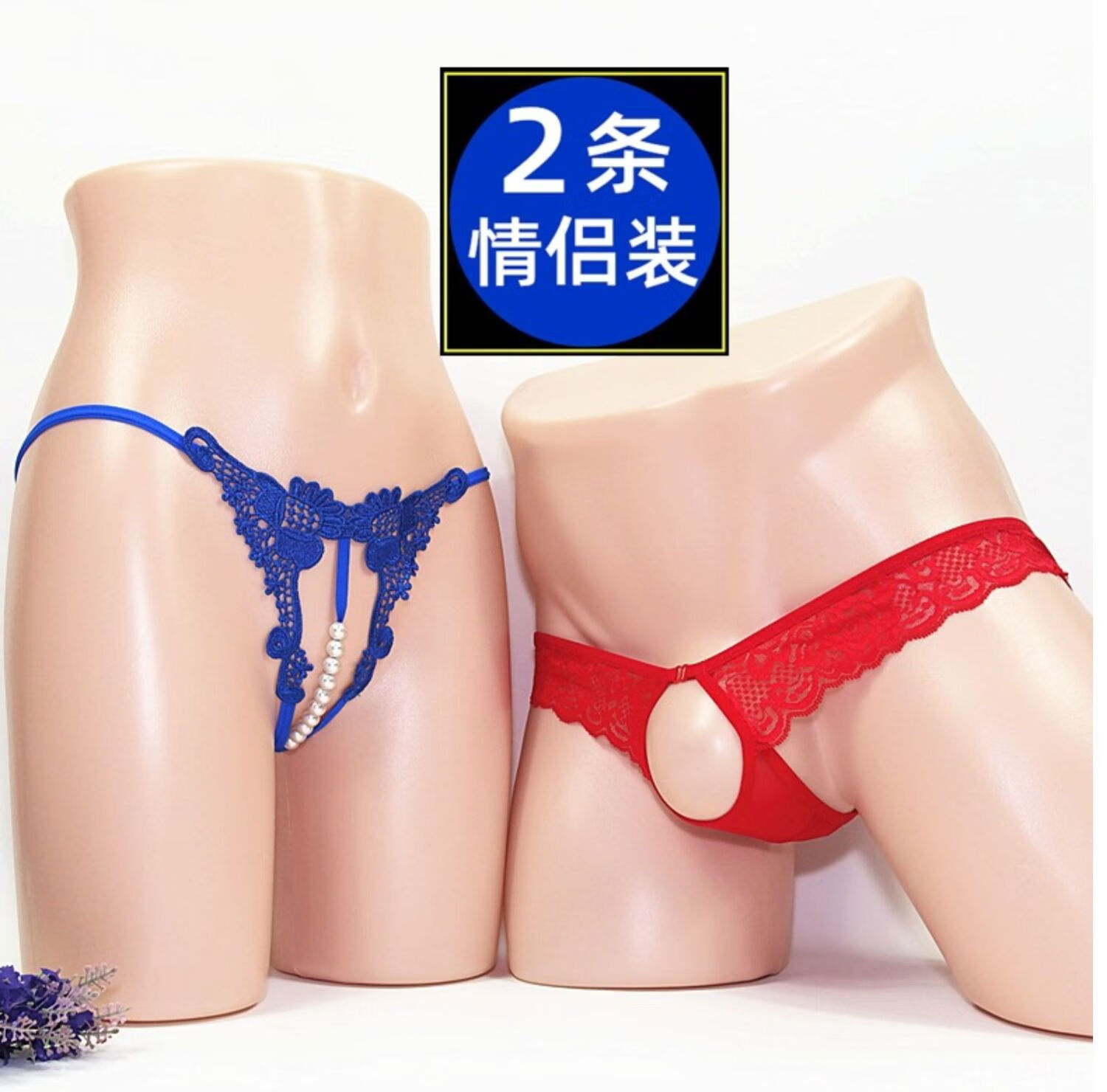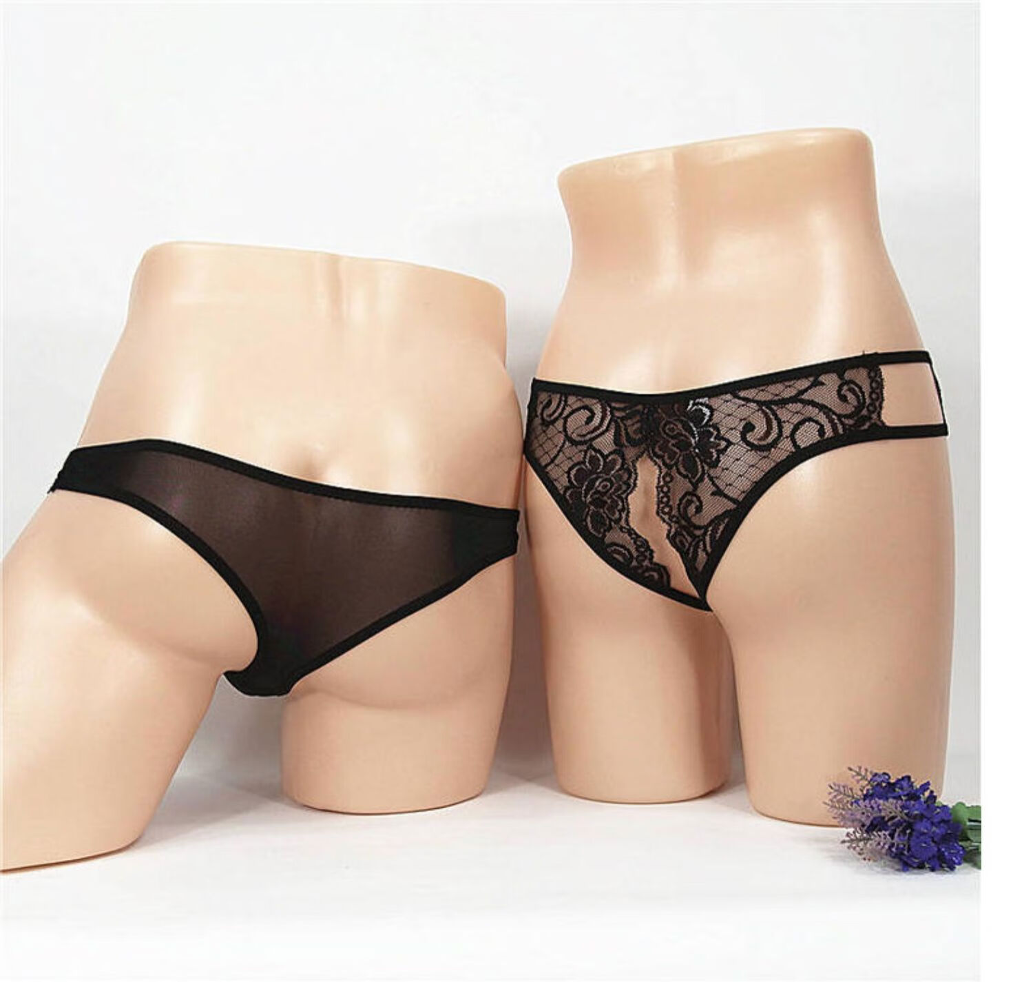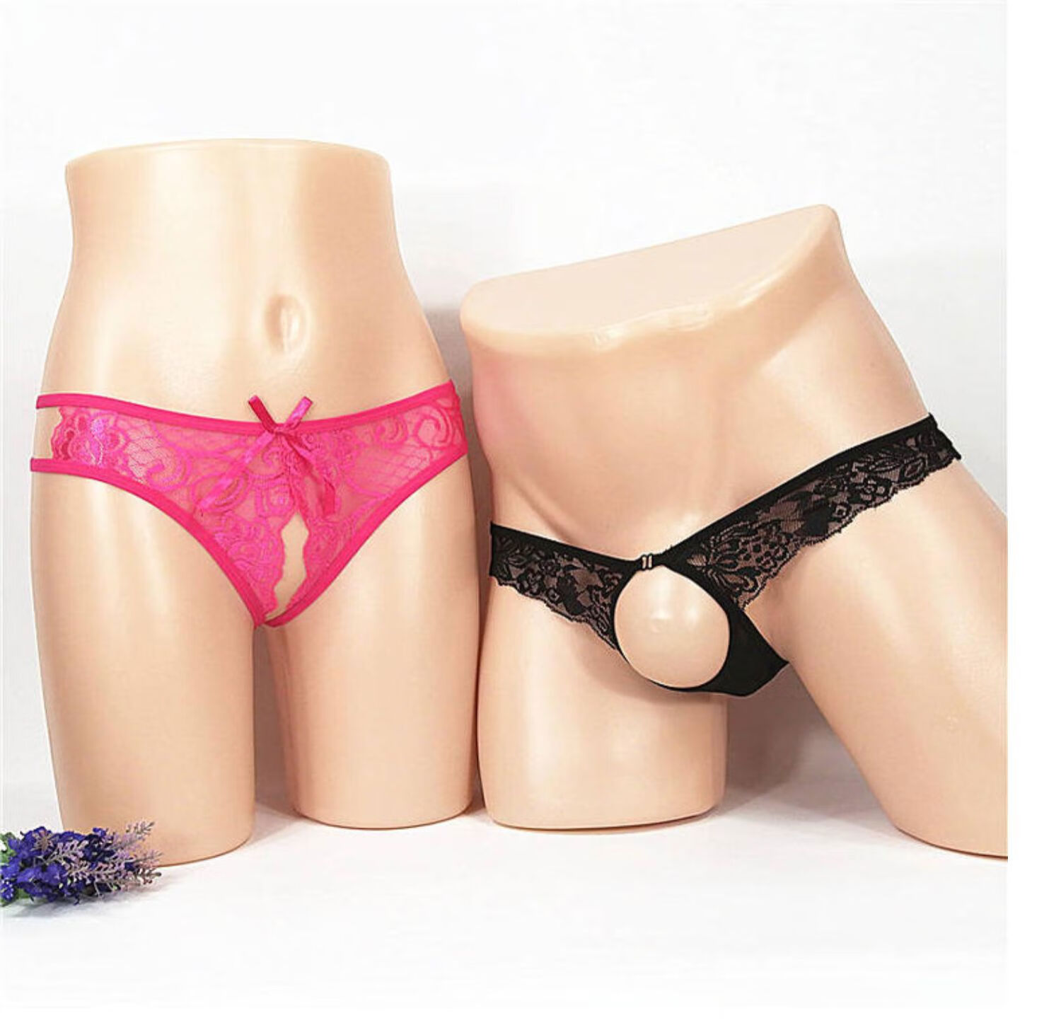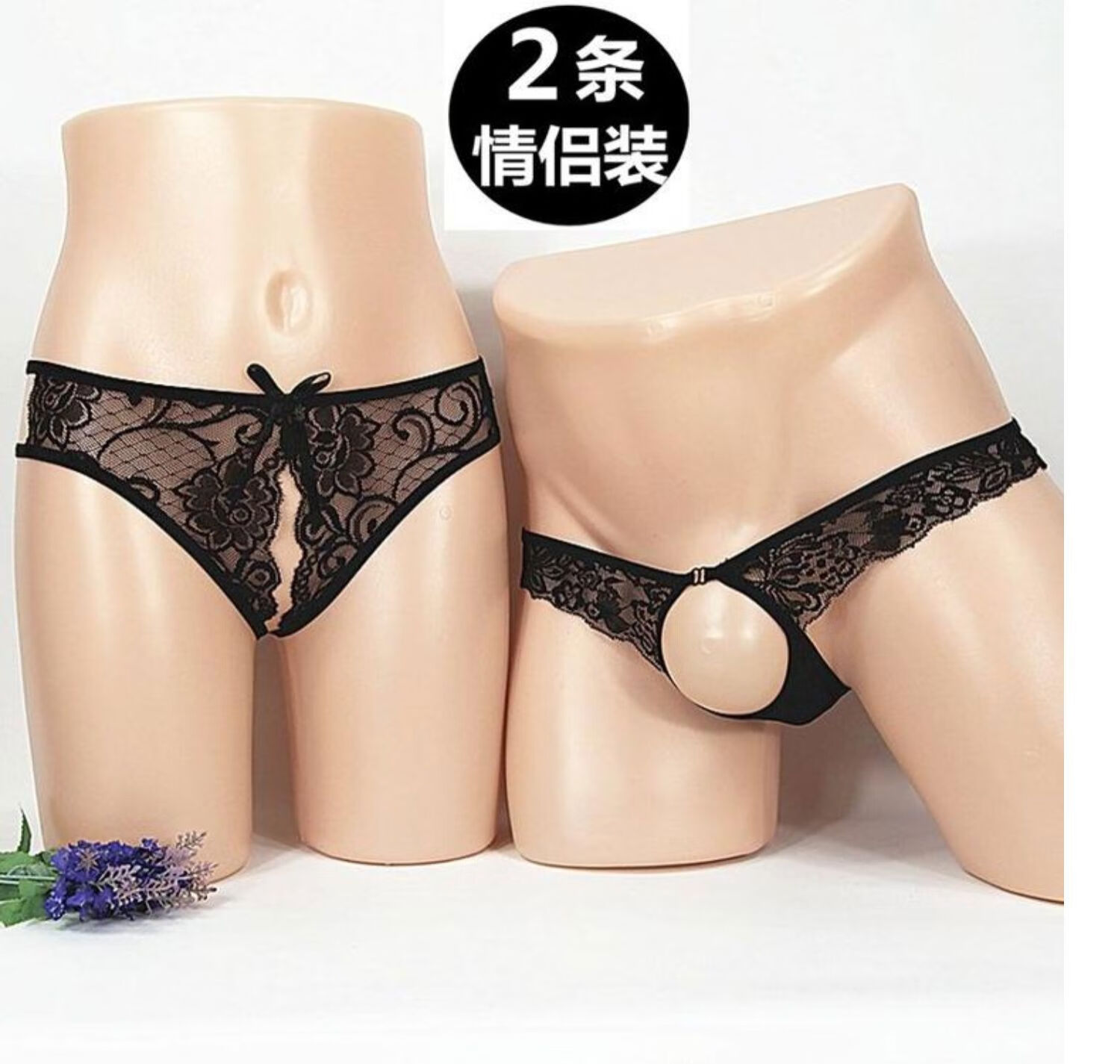 Couple's underwear double sexy women's crotch opening men's penis exposed JJ thong panties transparent sexy pearl black one size