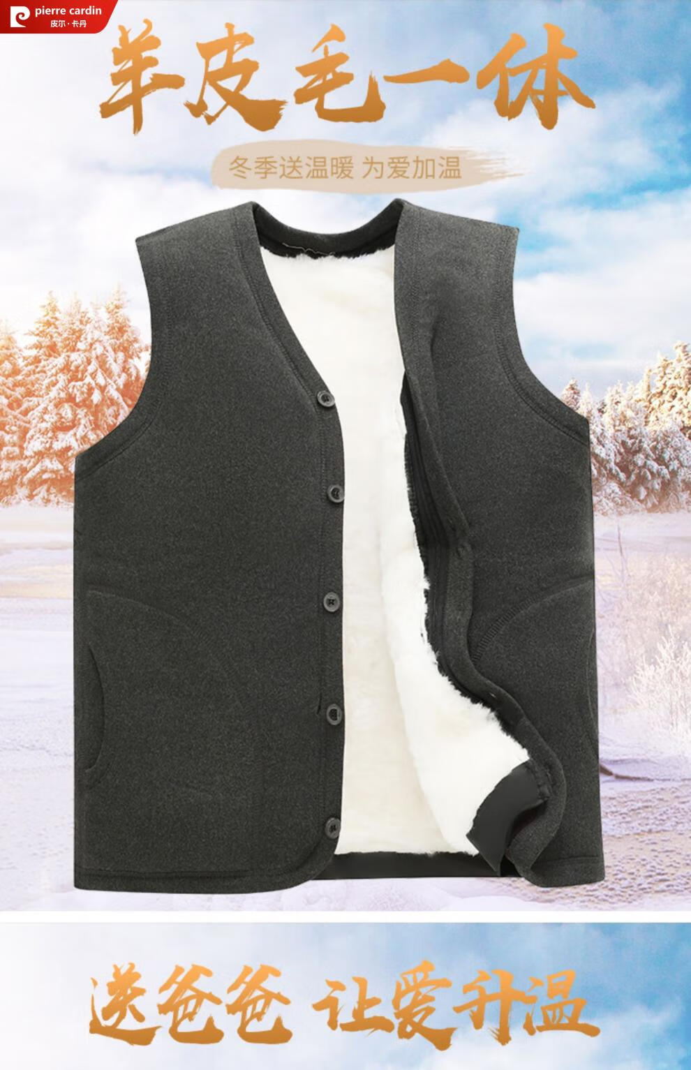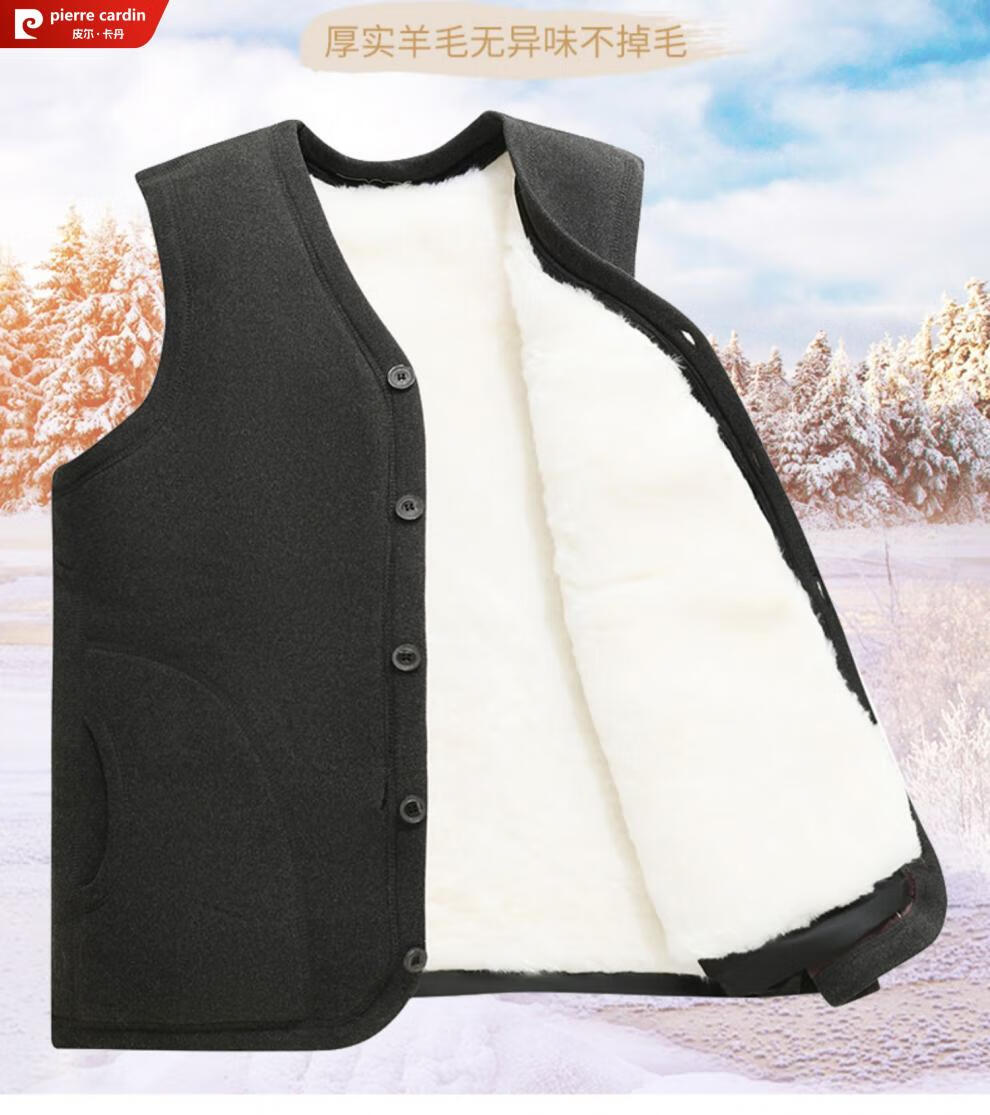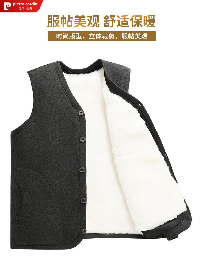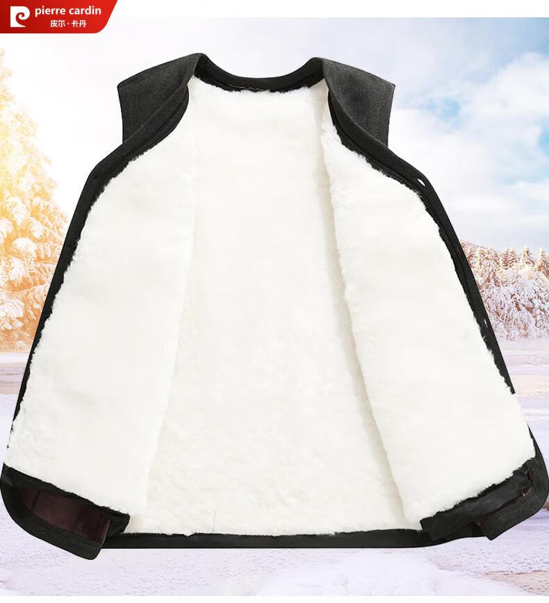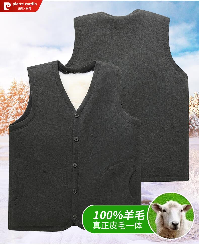皮尔卡丹羊毛马甲皮毛一体男加绒加厚开衫中老年爸爸装冬季保暖背心棉马夹 灰色 (羊皮毛一体) 3XL (建议120-150斤)