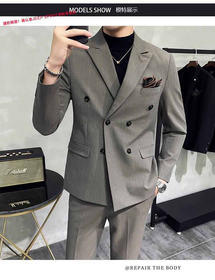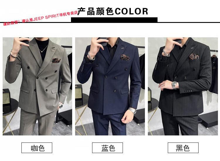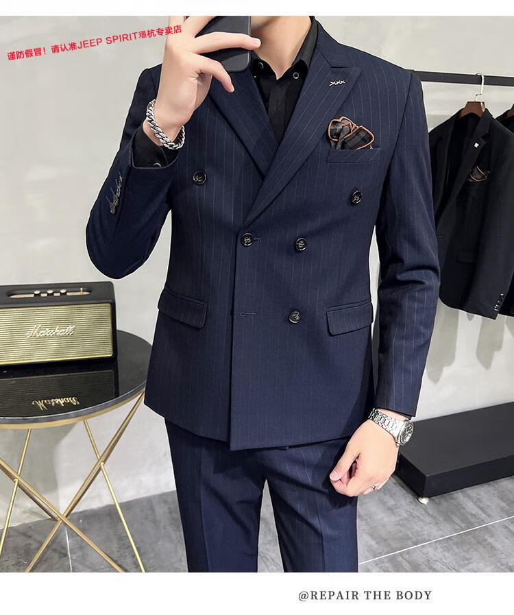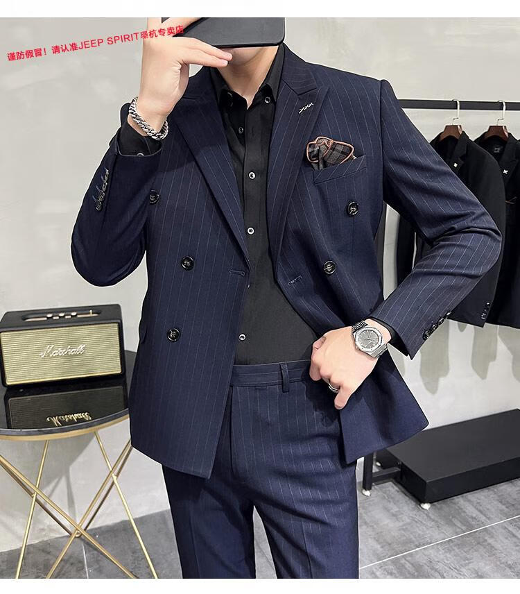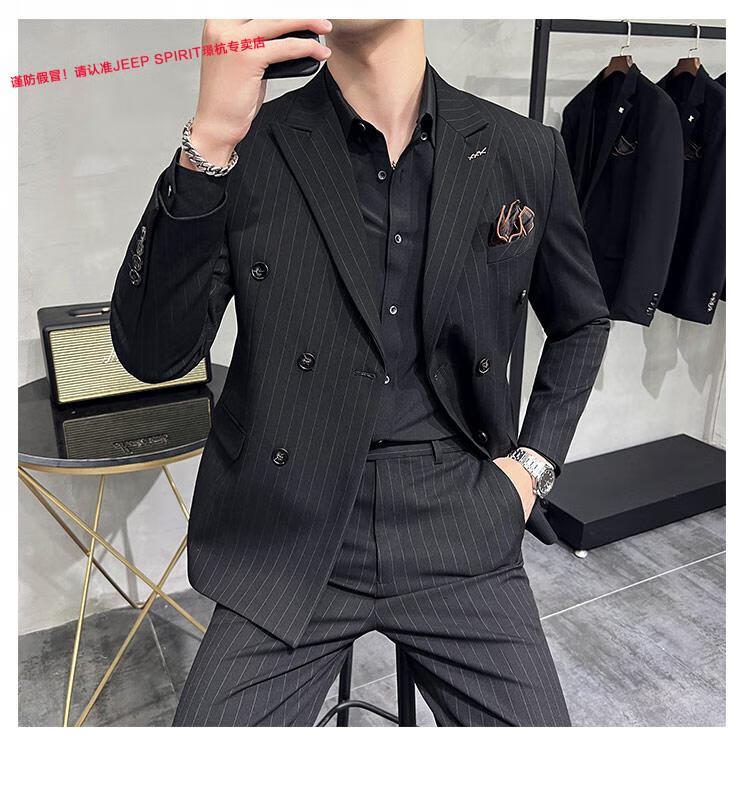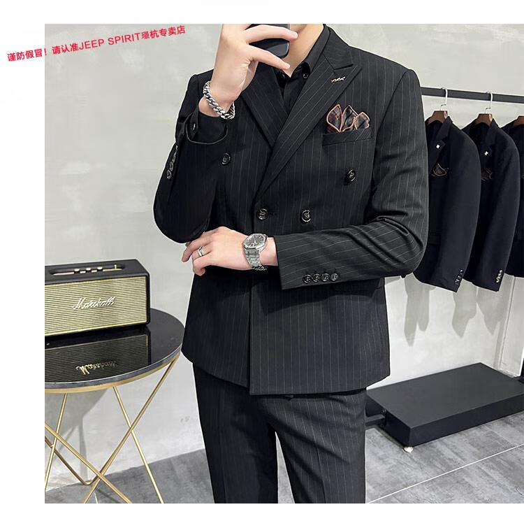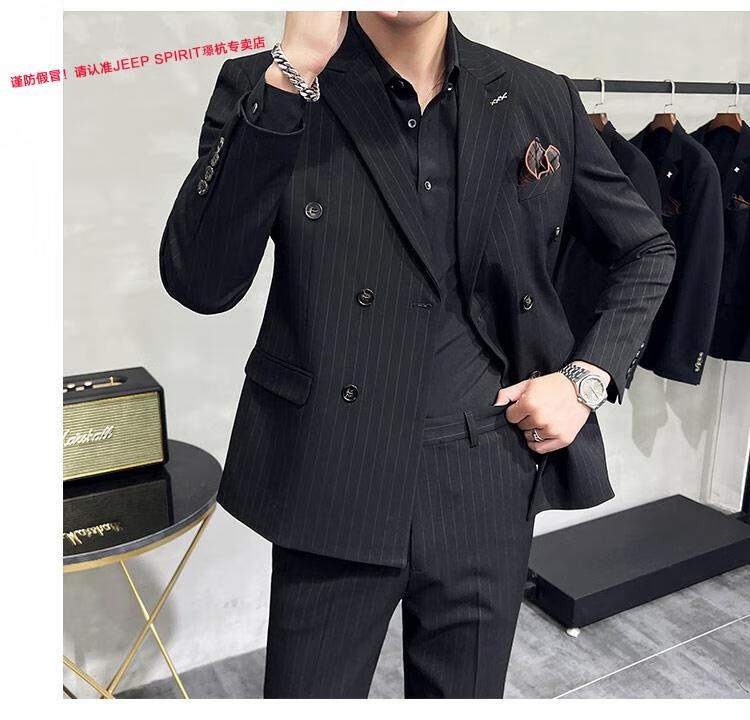 JEEP SPIRIT Jeep Double Breasted Suit Men's Suit Suit Autumn Men's Striped Casual Suit Men's Business Formal Wear Groom Dinner Black (Suit+Trousers+Vest) XL 52 125-140 Jin Jin is equal to 0.5 kg