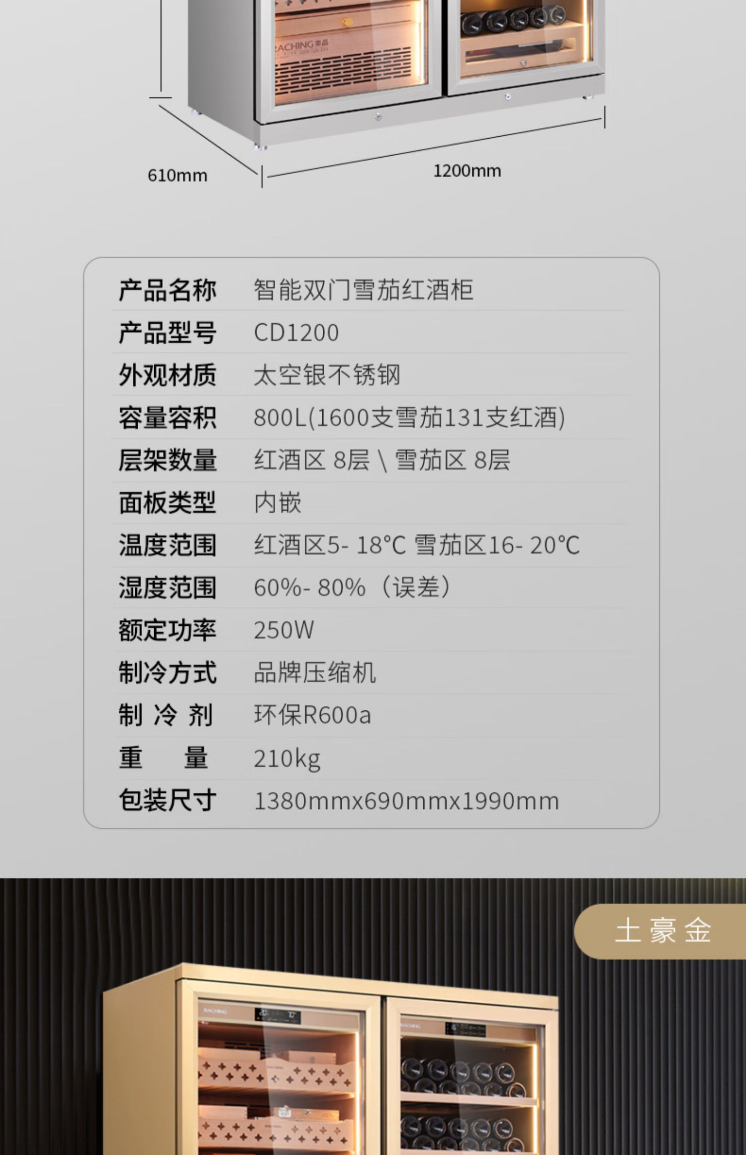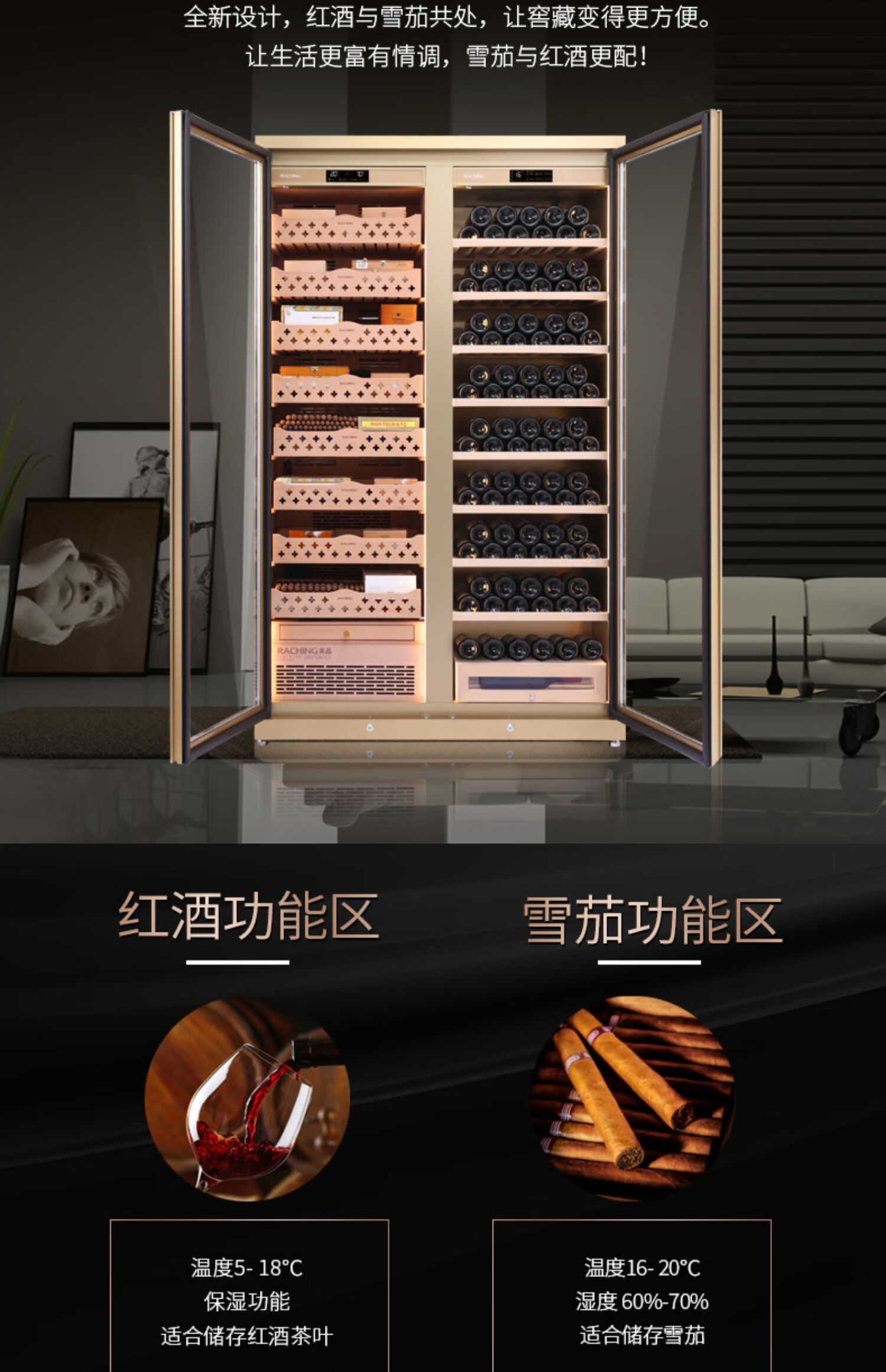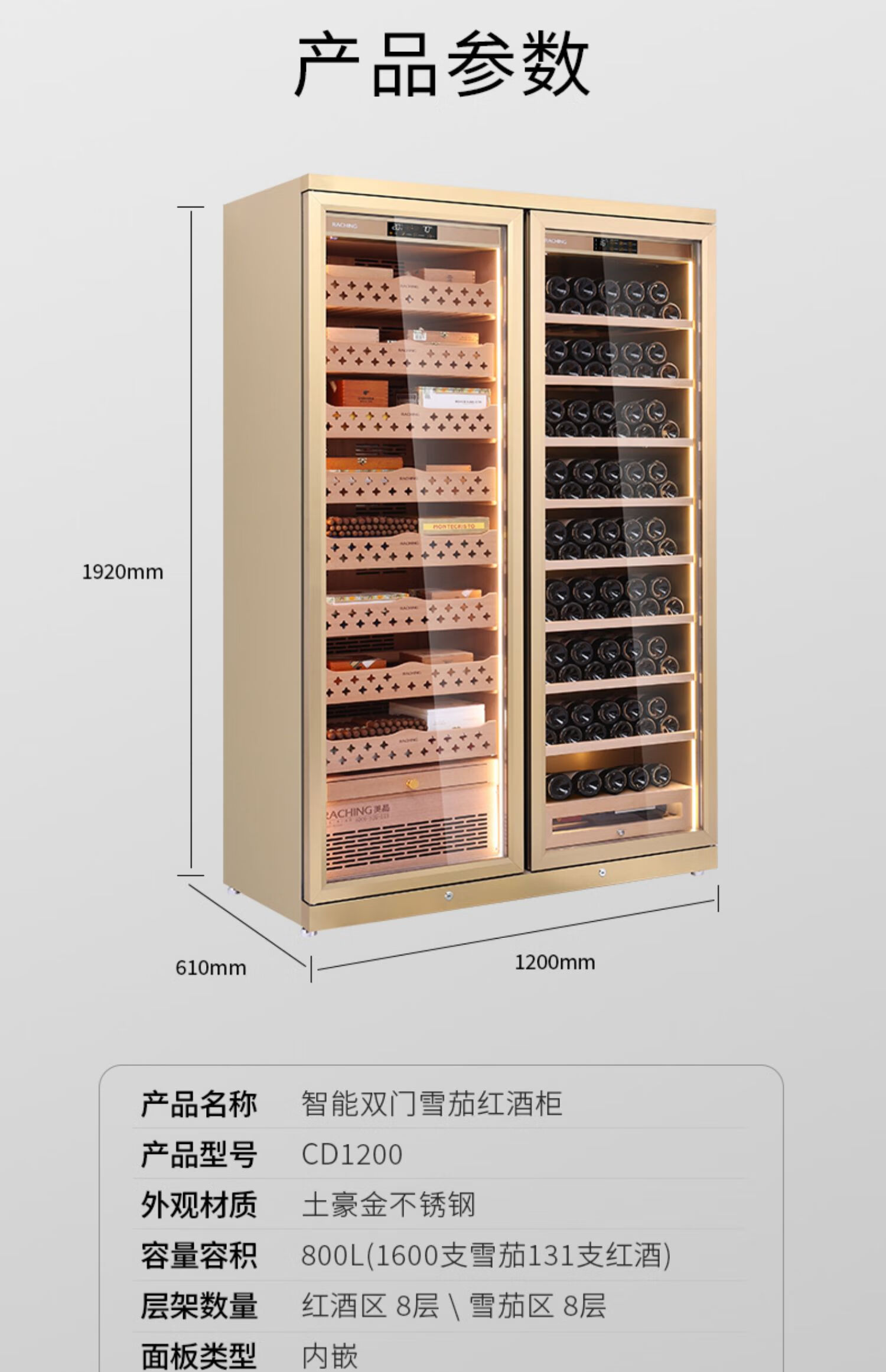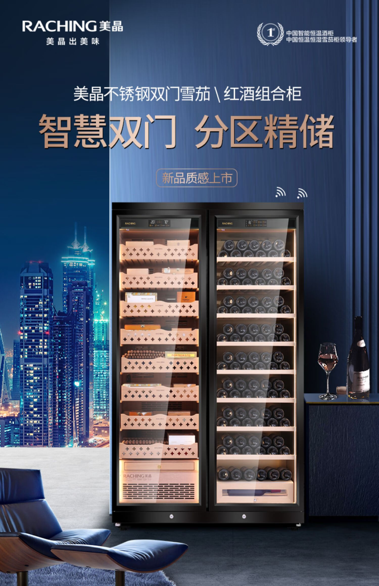 Meijing Raching/Meijing Red Wine + Cigar Combination Cabinet CD1200 Stainless Steel Old Cannon Double Door Constant Temperature and Humidity Compressor Humidity Cabinet Tuhaojin-Double Door Cigar Cabinet
