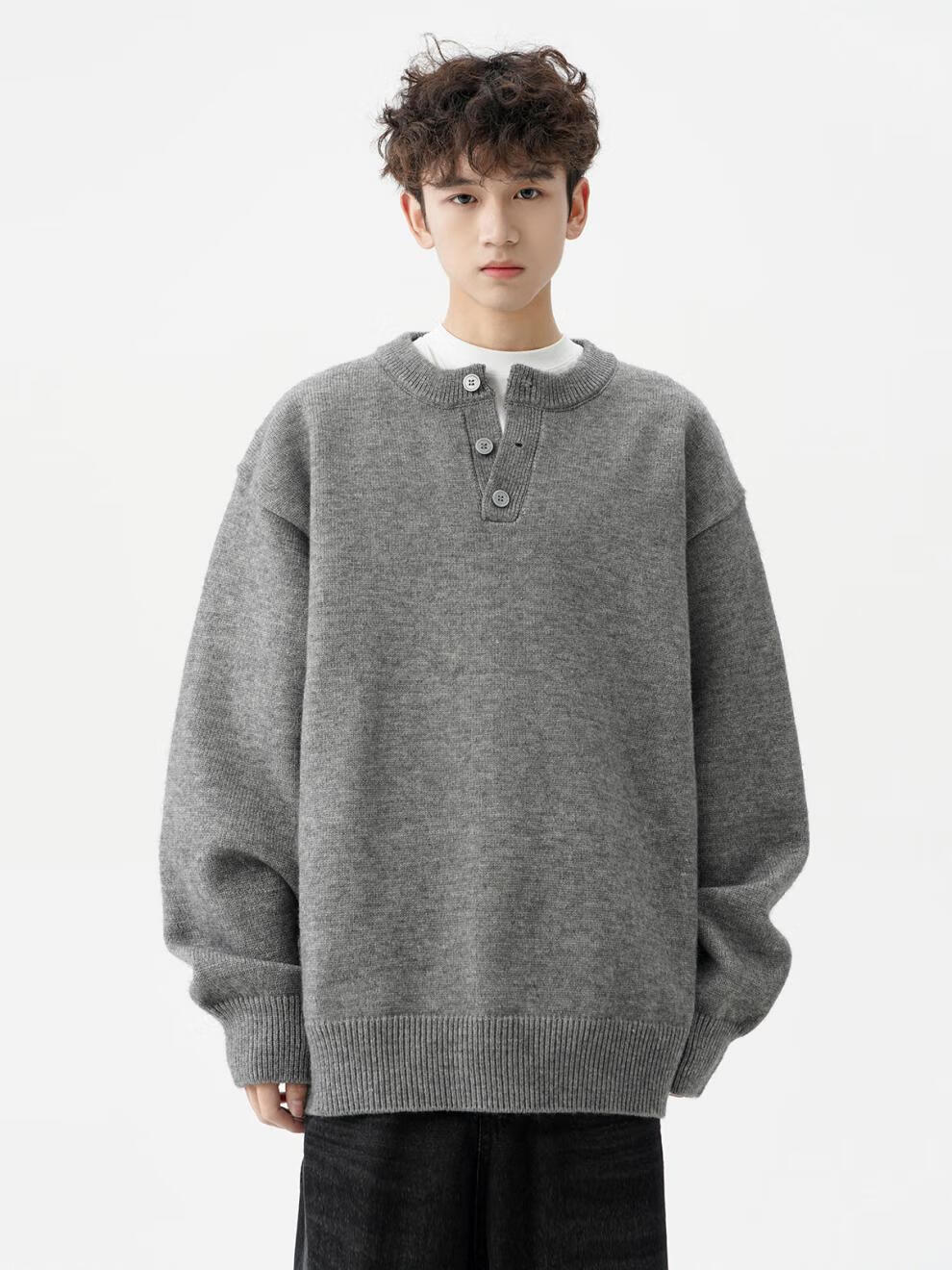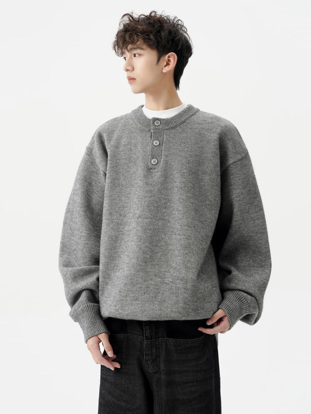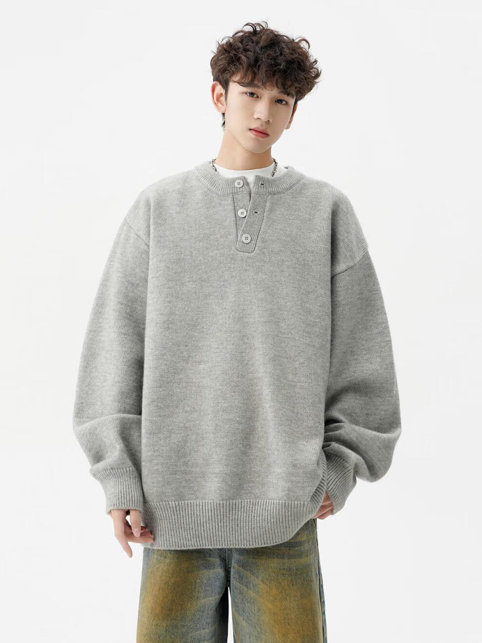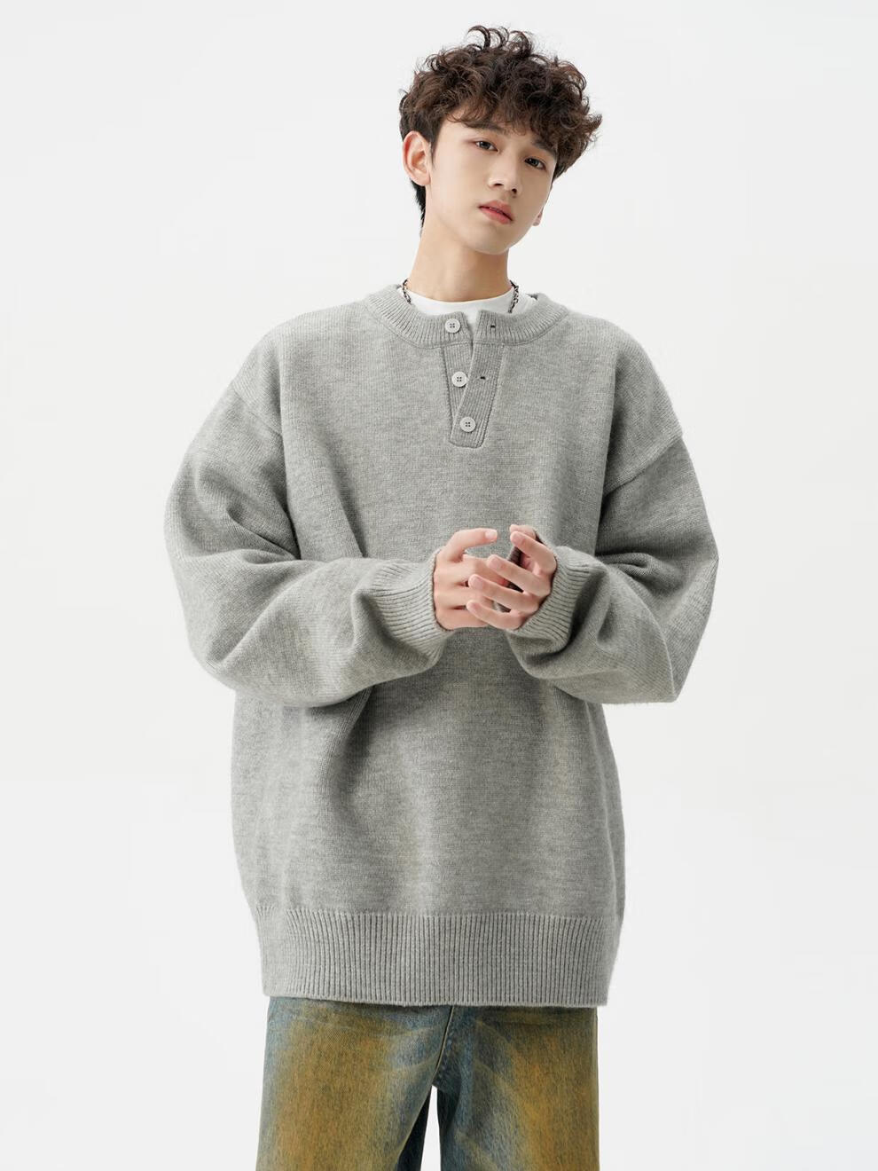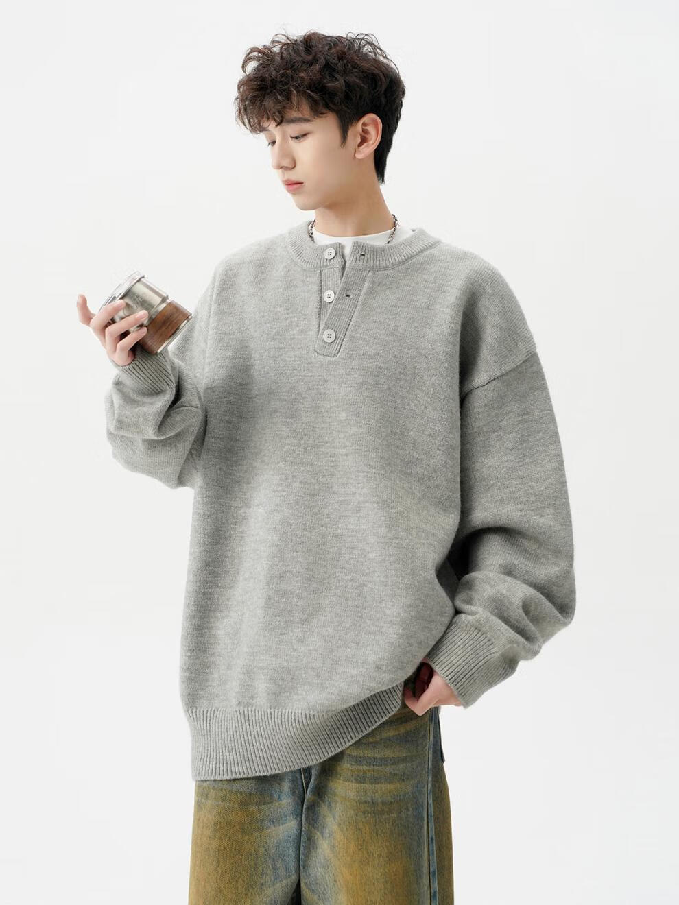 Playboy (PLAYBOY) American solid color Henry collar sweater men's autumn and winter new trendy brand-style sweater casual warm couple jacket light gray XL
