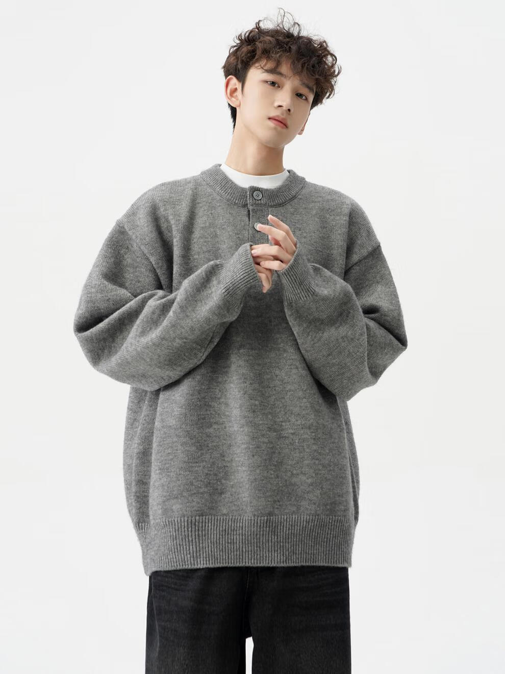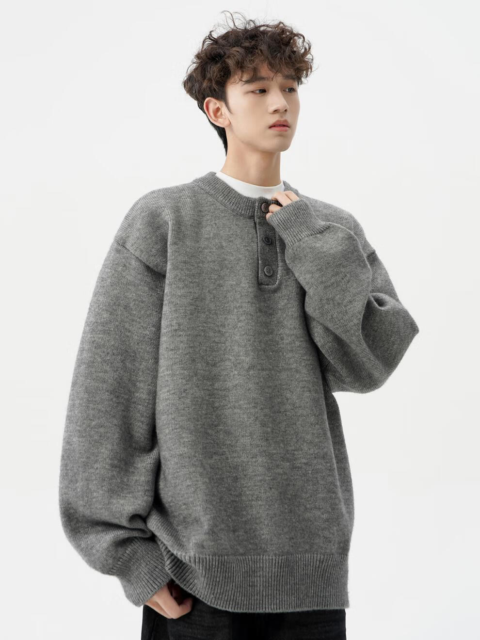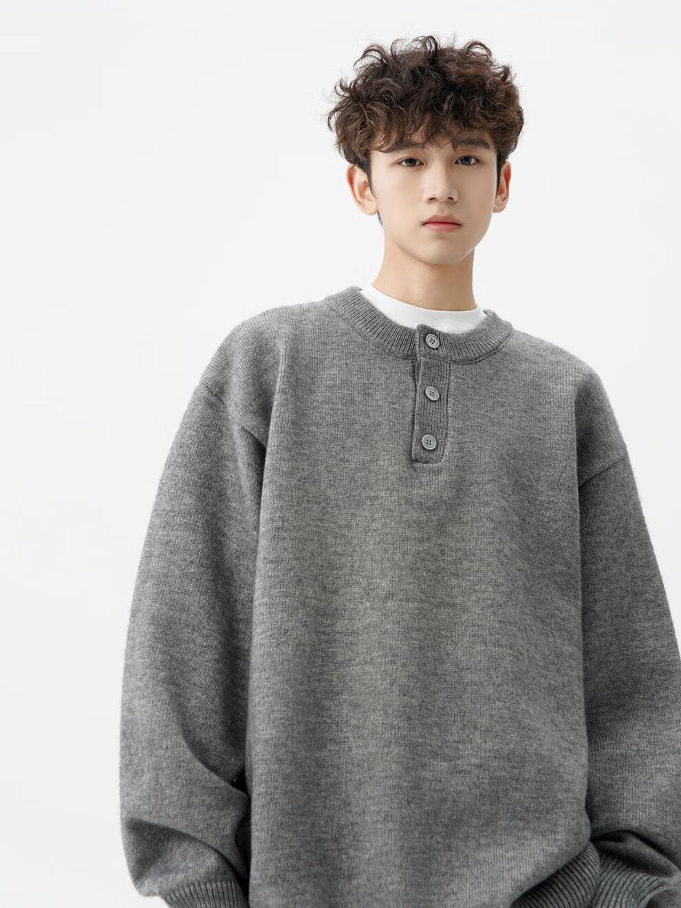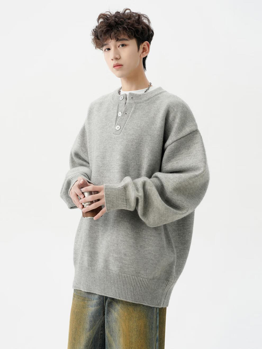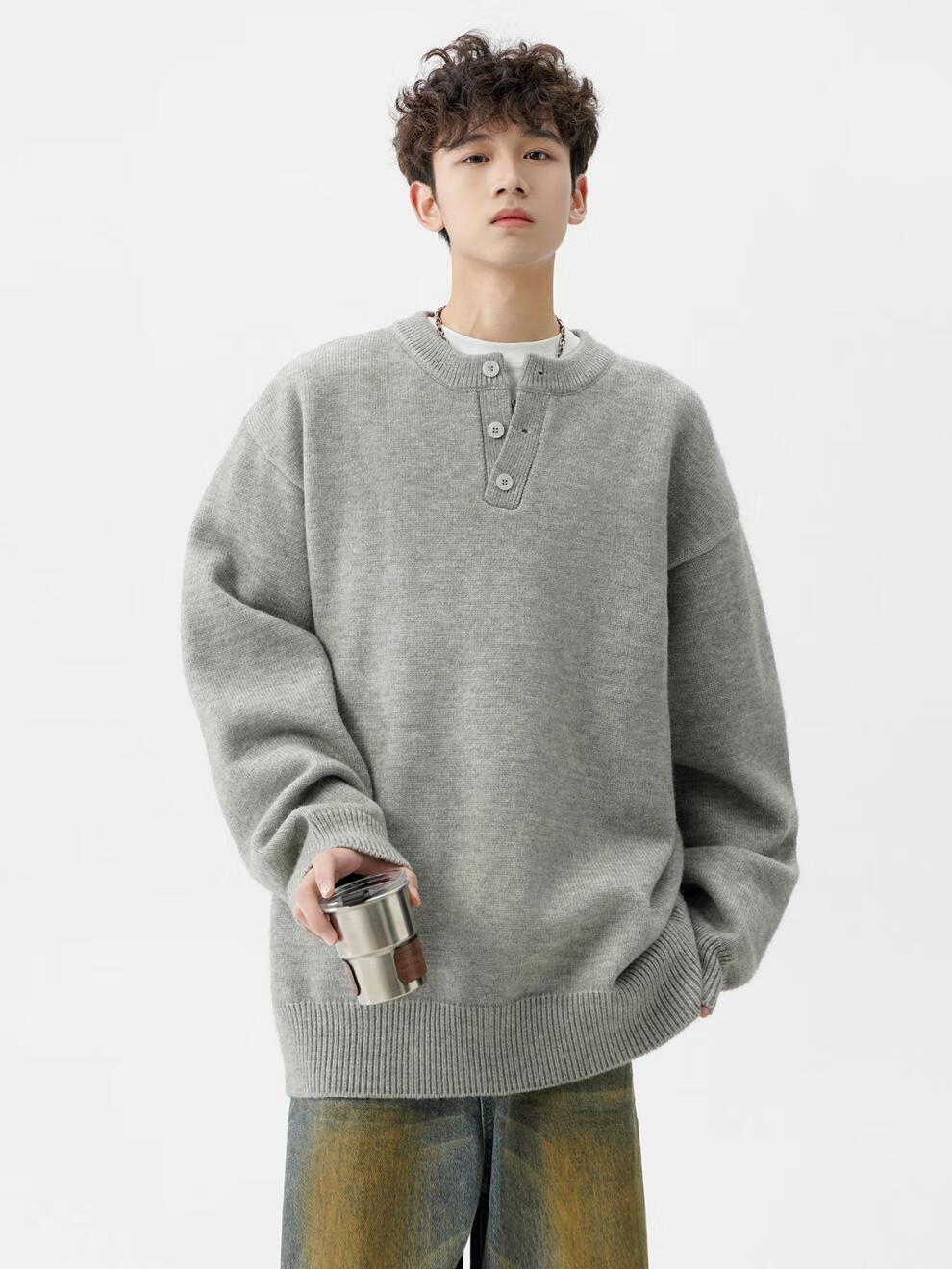 Playboy (PLAYBOY) American solid color Henry collar sweater men's autumn and winter new trendy brand-style sweater casual warm couple jacket light gray XL